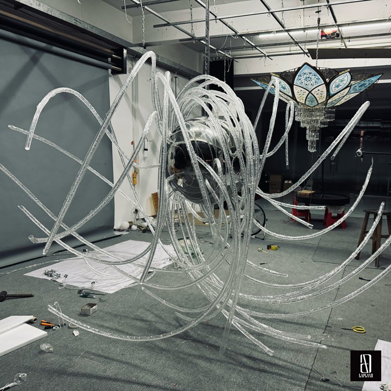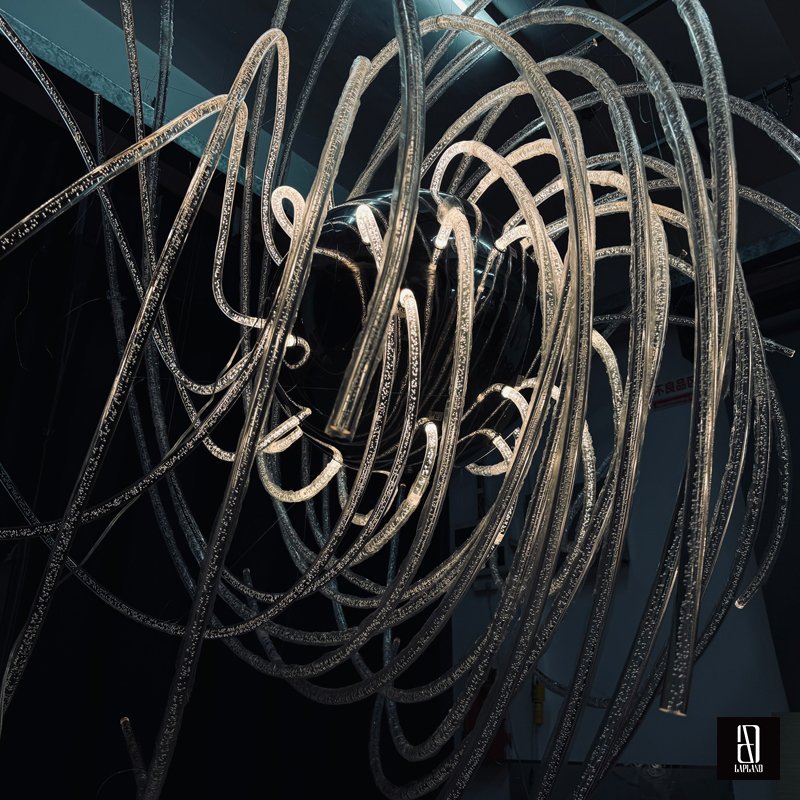 We use bubble acrylic as the light-guiding material and stainless steel in the central part of the fixture. The fusion of metal and acrylic creates a unique visual effect.