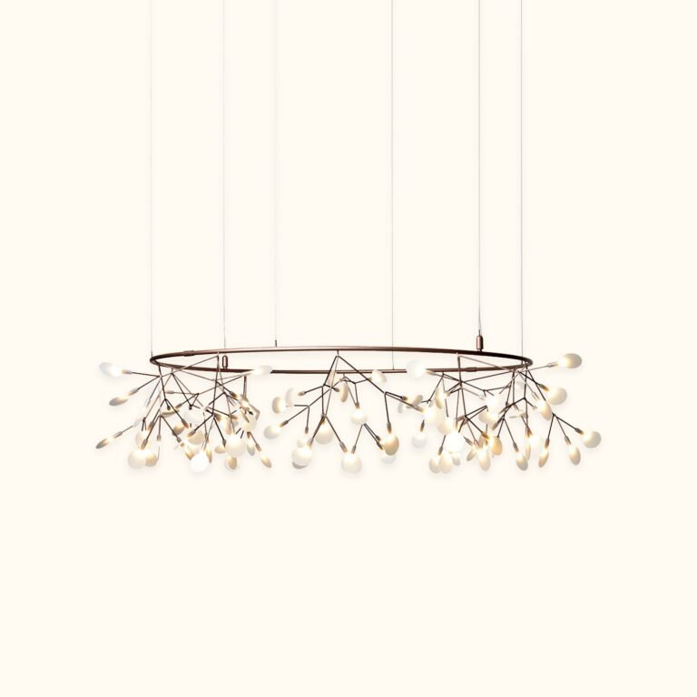 The Halo Jewel chandelier features linear and circular configurations, presenting light as a precious element. This series expresses the concept