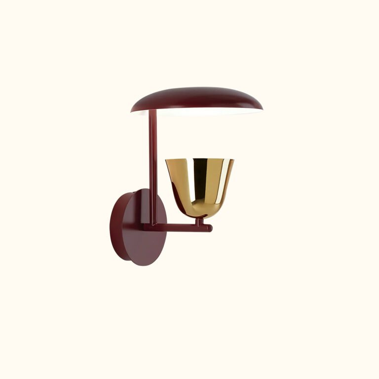 IP20 rated wall light fitting for indoor use, made of painted aluminum or oxidized brass. The fixture features a splayed