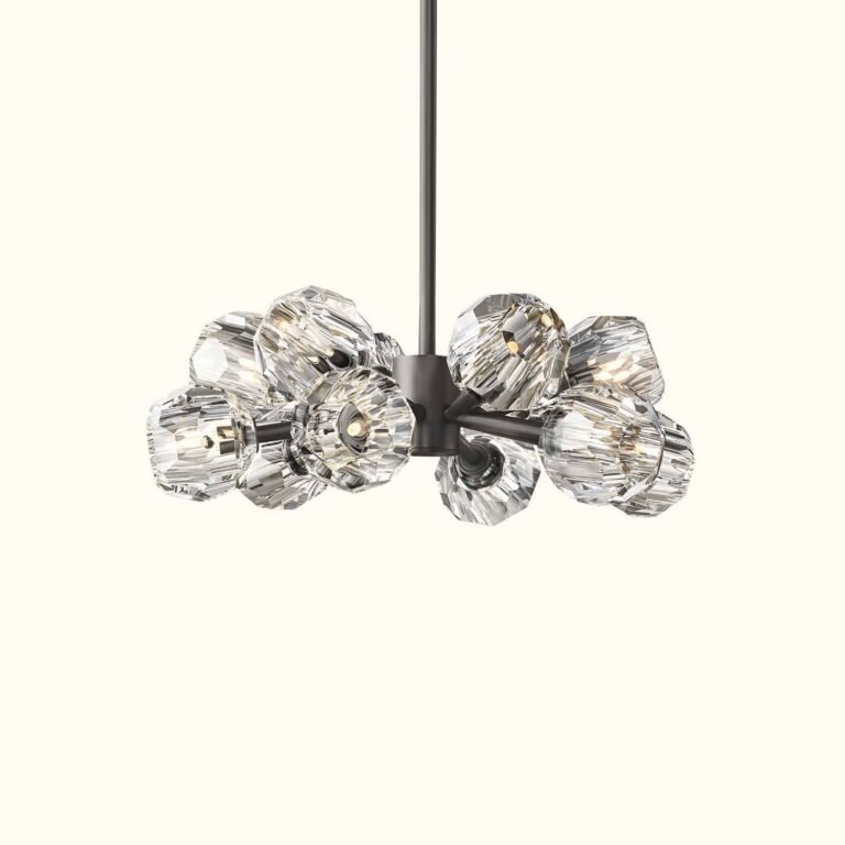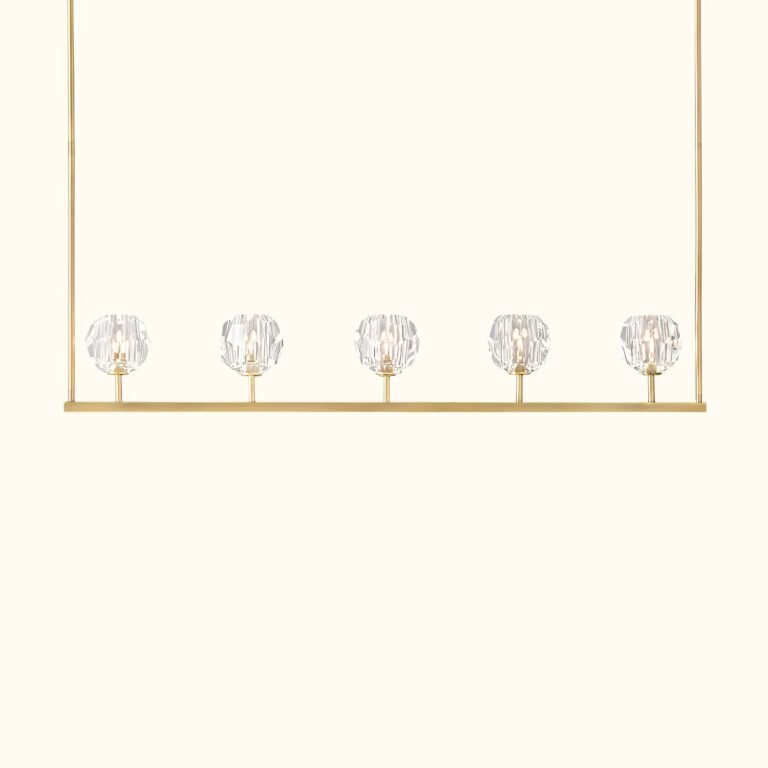 Designer Jonathan Browning’s sculptural fixture, crafted from solid brass and crystal glass, exemplifies his dedication to luxurious materials and exceptional