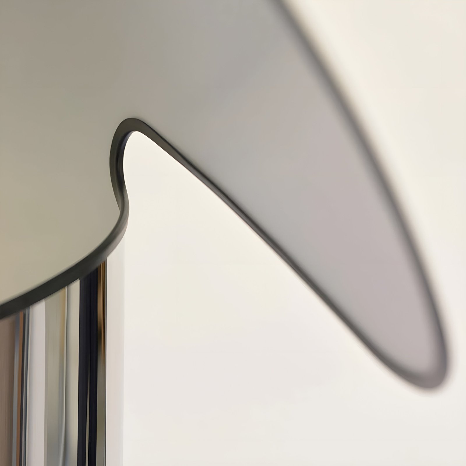 This floor lamp is composed of a reflecting body made of laser-cut stainless steel, finished internally with an opaque white plastic film and folded and closed using hooks formed directly from the sheet metal. A black extruded TPU seal runs along the entire profile of the body. The internal painted steel base is attached to the body for stability and also supports the bulb socket.