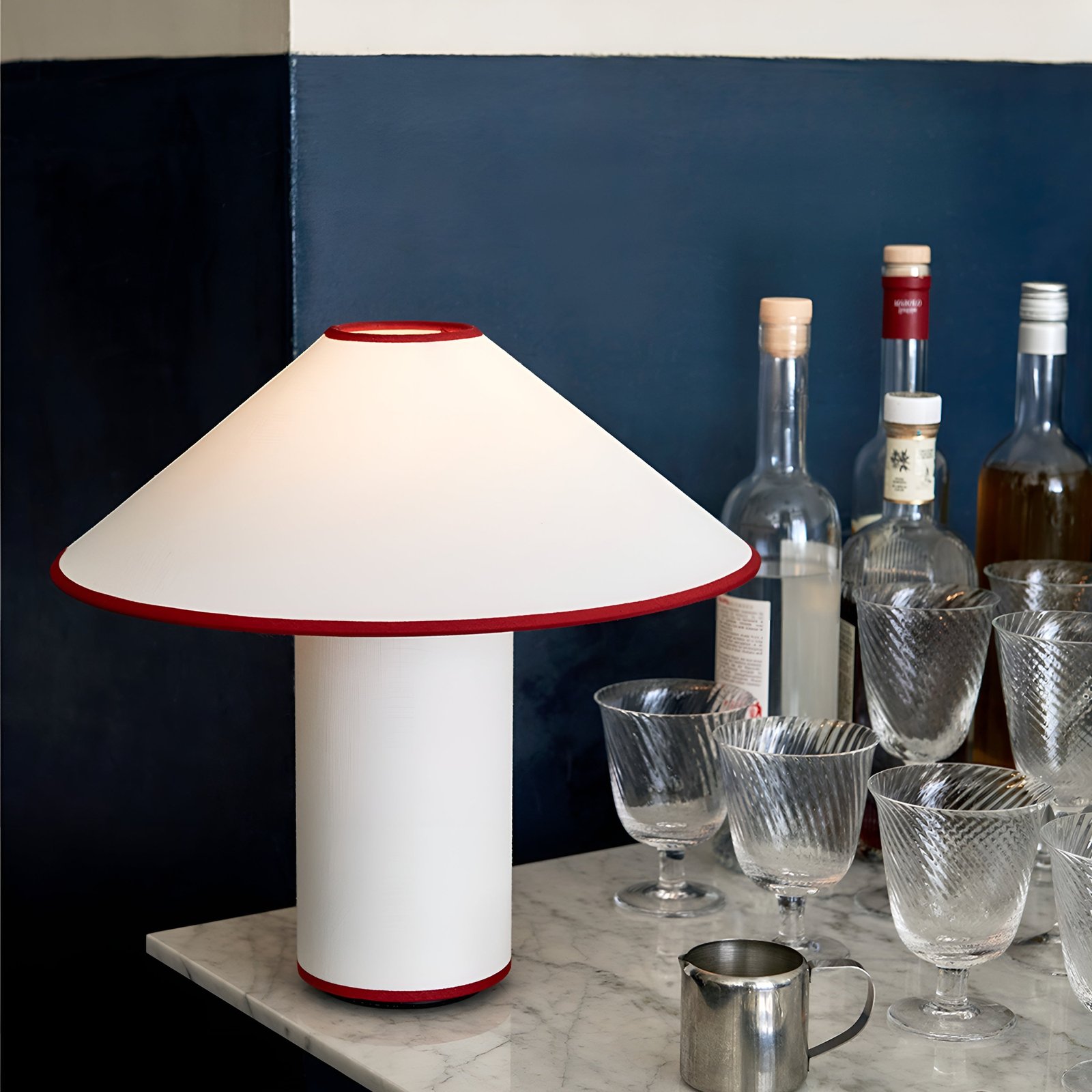 This lamp is a modern interpretation of fabric lighting, featuring a tactile quality in its materials and a keen eye for form. It is a truly unique piece, with its classic charm enhanced by contrasting color trim that highlights the framework of the shade and base.