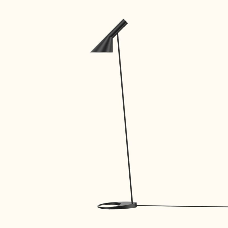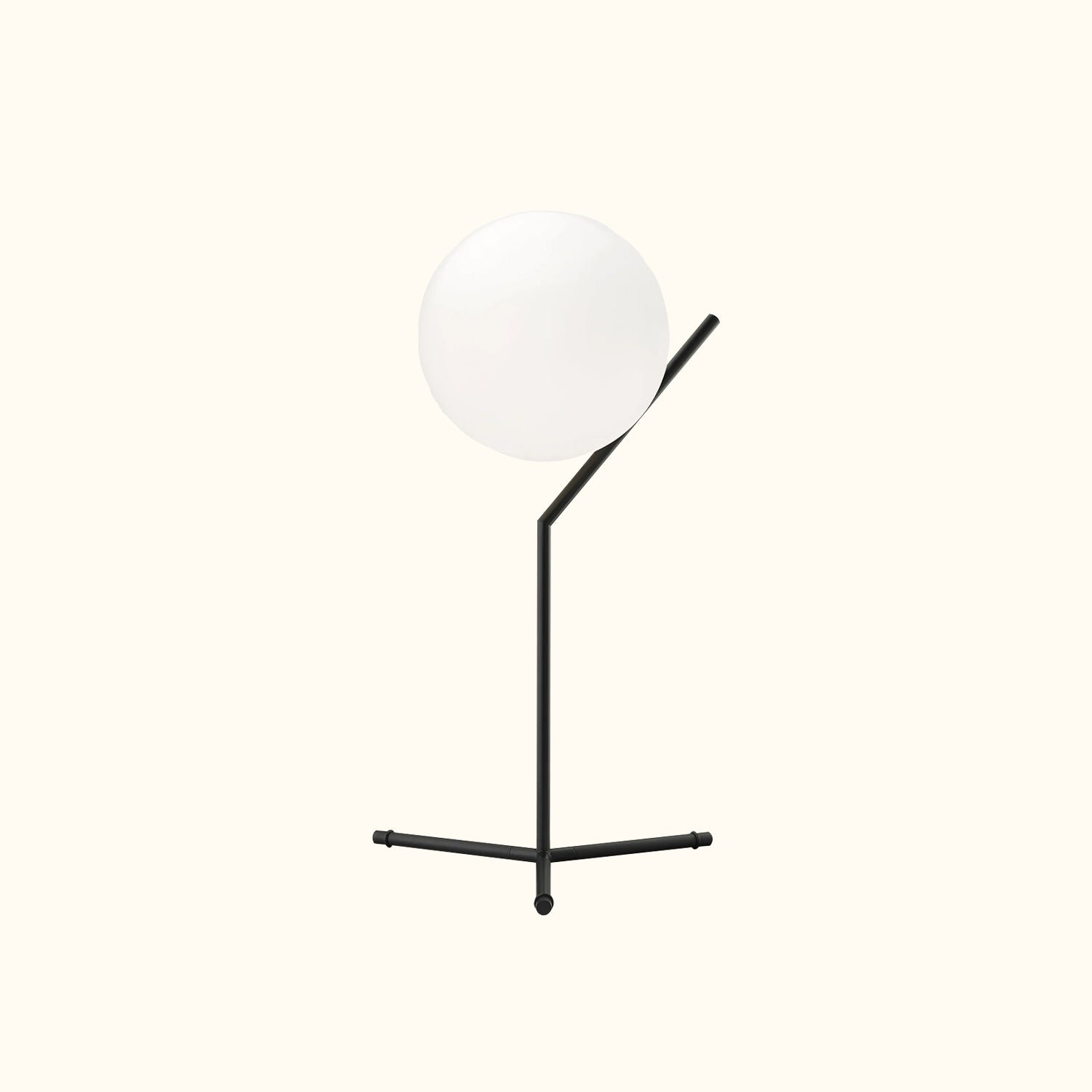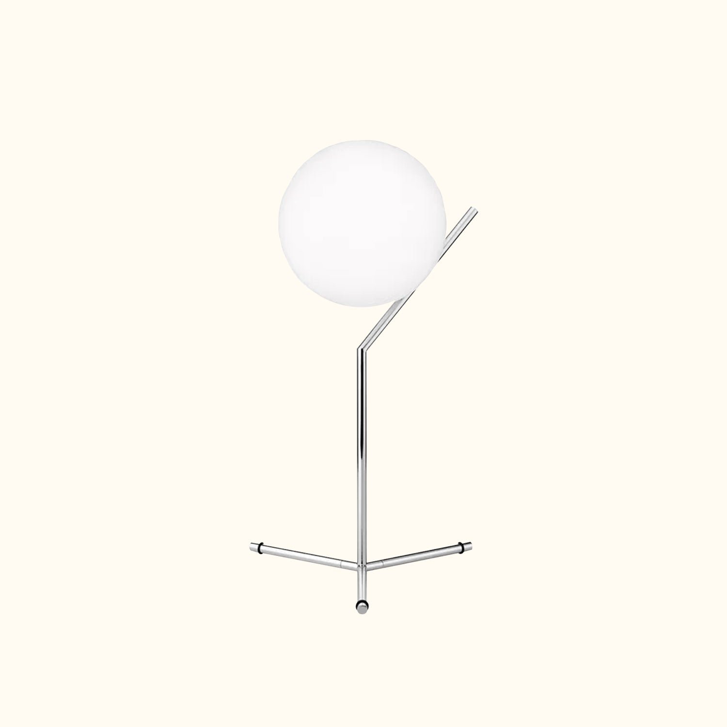 This is a table lamp that provides diffused light. The frame is made of brass, with a brushed finish and transparent varnish, or chrome steel and black. It features a blown opal glass diffuser. There is a dimmer on the power cord.