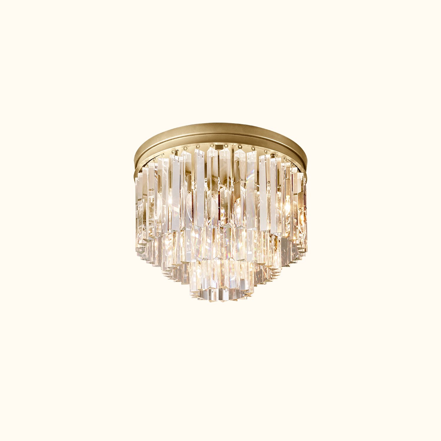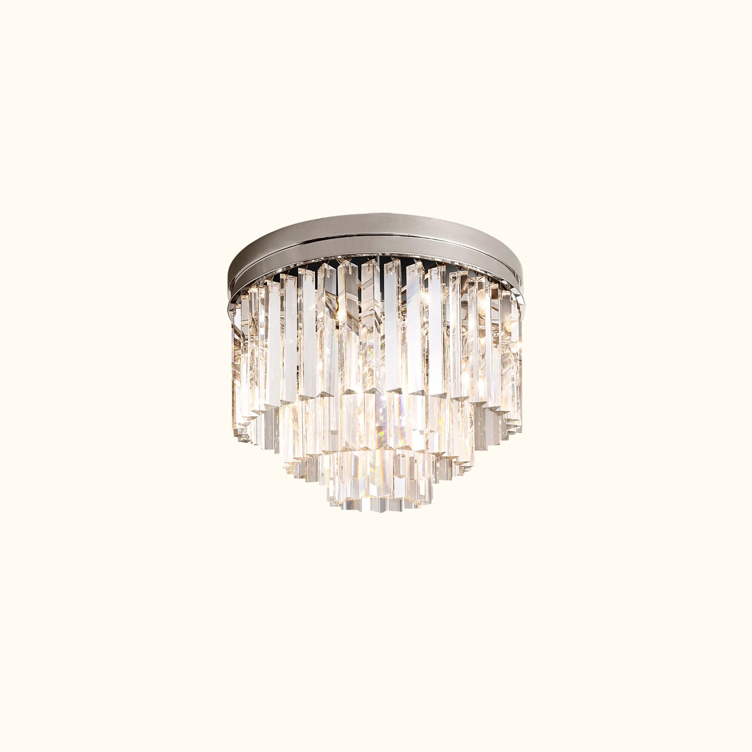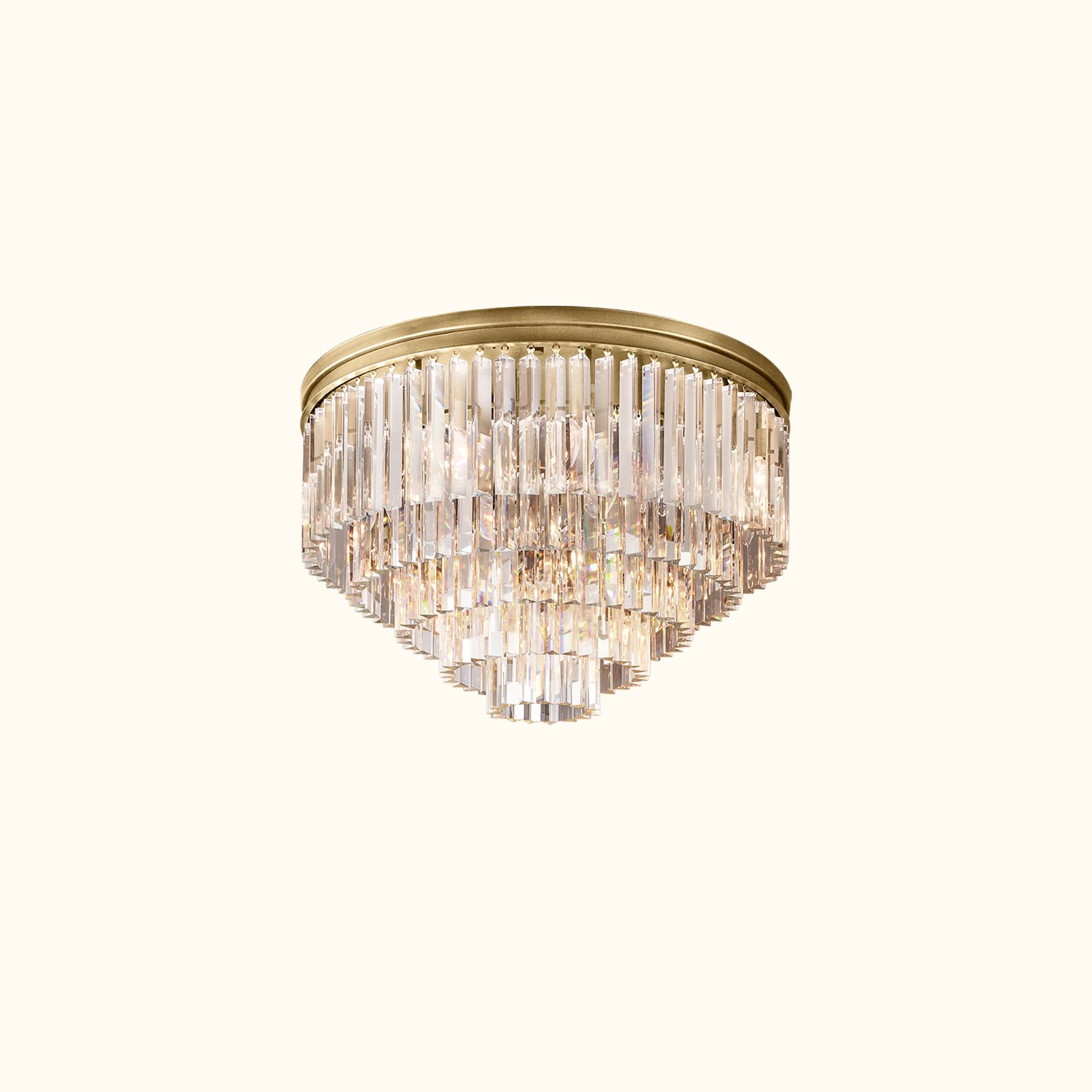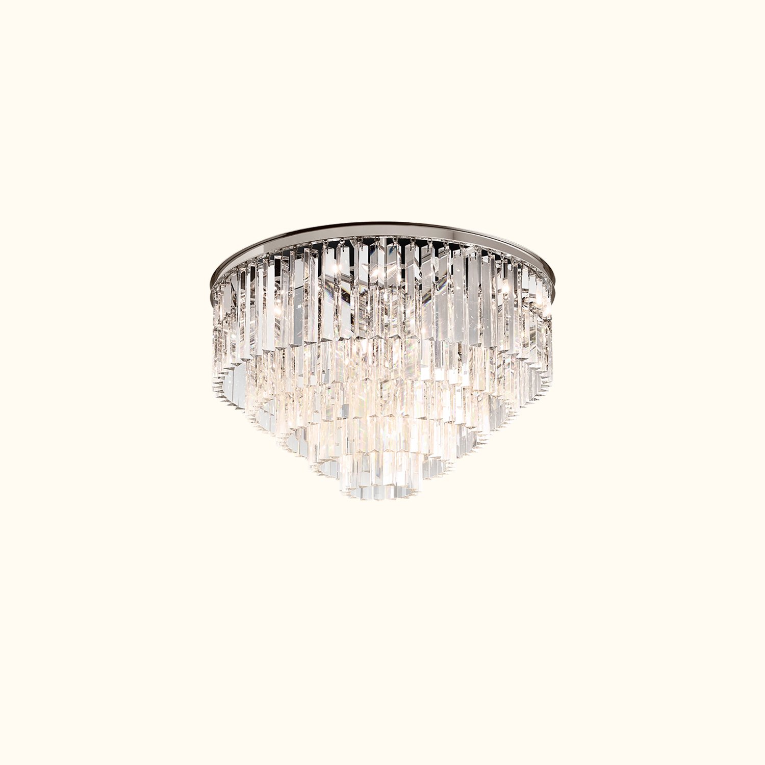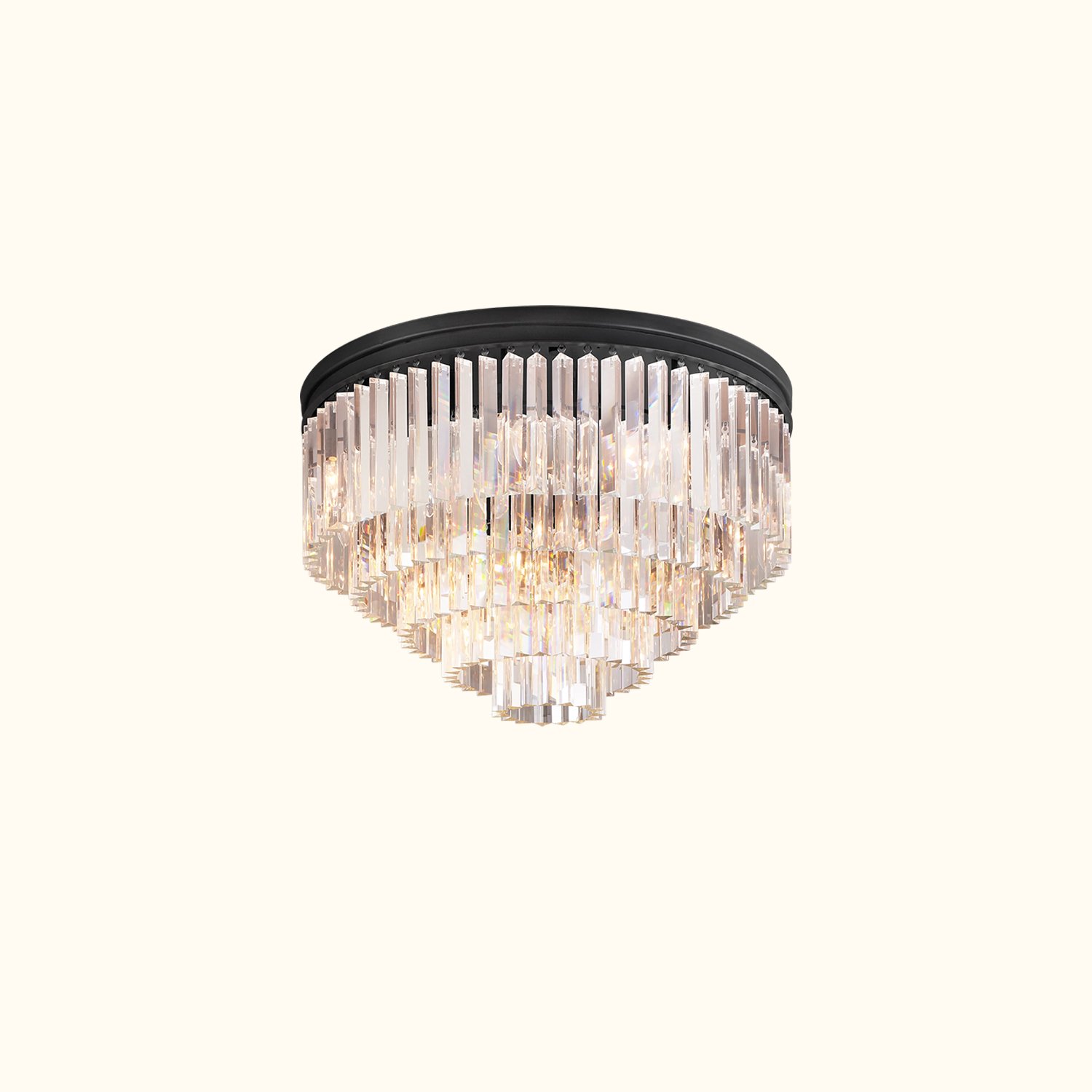 This series of works is inspired by the Art Deco style of 1920s Paris, capturing the era’s fascination with geometric forms. Hundreds of dynamic, multifaceted prisms cleverly refract light, evoking the charm of that time. The sharply defined glass hangs like luxurious tassels from a welded iron frame, perfectly blending elegance with an industrial aesthetic.