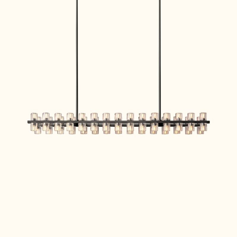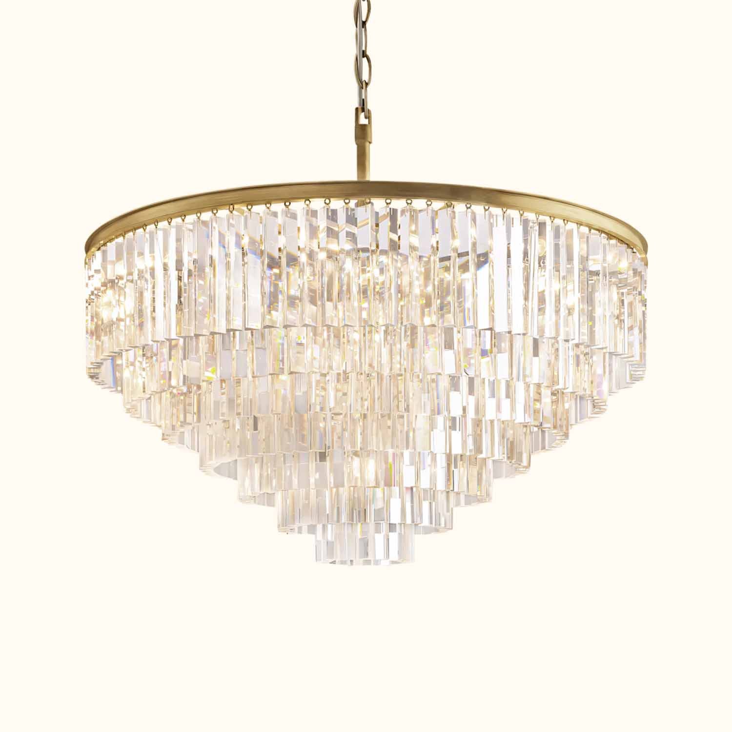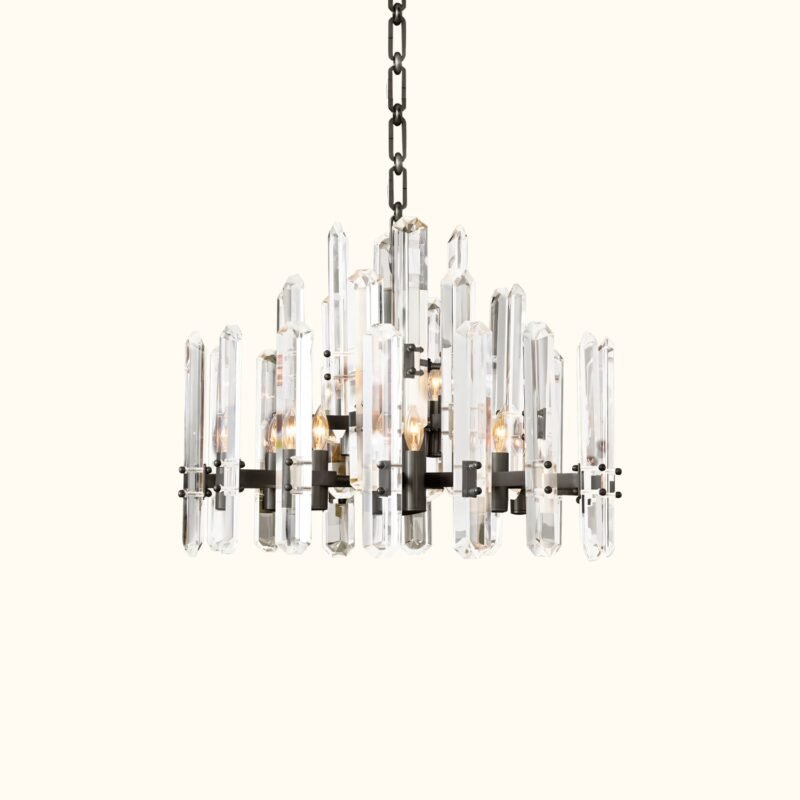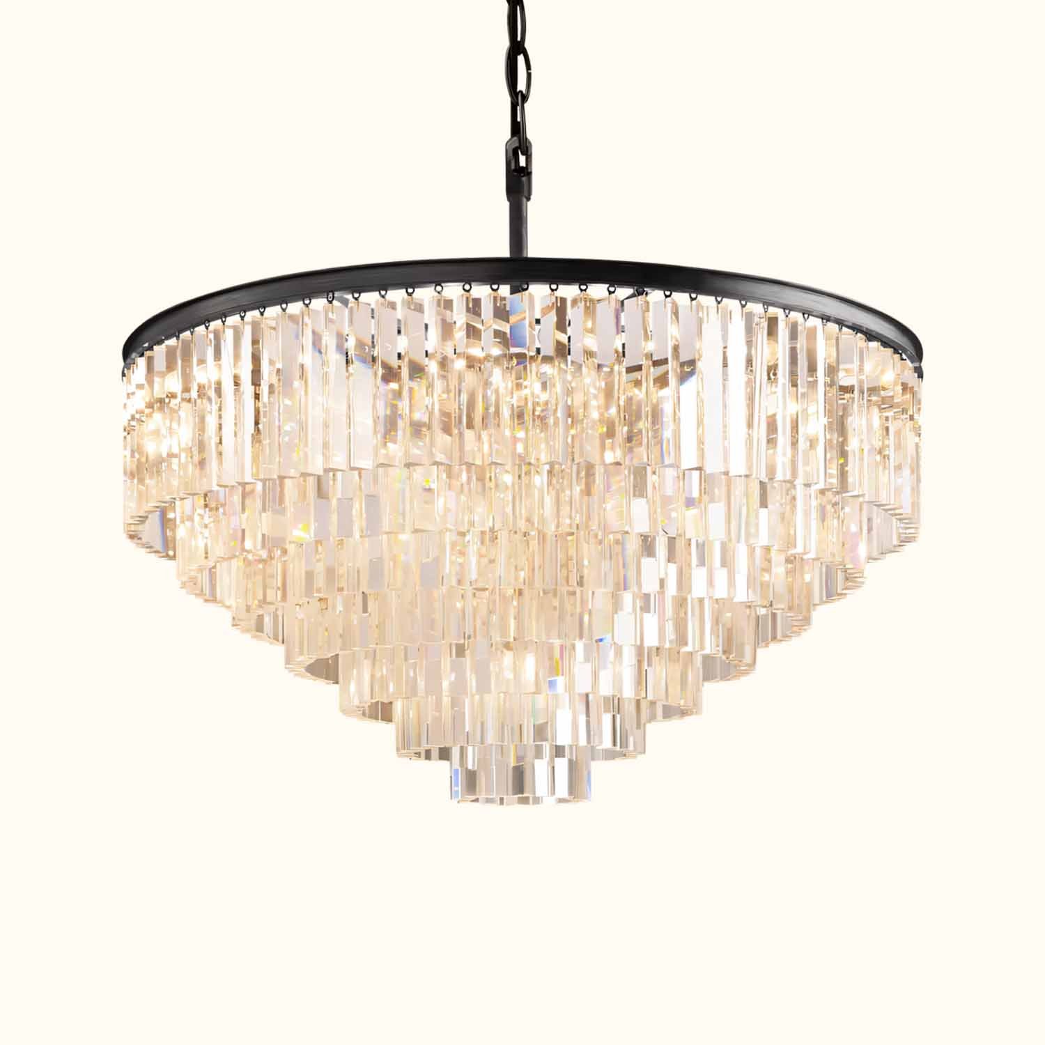 Inspired by the Art Deco style of 1920s Paris, our Timothy Oulton collection captures the era’s fascination with geometric shapes. Hundreds of finely cut, dynamic prisms masterfully refract light, evoking the allure of that time. The angular glass hangs like lush fringe from a welded iron frame, perfectly blending elegance with industrial style.