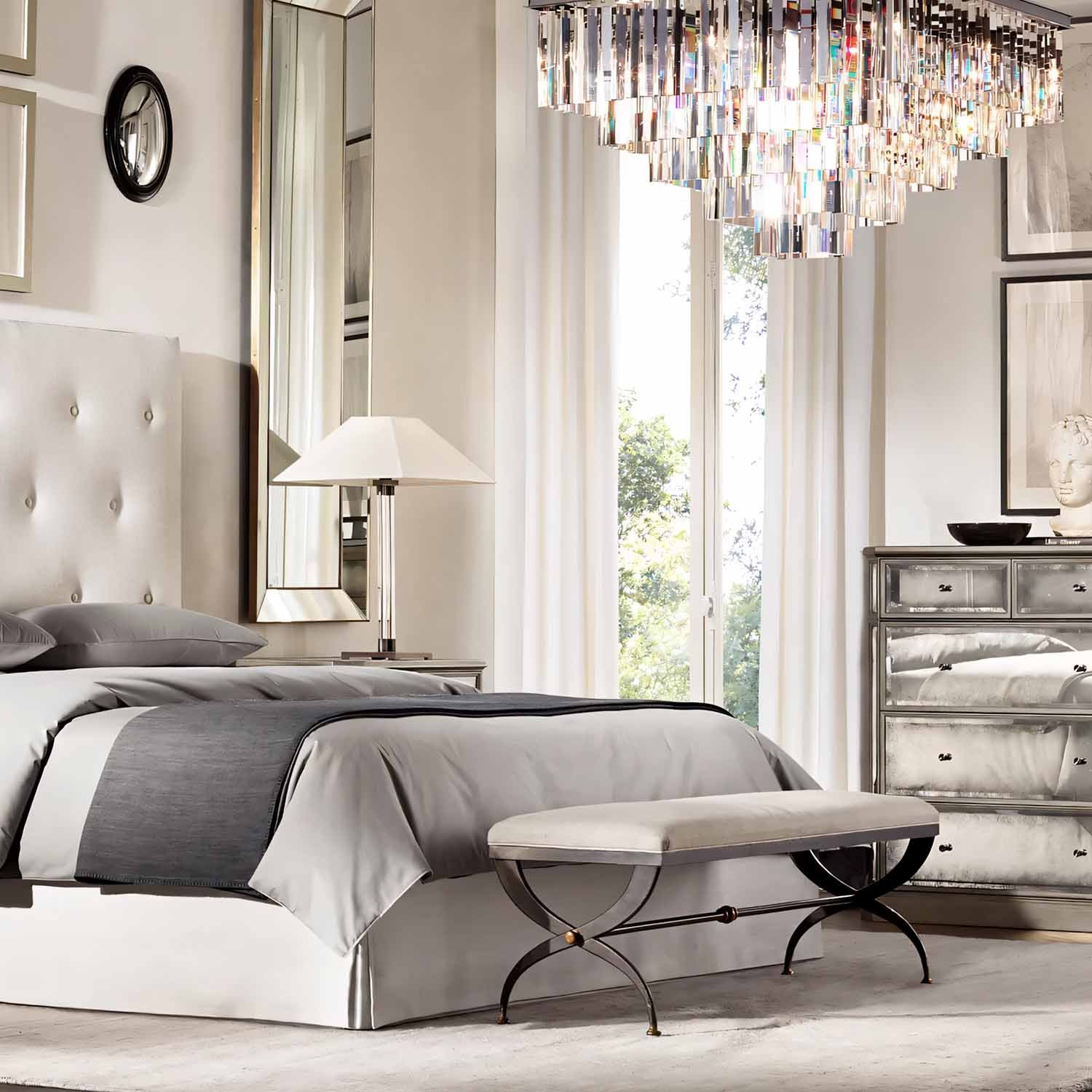 Inspired by the Art Deco style of 1920s Paris, our collection from Timothy Oulton captures the period’s fascination with geometric forms. Masterfully refracting the light, hundreds of faceted, dynamic prisms evoke the allure of the era. Hanging like lush fringe from a welded iron frame, the angular glass juxtaposes elegance and industrialism.