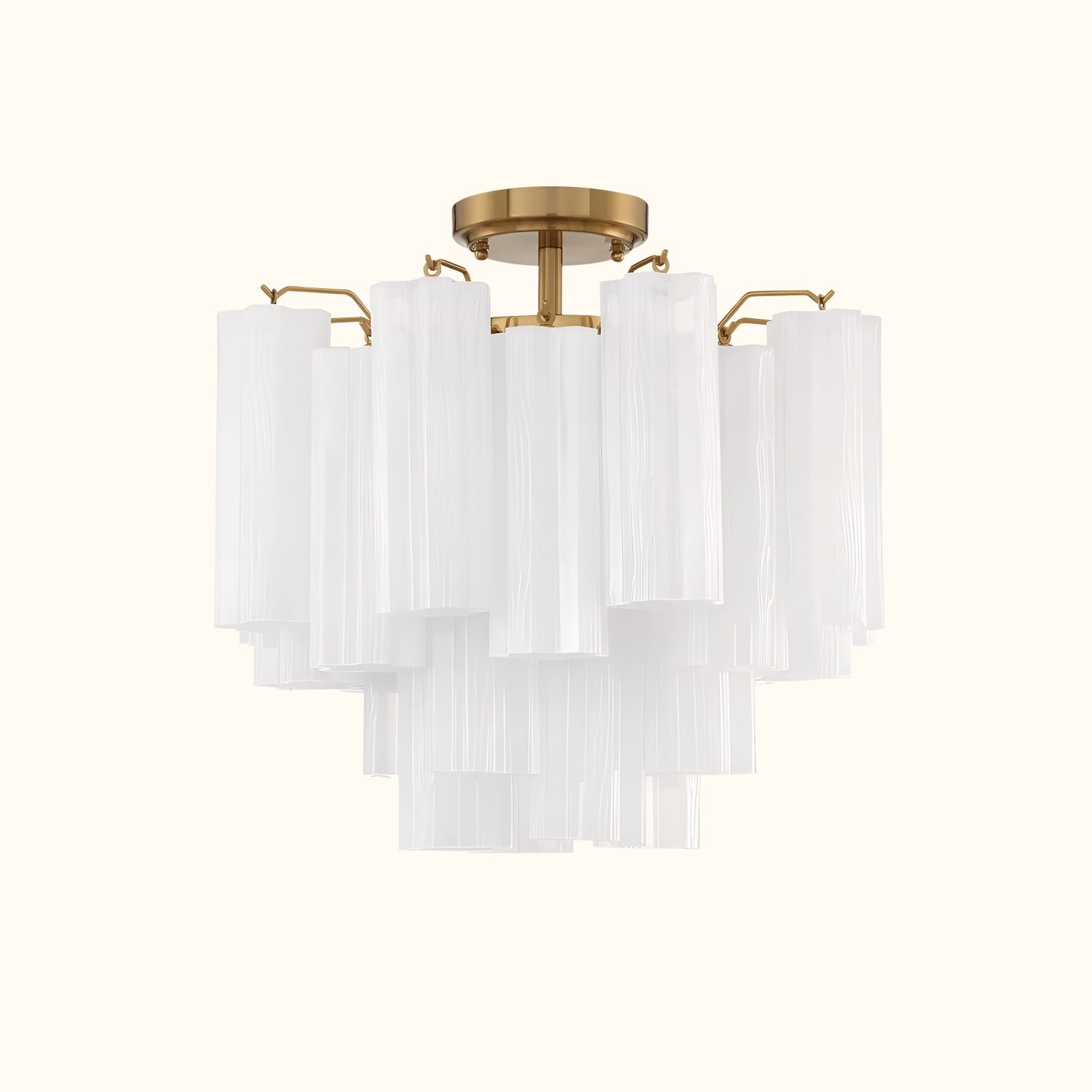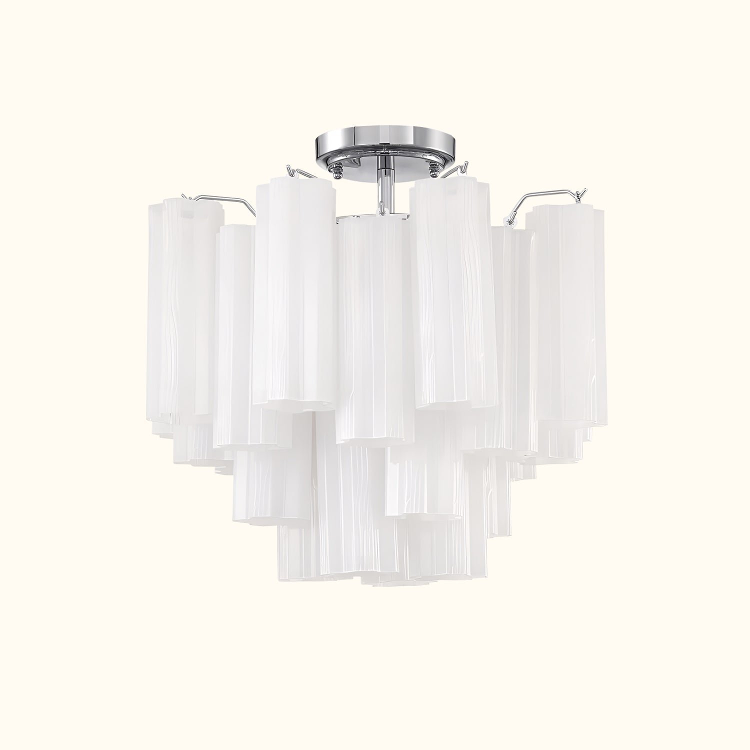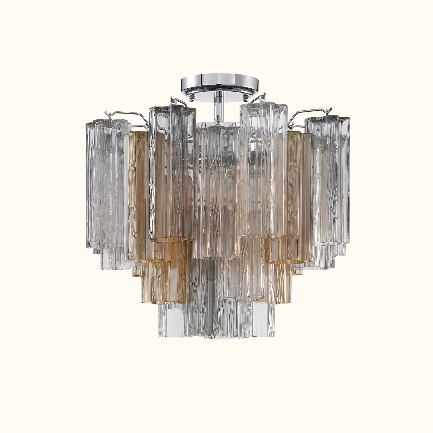 The charming lighting series is a modern interpretation of the iconic mid-century chandelier. Inspired by the fluid lines and geometric shapes of its predecessor, this series features a polished chrome or antique bronze metal frame that exudes sophistication and style. Its unique design showcases transparent textured glass tubes arranged in a captivating five-pointed star shape. A variety of glass colors are available, including clear, amber, smoke, and white, as well as stunning autumn options with a delightful mix of amber, clear, and smoke glass. The lighting series offers various sizes and finishes, allowing you to find the perfect match for your space while adding a touch of timeless elegance.