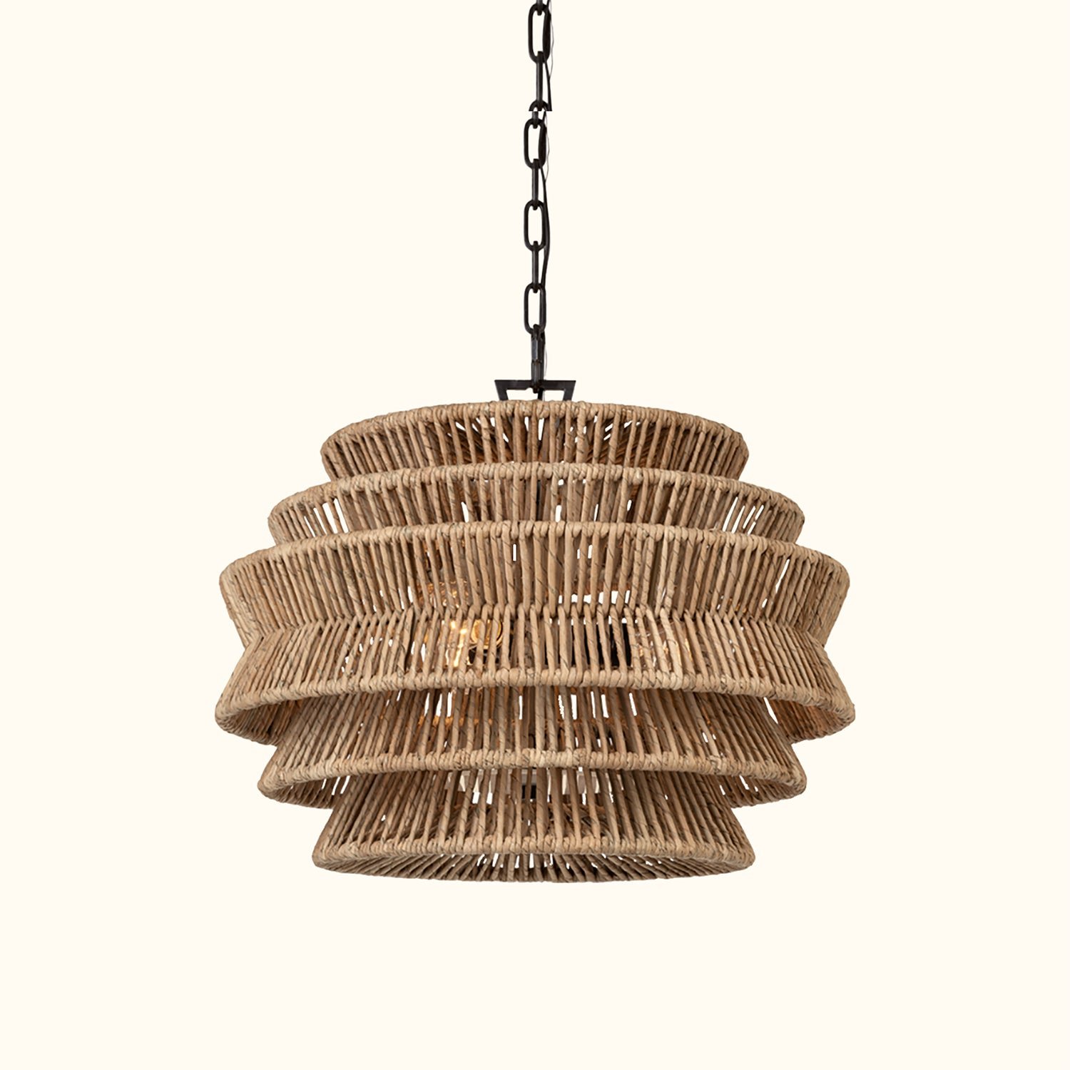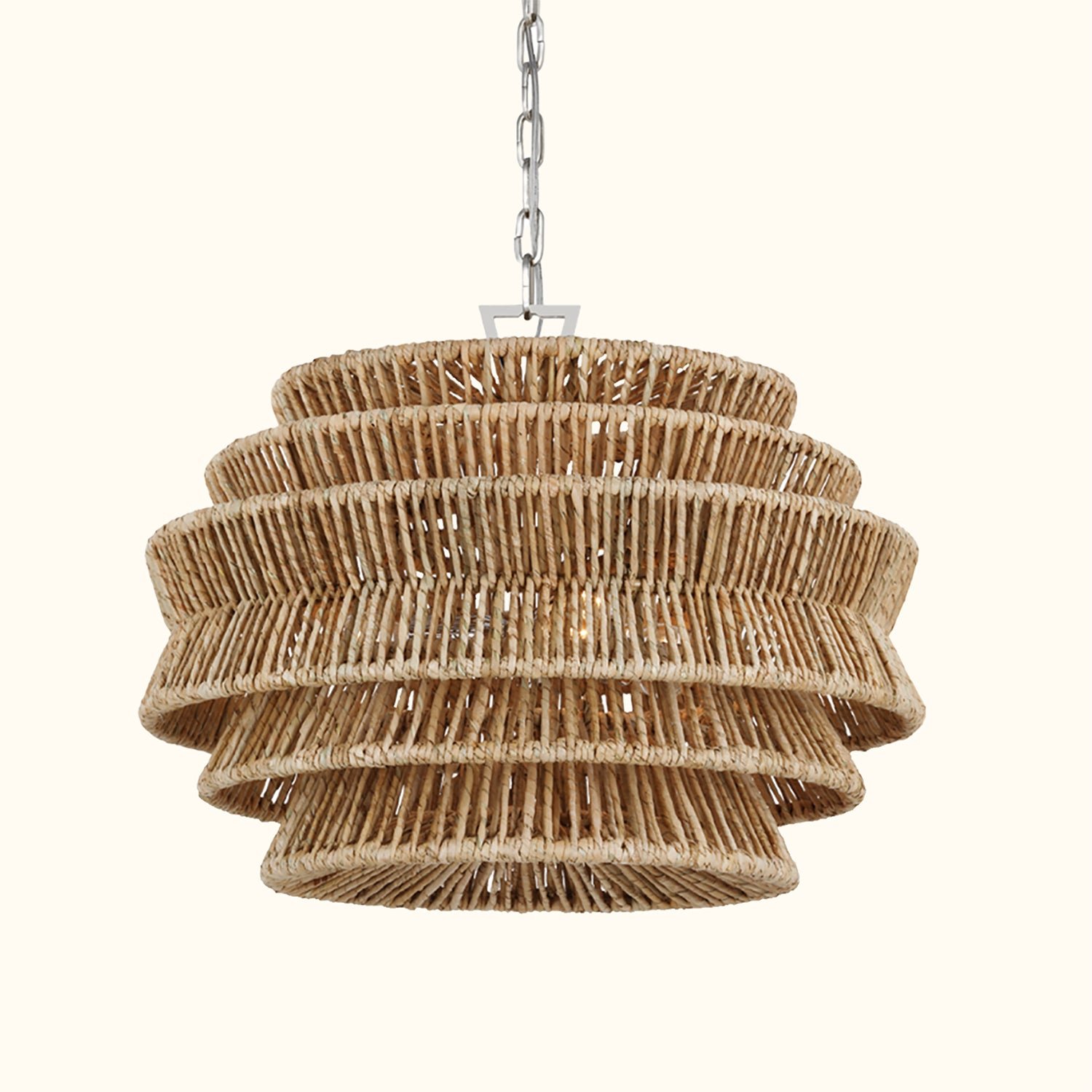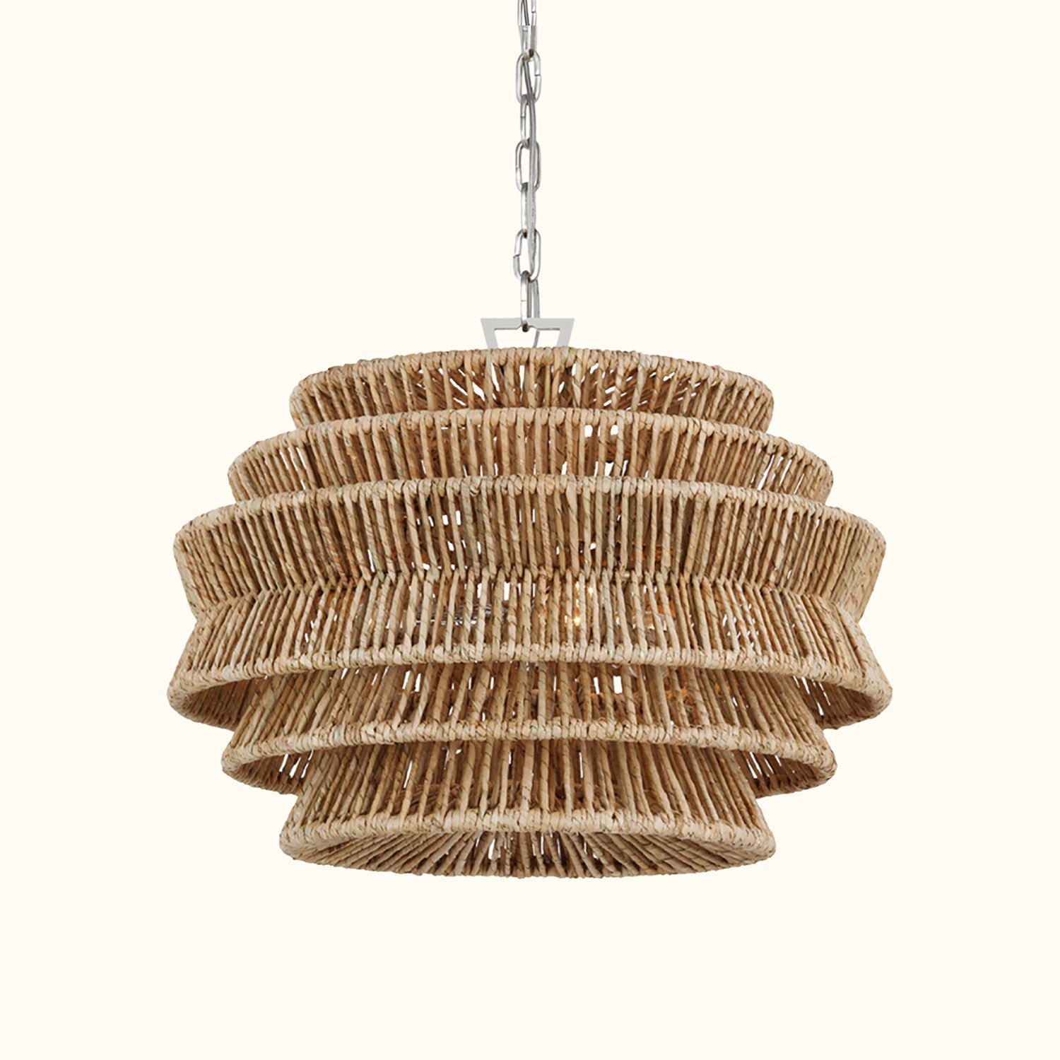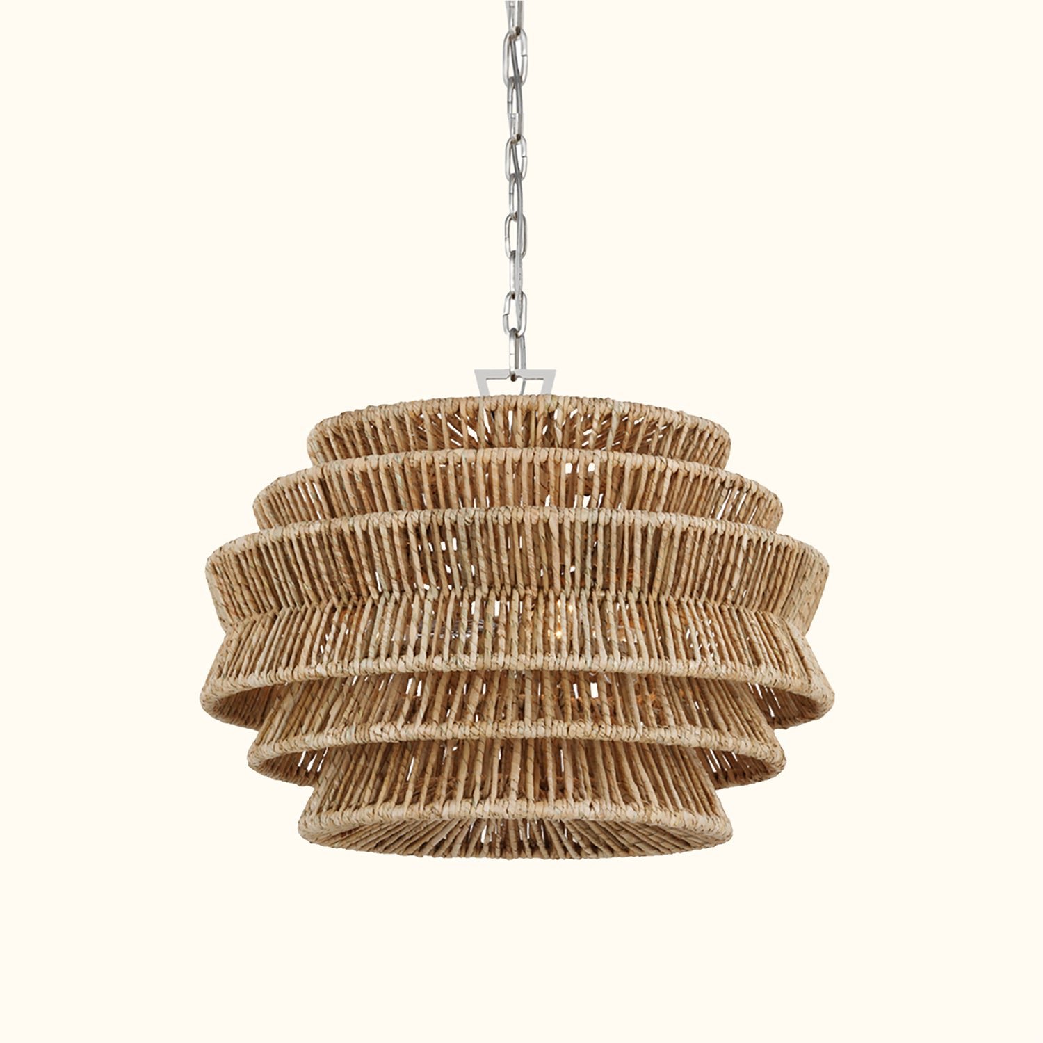 The Antigua Drum Chandelier showcases meticulous craftsmanship and a nature-inspired aesthetic. Its expansive drum-shaped shade features a tiered design and is handcrafted with natural abaca fibers. Multiple LEDs emit a soft glow through the angled frame, creating a light effect reminiscent of sunlight filtering through palm leaves.The organic texture and subtle variations of the abaca add a unique, natural charm to the fixture, making each piece a one-of-a-kind addition to any space. With its damp-rated design, it is resistant to mild moisture, making it an ideal choice for patios and verandas, as well as indoor spaces that call for a touch of natural elegance and sophistication.