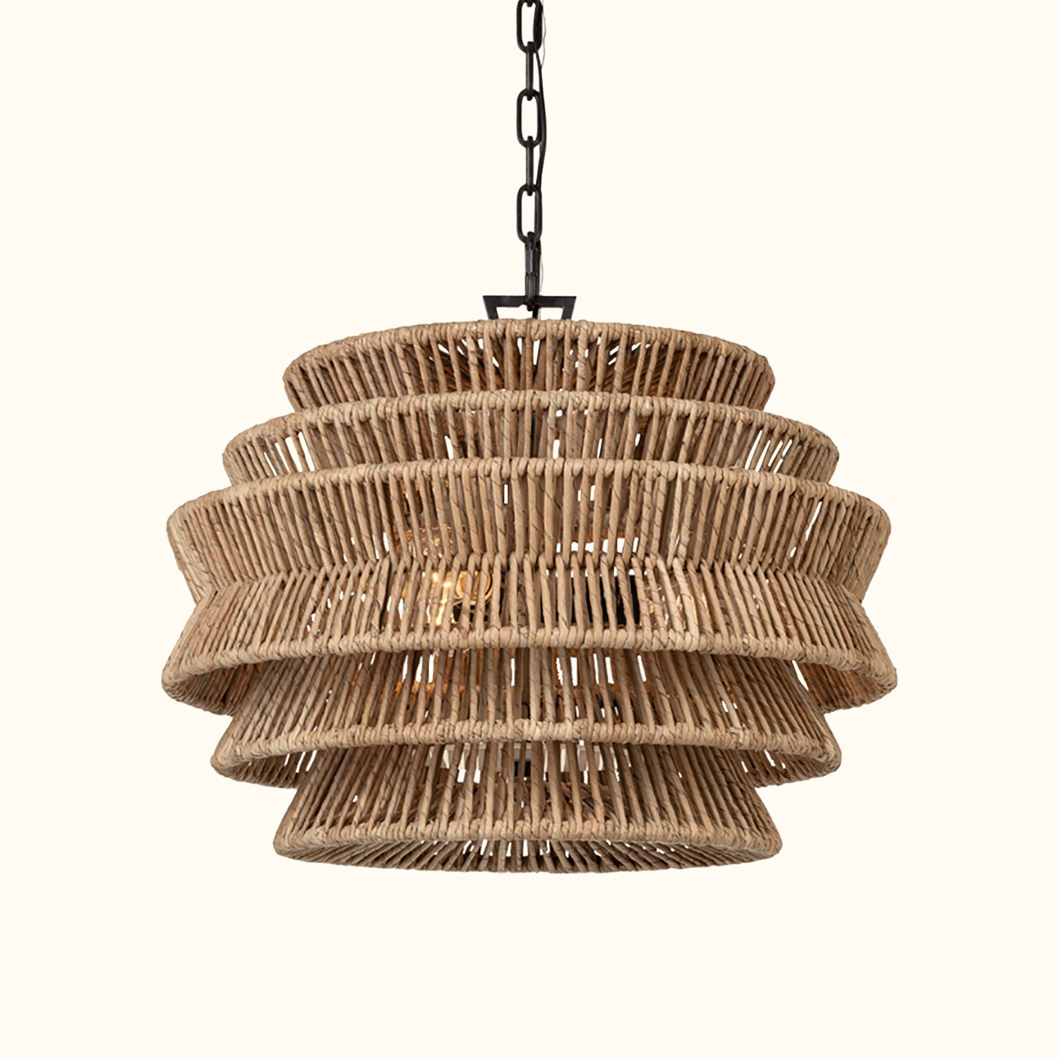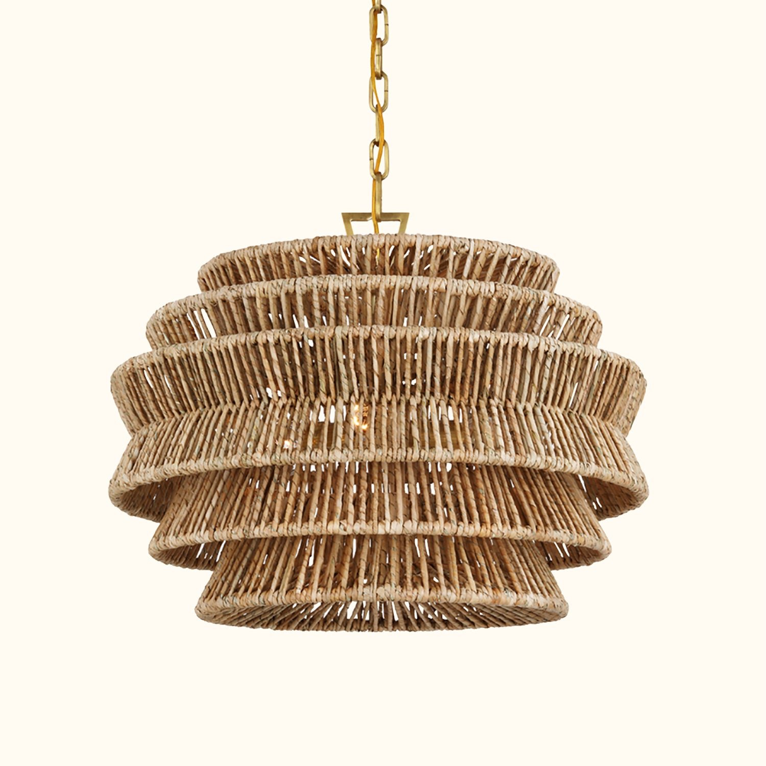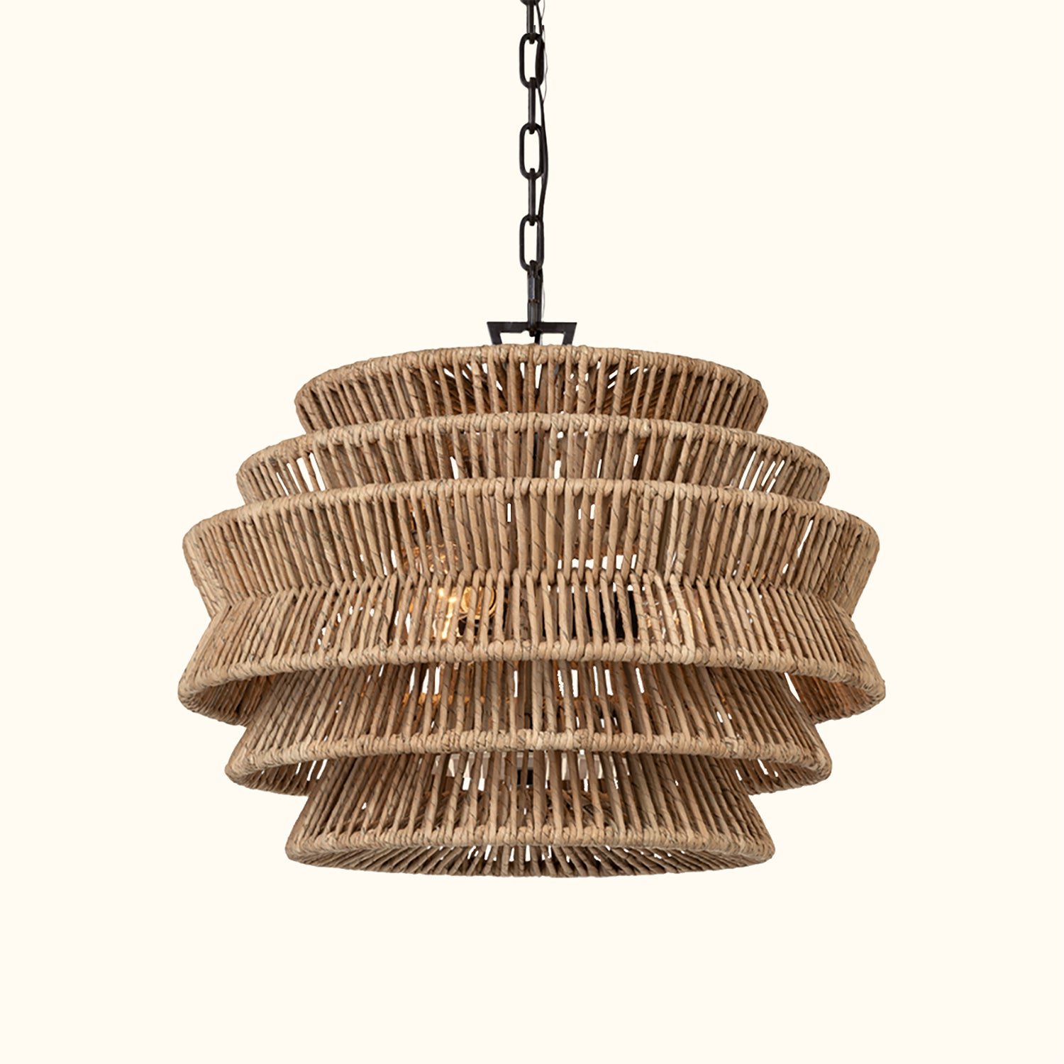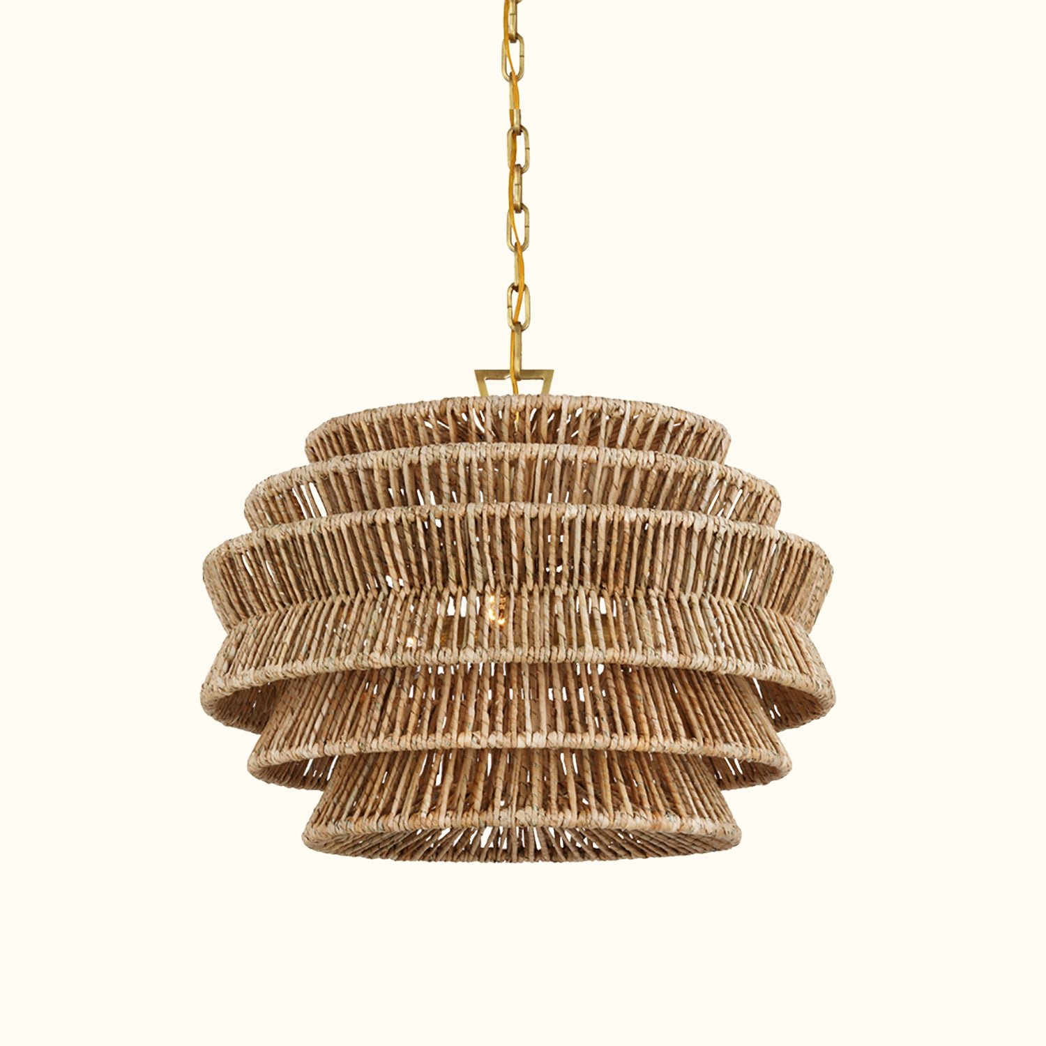 The Antigua Drum Chandelier showcases meticulous craftsmanship and a nature-inspired aesthetic. Its expansive drum-shaped shade features a tiered design and is handcrafted with natural abaca fibers. Multiple LEDs emit a soft glow through the angled frame, creating a light effect reminiscent of sunlight filtering through palm leaves.The organic texture and subtle variations of the abaca add a unique, natural charm to the fixture, making each piece a one-of-a-kind addition to any space. With its damp-rated design, it is resistant to mild moisture, making it an ideal choice for patios and verandas, as well as indoor spaces that call for a touch of natural elegance and sophistication.