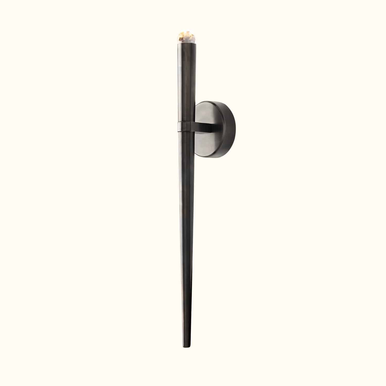 lighting designer elegant design is inspired by the minimalist French lighting of the 1960s, featuring a tapered solid brass torch form supported by a crisply chamfered backplate. An inset LED at the top provides warm, soft light.