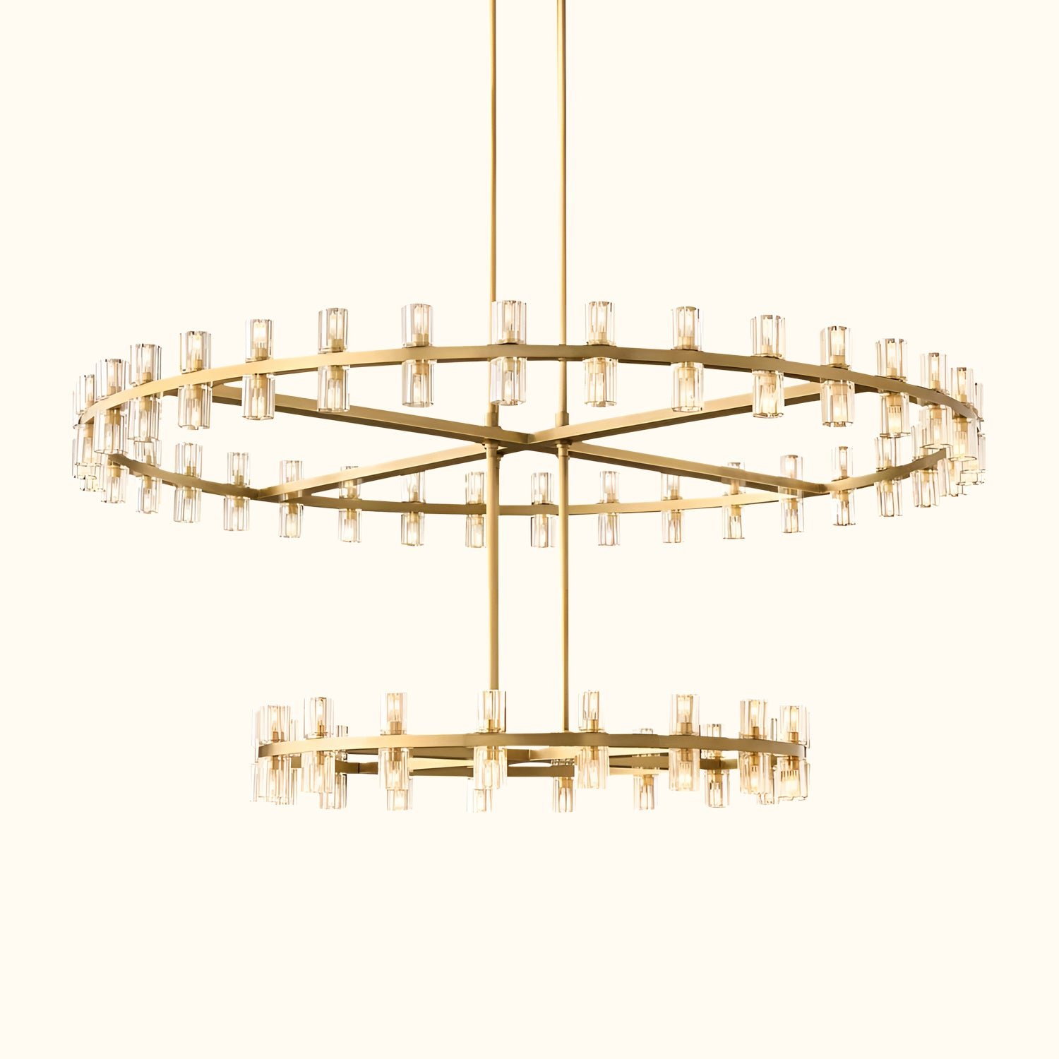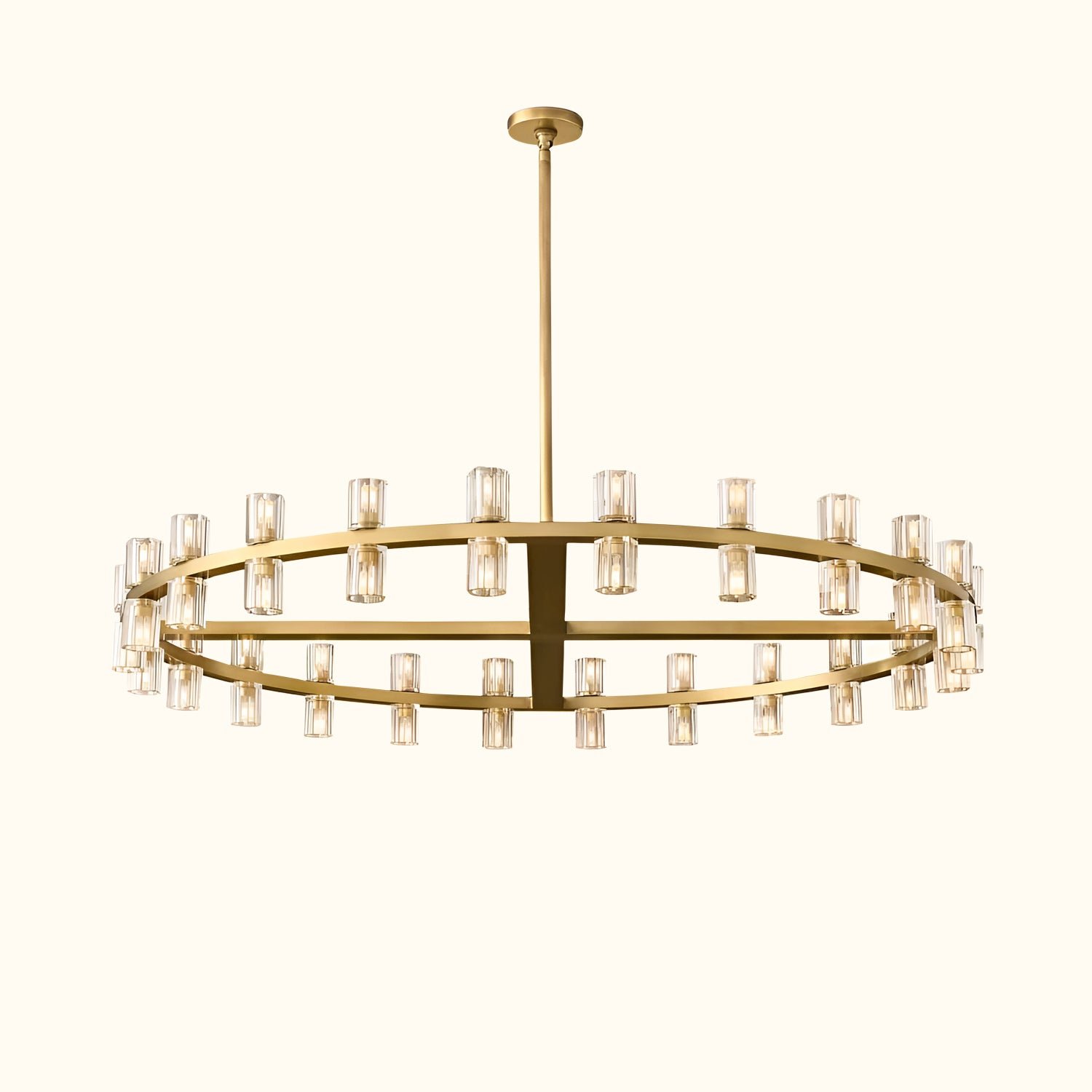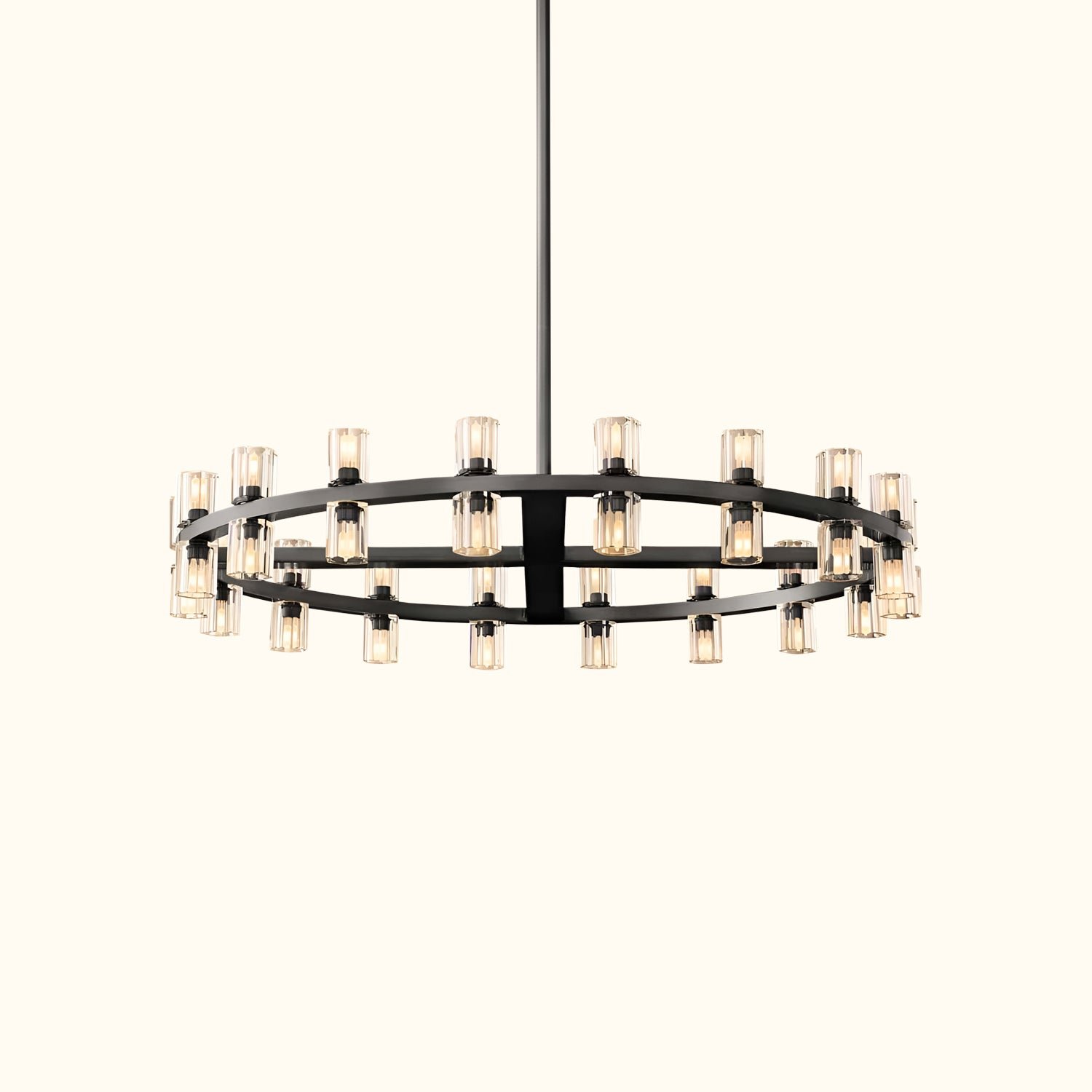 The rhythmic design by lighting designer for the Arcachon collection is inspired by the shape and scale of industrial gears, where the spokes interlace with negative space to interlock with other gears. Here, the spokes are hexagonal, contrasted with rounded interiors, beautifully crafted from crystal glass and arranged along a simple, sturdy metal frame.