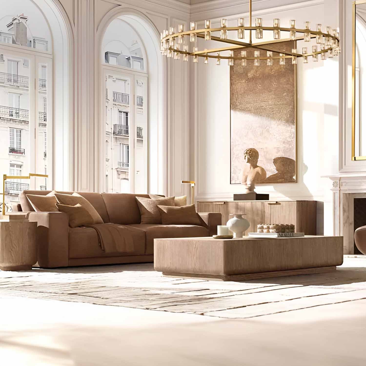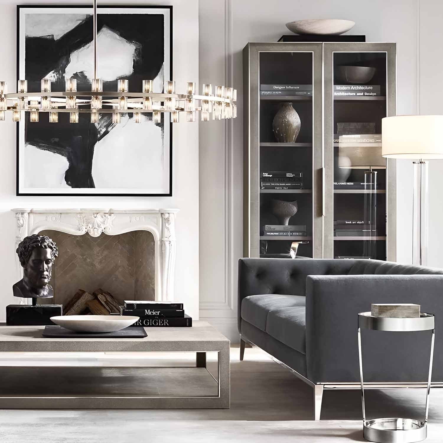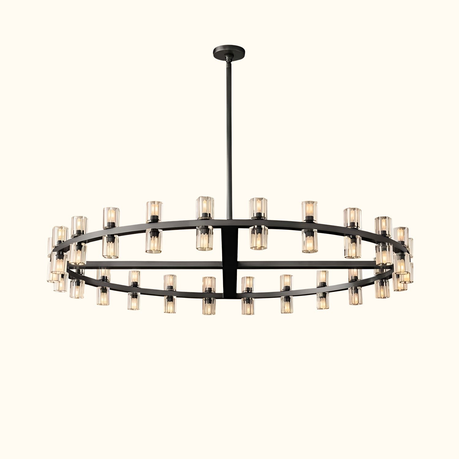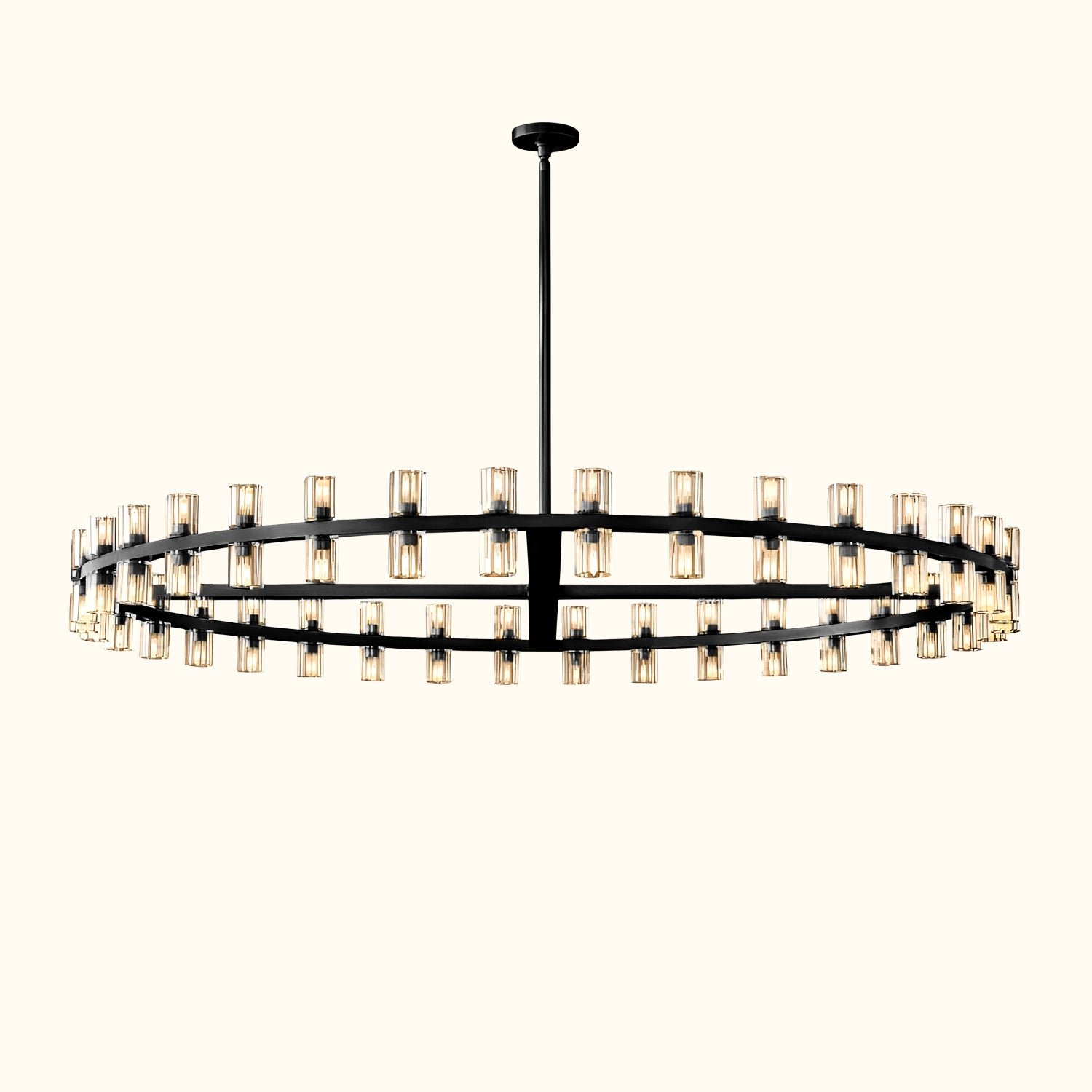 The rhythmic design by lighting designer for the Arcachon collection is inspired by the shape and scale of industrial gears, where the spokes interlace with negative space to interlock with other gears. Here, the spokes are hexagonal, contrasted with rounded interiors, beautifully crafted from crystal glass and arranged along a simple, sturdy metal frame.