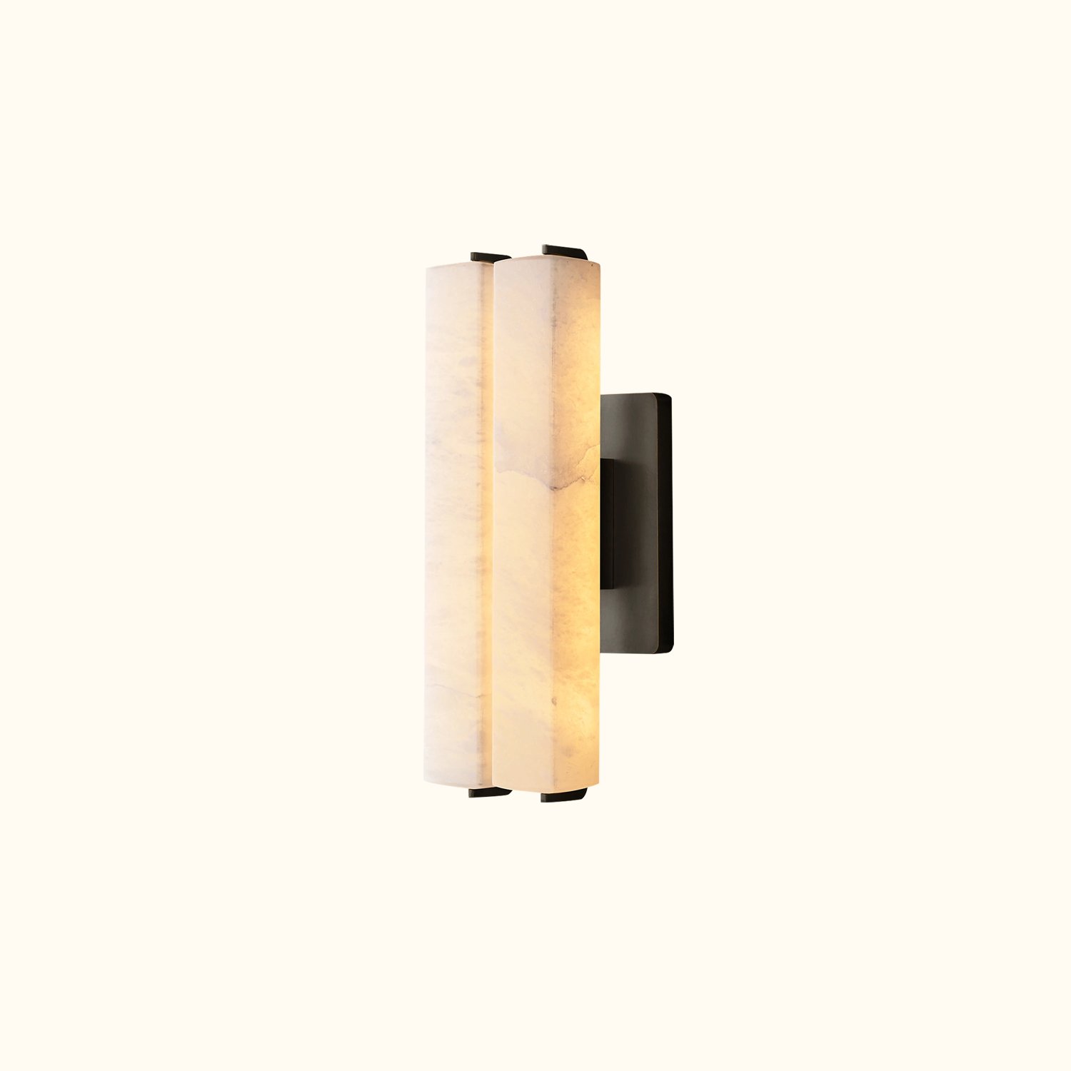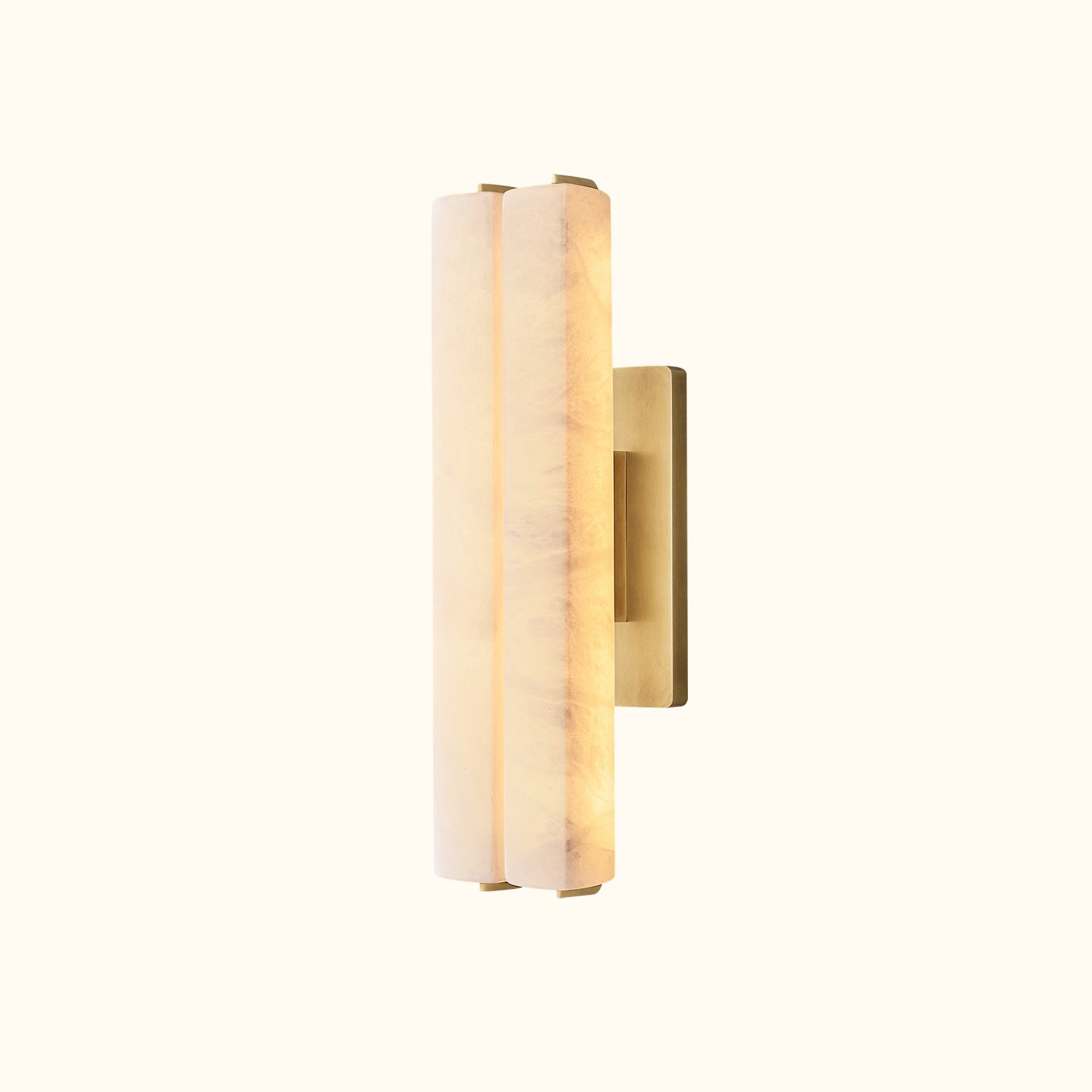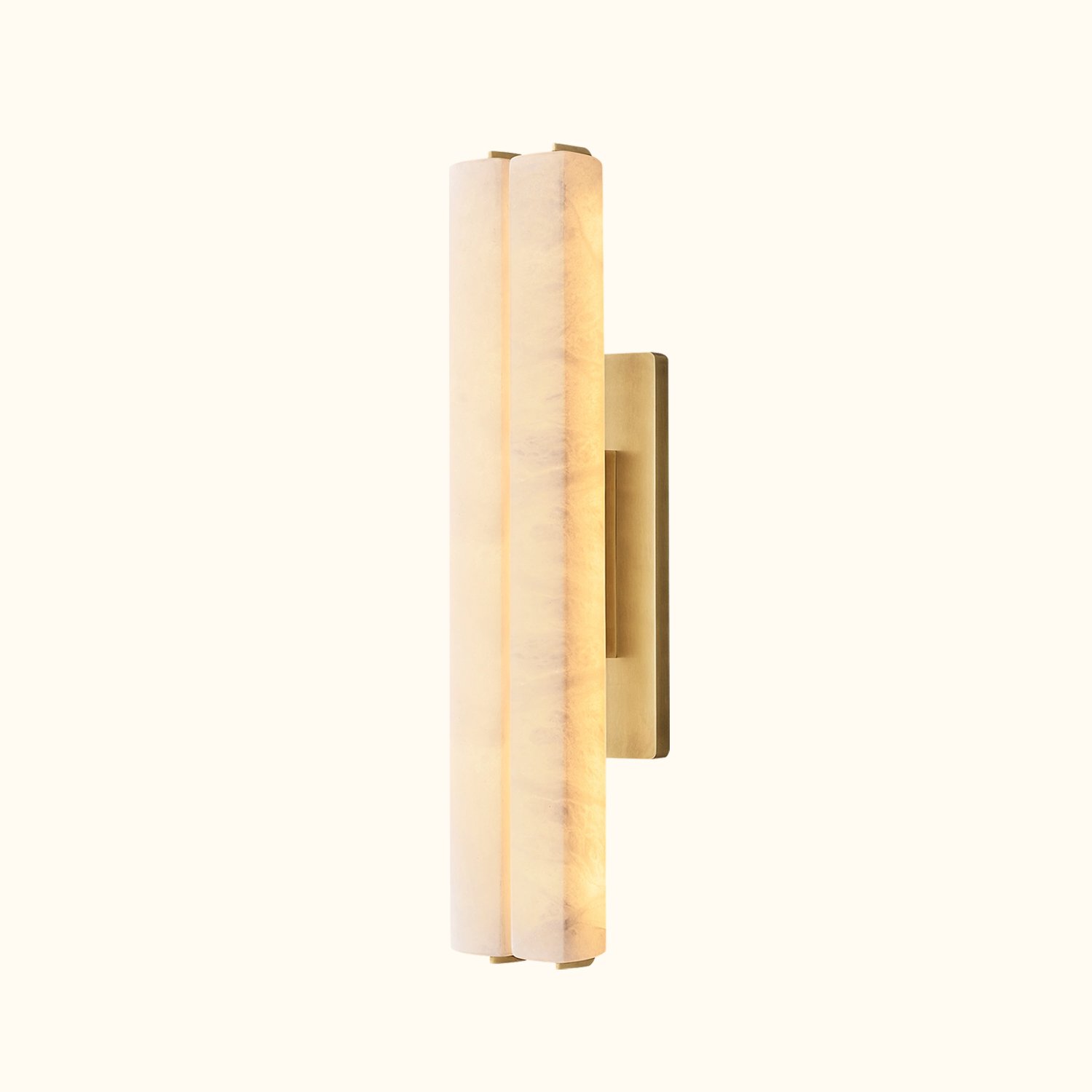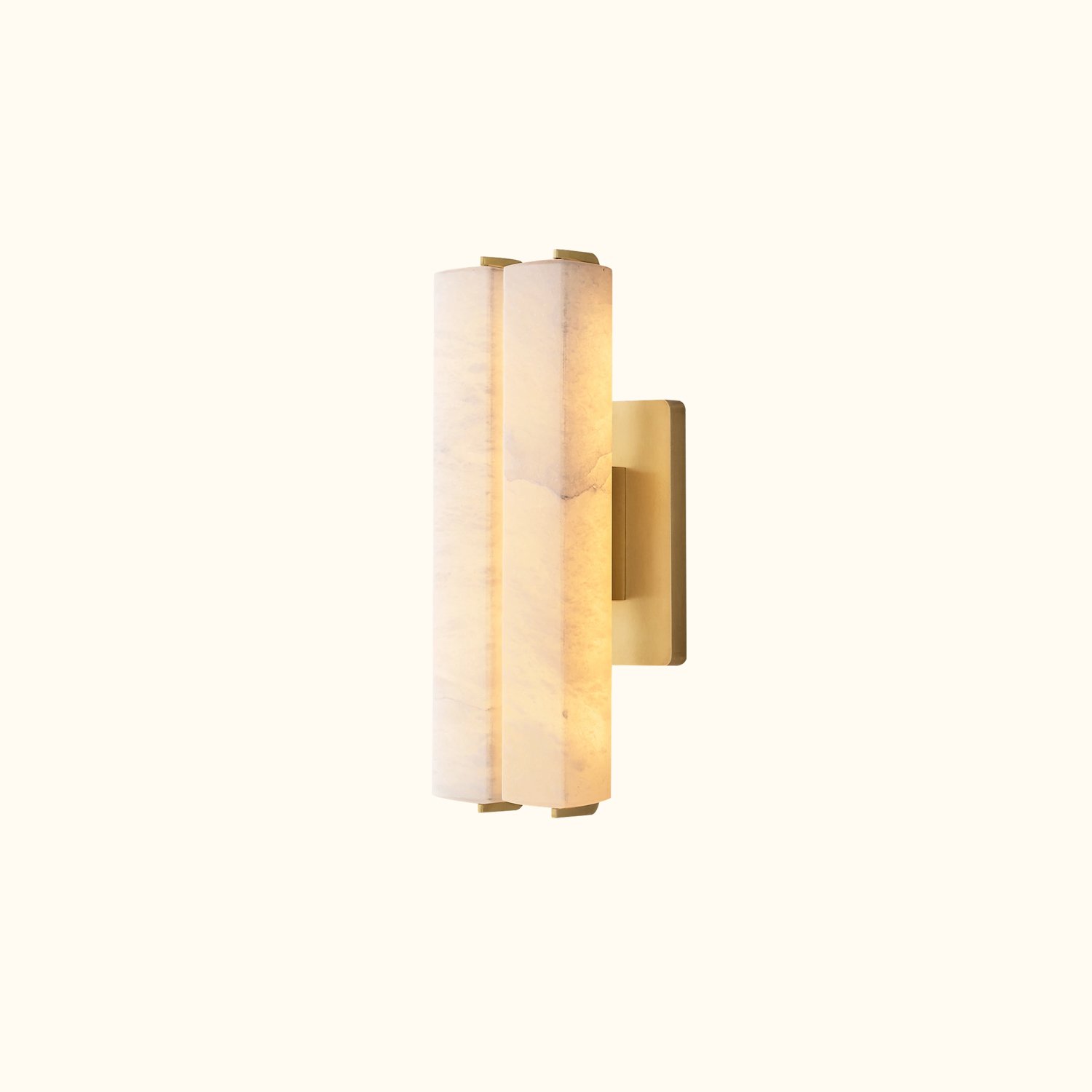 This piece captures the spirit of 1960s Italian minimalism, featuring two selenite prisms set in a solid brass frame. The collection is both striking and understated, with slender LED lights emitting a beautiful glow through the translucent stones, evoking the warmth of candlelight.