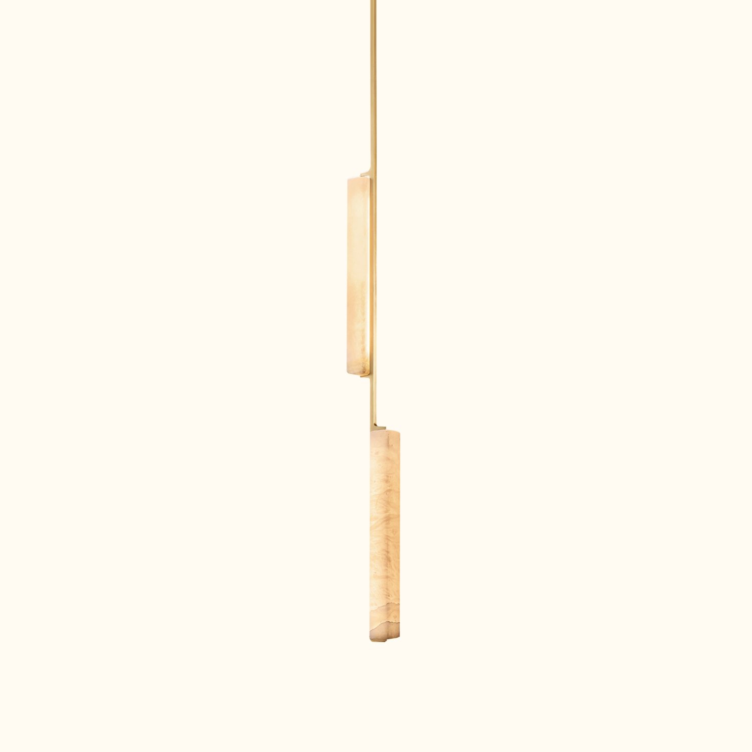 The design captures the spirit of 1960s Italian minimalism, featuring two snowflake gypsum prisms adorning vertical brass droplets. The series is both striking and understated, with slender LED lights emitting a beautiful glow through translucent gems, evoking the warmth of candlelight.