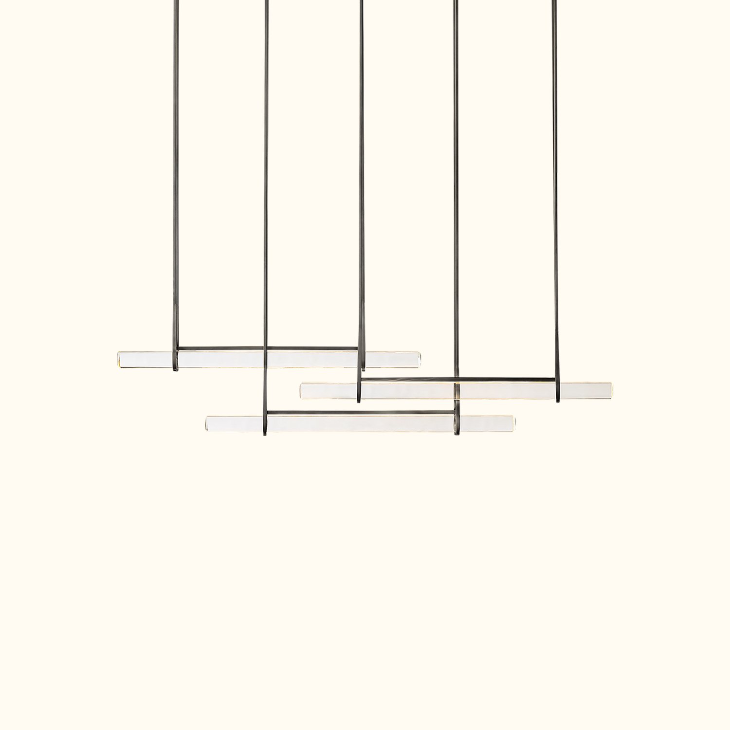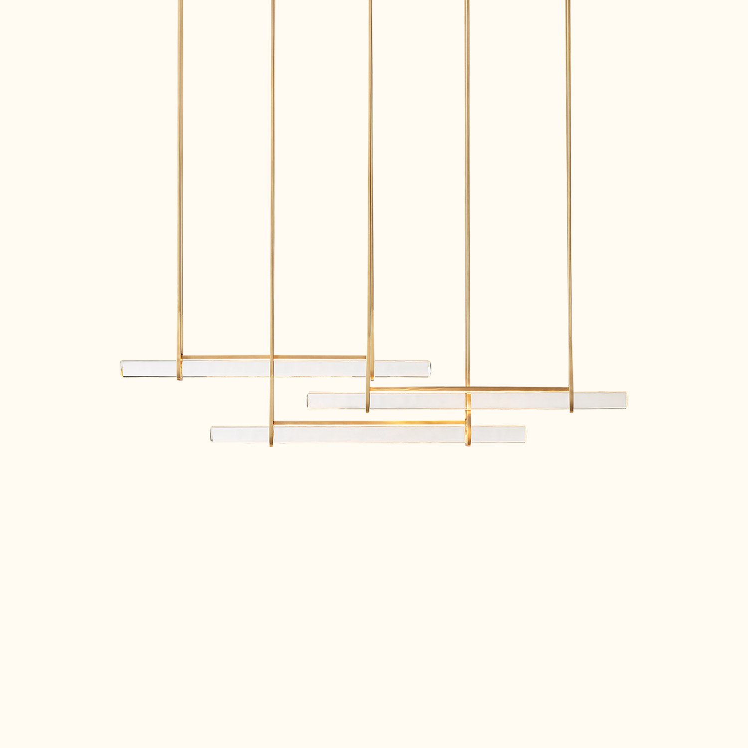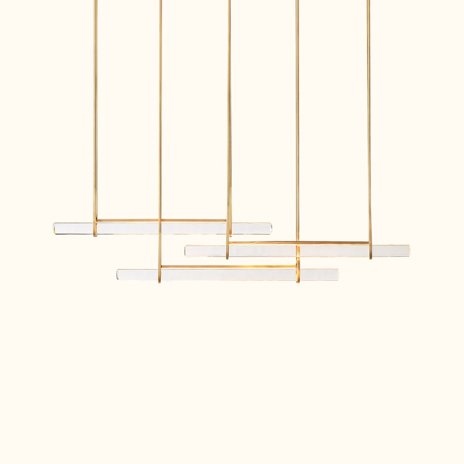 The design captures the spirit of 1960s Italian minimalism, featuring three horizontally polished K9 crystal prisms suspended at varying heights within a sturdy brass frame. The series is both striking and understated, evoking the warmth of candlelight, with slender LED lights emitting a beautiful glow through the undulating texture of the glass.
