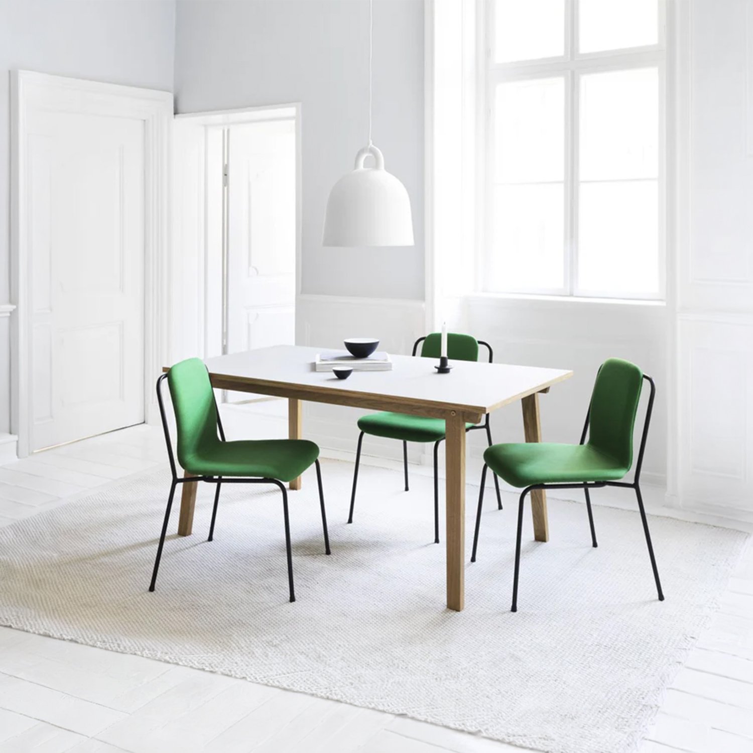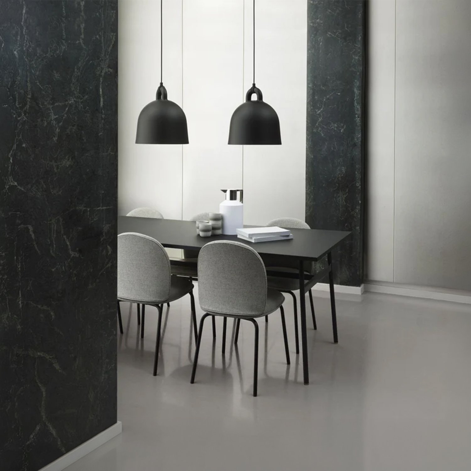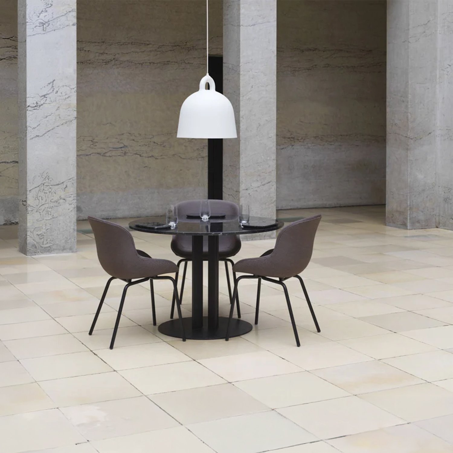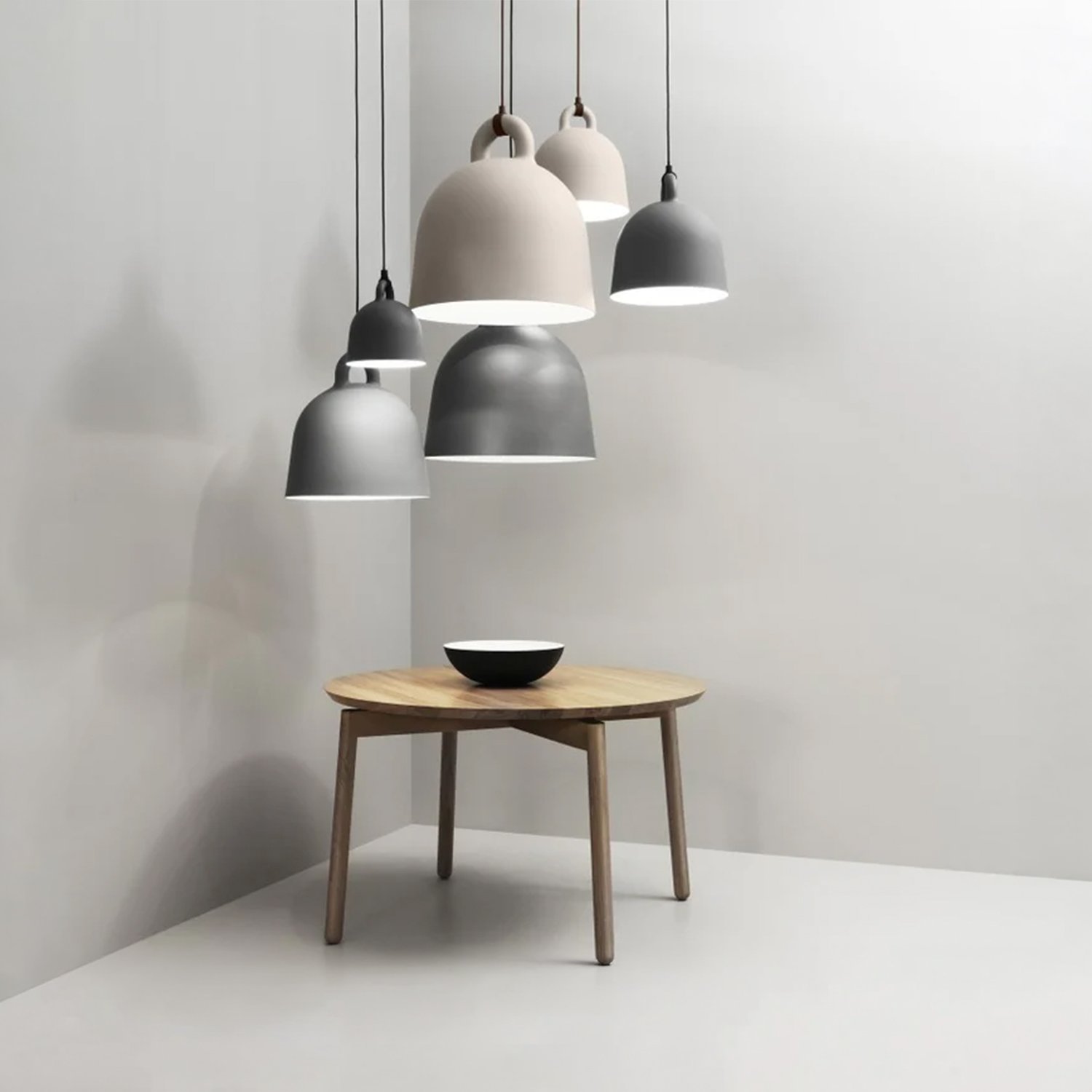 The designers took the iconic bell shape as the starting point. The lamp’s circular profile and matte surface create an impression of being cast. The white interior reflects light, allowing it to fall like a cone, providing practical illumination for various uses. The designers pay special attention to detail, modernly emphasizing the gathering point between the wires and the lamp itself. The tactile differences between the materials create a clean, minimalist appearance. The smooth aluminum complements the soft rubber, creating a distinct and impactful material effect that brings the design to life.