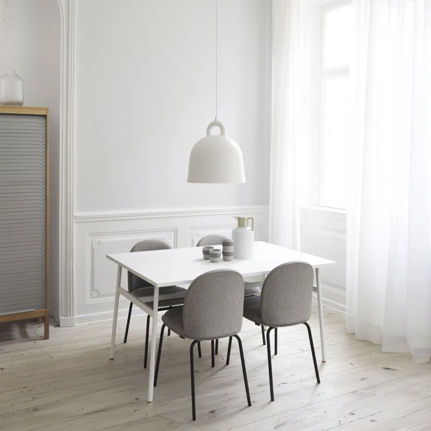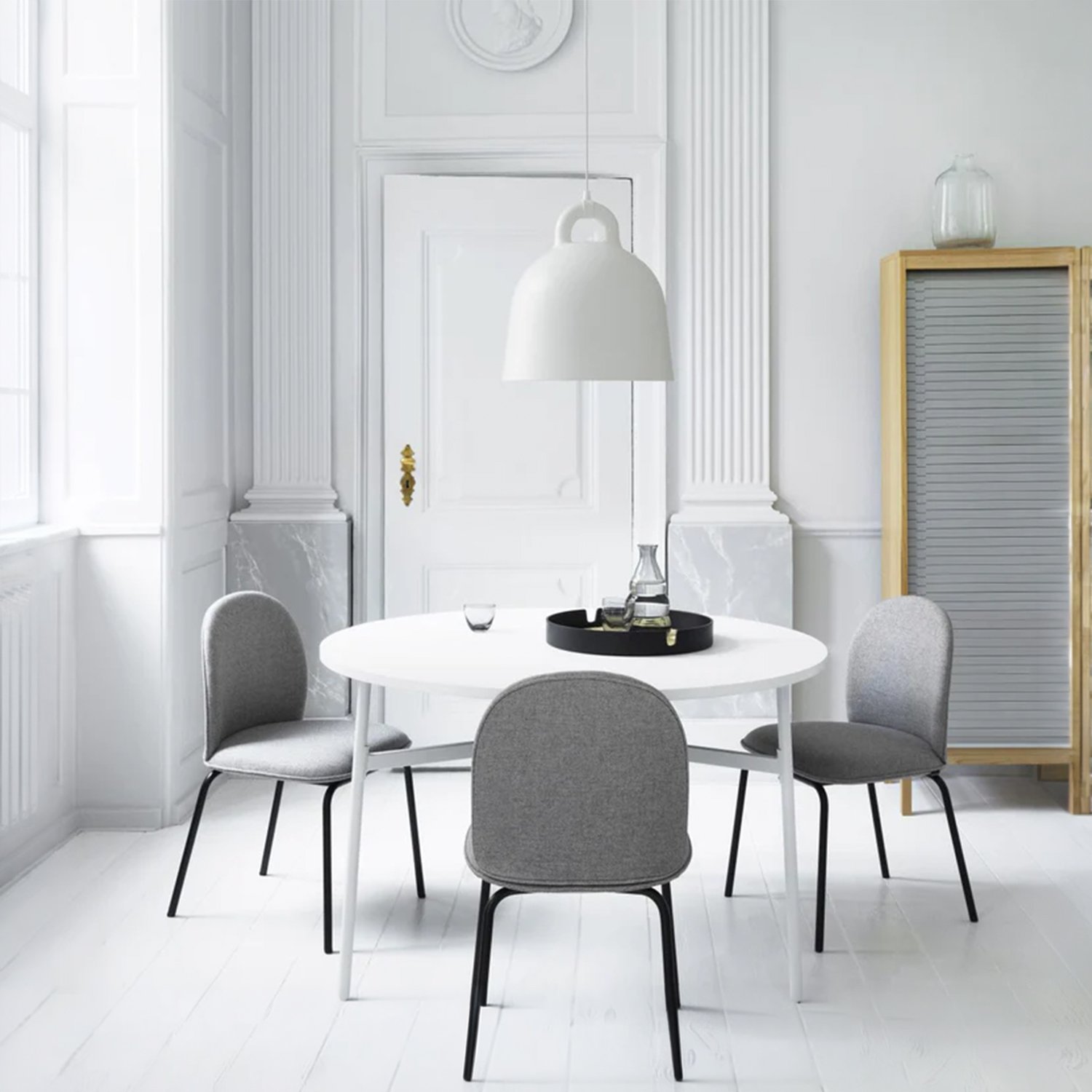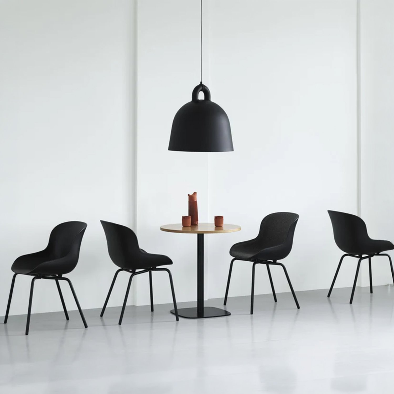 The designers took the iconic bell shape as the starting point. The lamp’s circular profile and matte surface create an impression of being cast. The white interior reflects light, allowing it to fall like a cone, providing practical illumination for various uses. The designers pay special attention to detail, modernly emphasizing the gathering point between the wires and the lamp itself. The tactile differences between the materials create a clean, minimalist appearance. The smooth aluminum complements the soft rubber, creating a distinct and impactful material effect that brings the design to life.