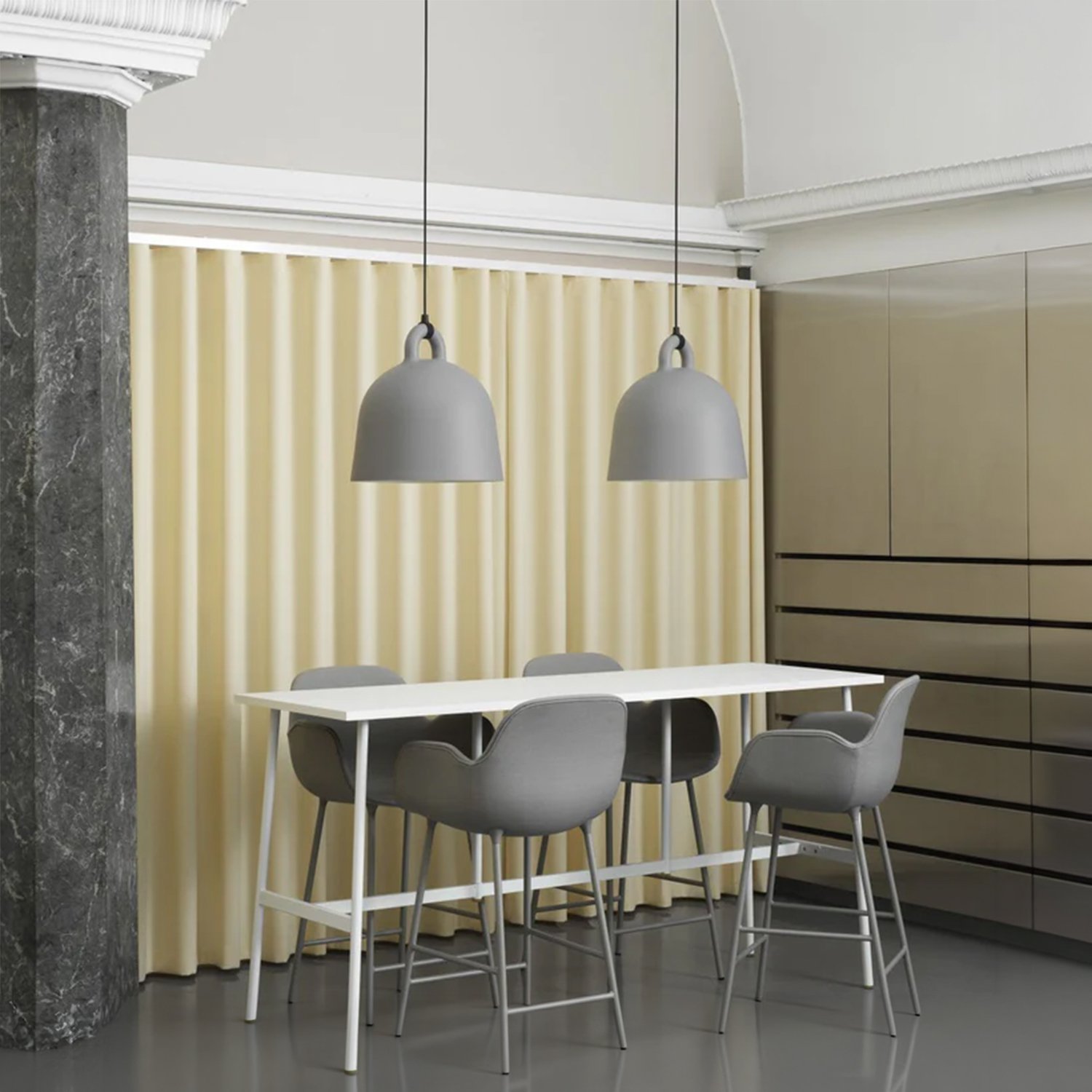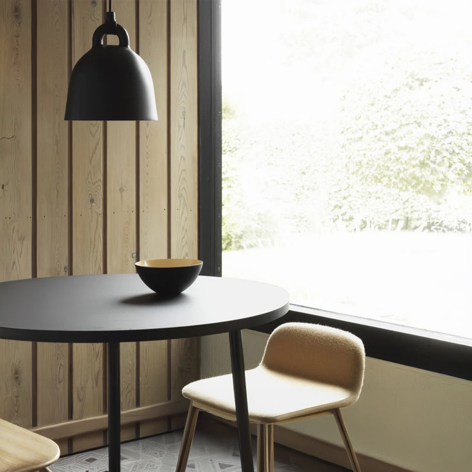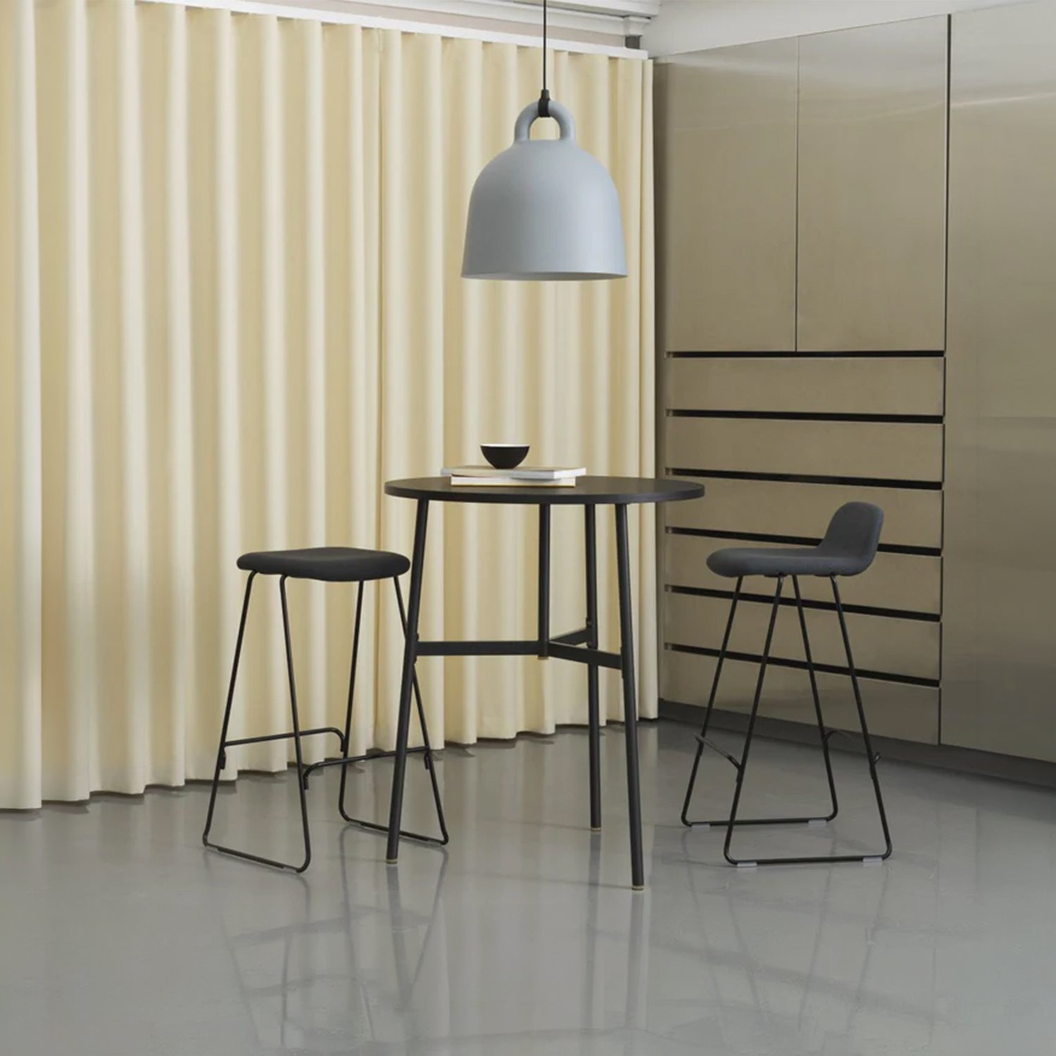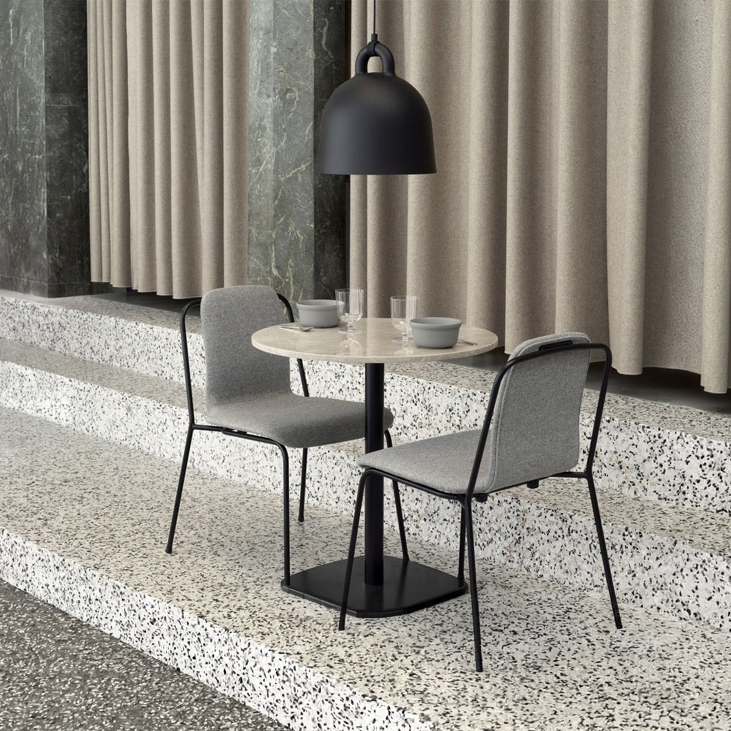 The designers took the iconic bell shape as the starting point. The lamp’s circular profile and matte surface create an impression of being cast. The white interior reflects light, allowing it to fall like a cone, providing practical illumination for various uses. The designers pay special attention to detail, modernly emphasizing the gathering point between the wires and the lamp itself. The tactile differences between the materials create a clean, minimalist appearance. The smooth aluminum complements the soft rubber, creating a distinct and impactful material effect that brings the design to life.