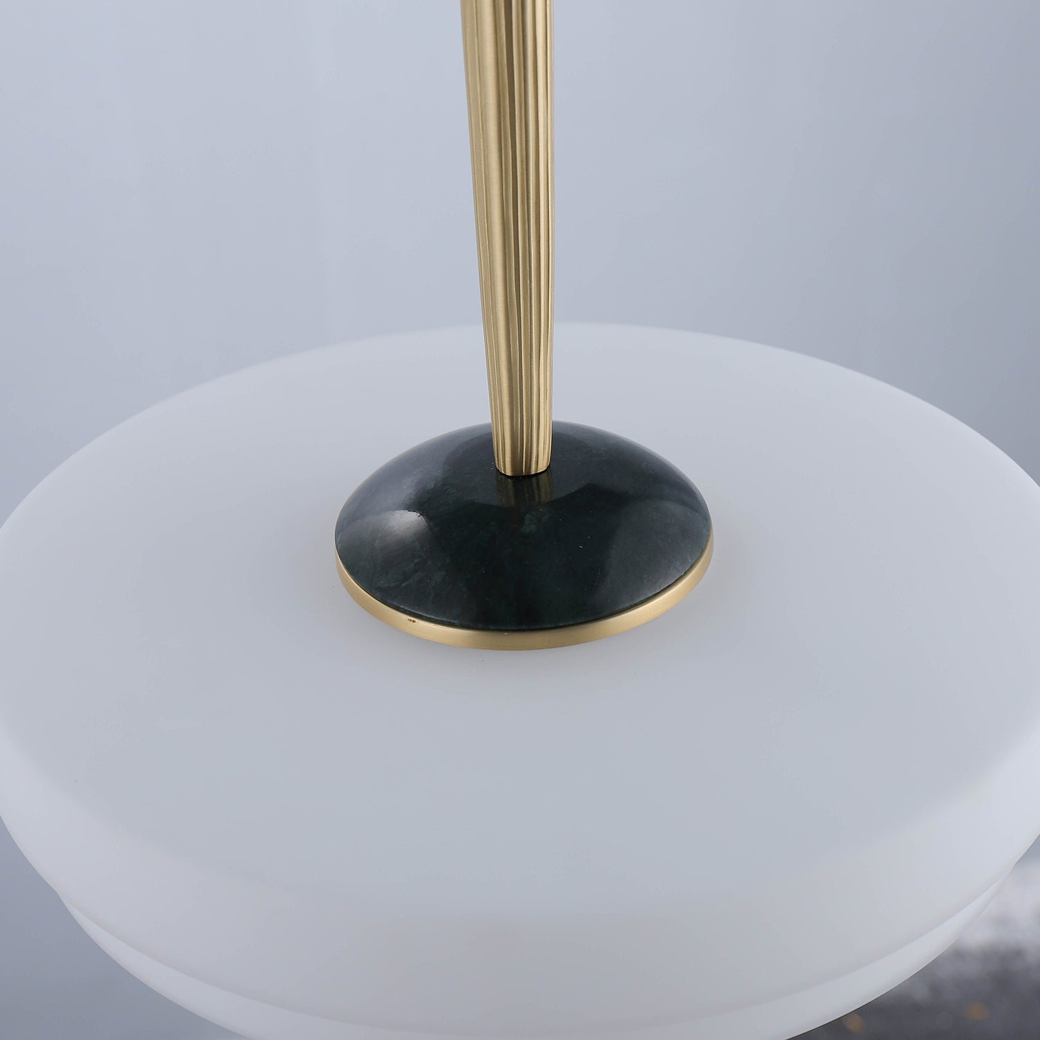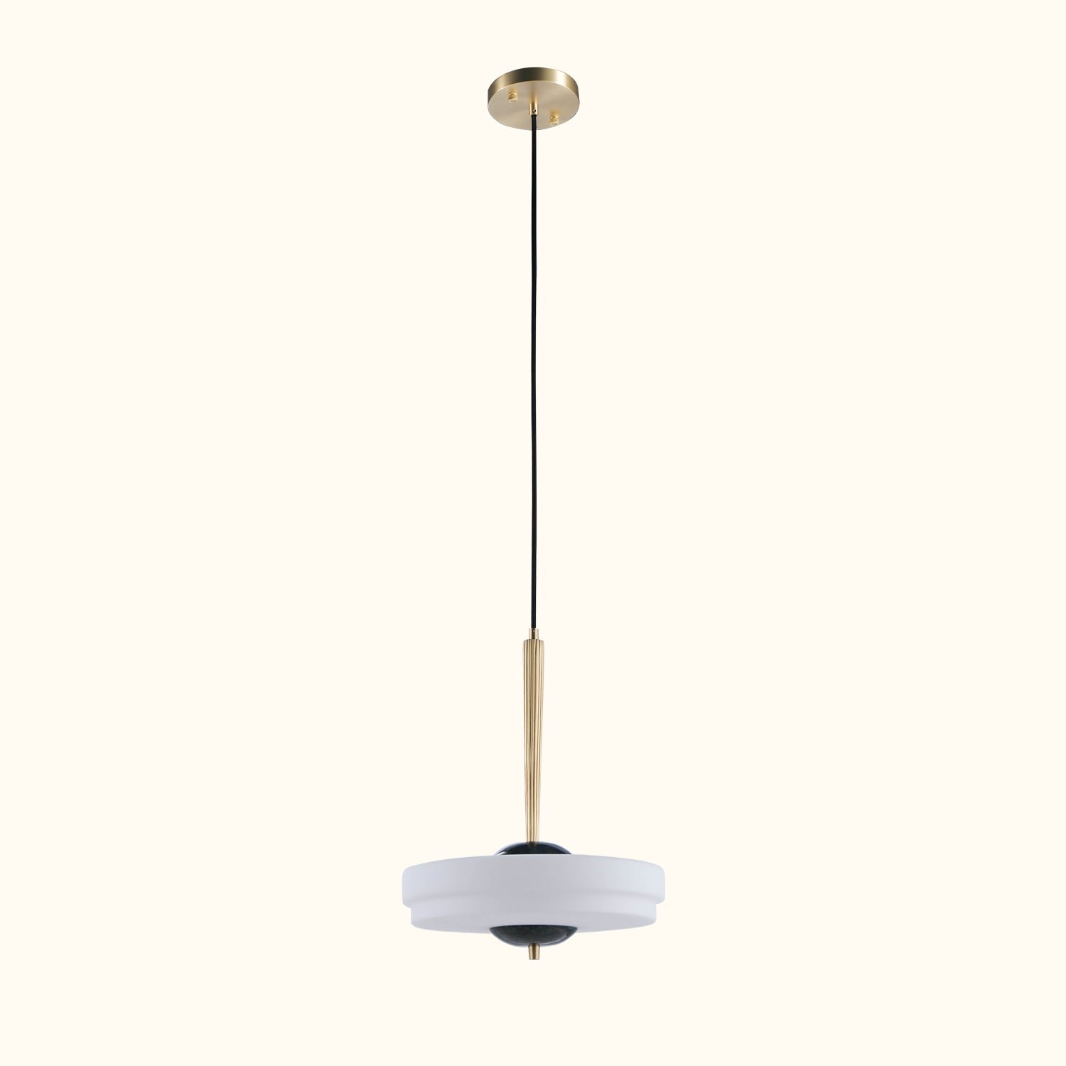 The Trave Pendant casts a gentle, ambient glow through its two-tiered opal glass shade that encircles a marble orb. A fluted brass stem with ridged detailing extends from the top, concealing the cord while adding an elegant touch. Trave’s luxurious design draws inspiration from the regal, geometric motifs of the Art Deco era. It comes with a canopy to cover a standard US junction box.