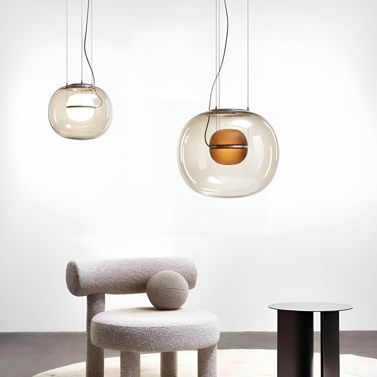 This large-format light, created by designer Lucie Koldova, features a matte core that embodies gentle poetry, simplicity, purity, and balanced proportions. The key element lies in the merging of the luminous bodies and their interaction within the space—the light emitted from the smaller glass core flows freely through the air atoms within the symbolic protective shell of the outer globe, while the sophisticated design of a bubble suspended within the large sphere evokes a sense of levitation.