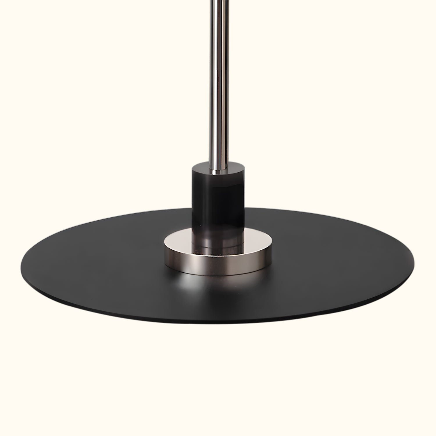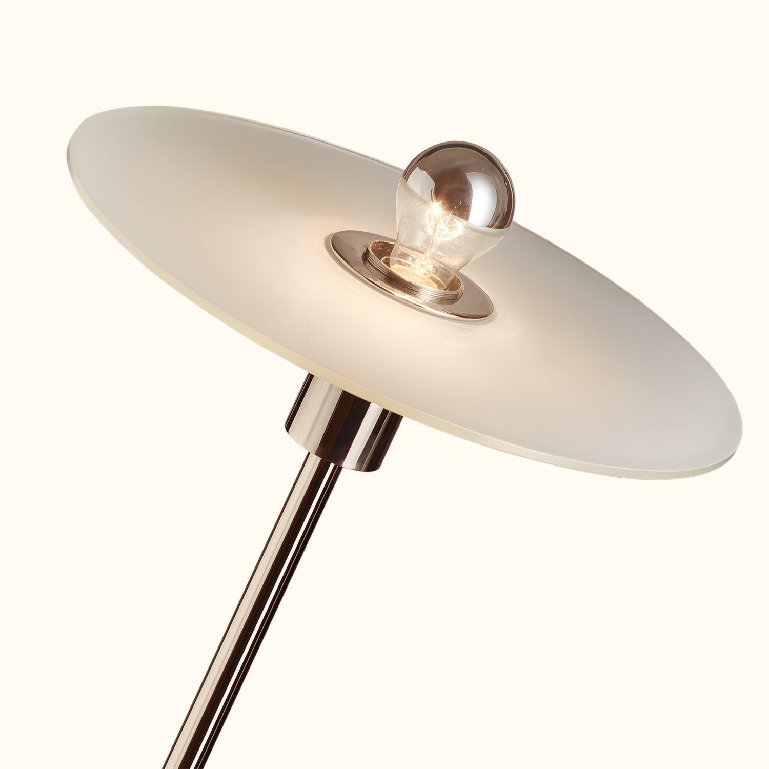 The light source itself is a unique design feature—a bare incandescent bulb with a mirrored dome, which had just been invented at the time. The light is directed downward, making the light source appear dim. The light is absorbed and refracted by etched frosted glass, making it seem like a shiny layer floating above a thin nickel-plated metal tube.This lamp was showcased as an example of functional design in Issue 7 of the Bauhaus book, published in 1925. The only original model was exhibited in the experimental house called “Am Horn,” but unfortunately, it has since been lost.