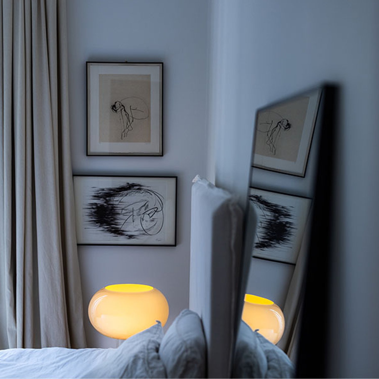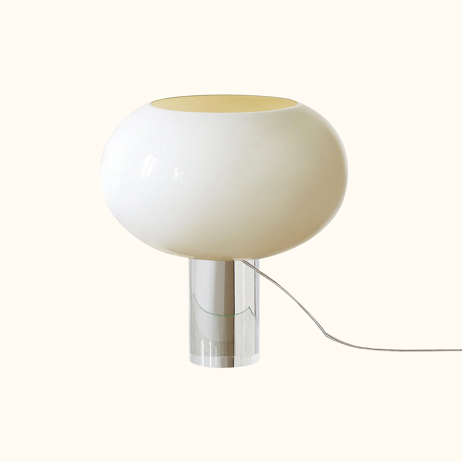 A table lamp with diffused light. The hand-blown outer shell features a five-layer glass diffuser with a smooth surface. The inner glass layer is a subtle straw yellow, creating a warmer light with richer color. The “warm white” version appears ivory when the lamp is on and remains white when off. The base consists of a fully transparent PMMA cylinder, milled according to a pattern and hand-polished to a mirror finish. The supporting base is covered with a layer of transparent anti-static protective film. The glass is secured to the base with a cup-shaped ring nut; a transparent cable with an ON/OFF switch extends from the base’s groove. The base is packaged in a custom product bag and features a specific scratch-resistant material applied for cleaning the base itself. Due to the glass’s noticeable aperture, the bulb remains clearly visible, serving an aesthetic purpose.