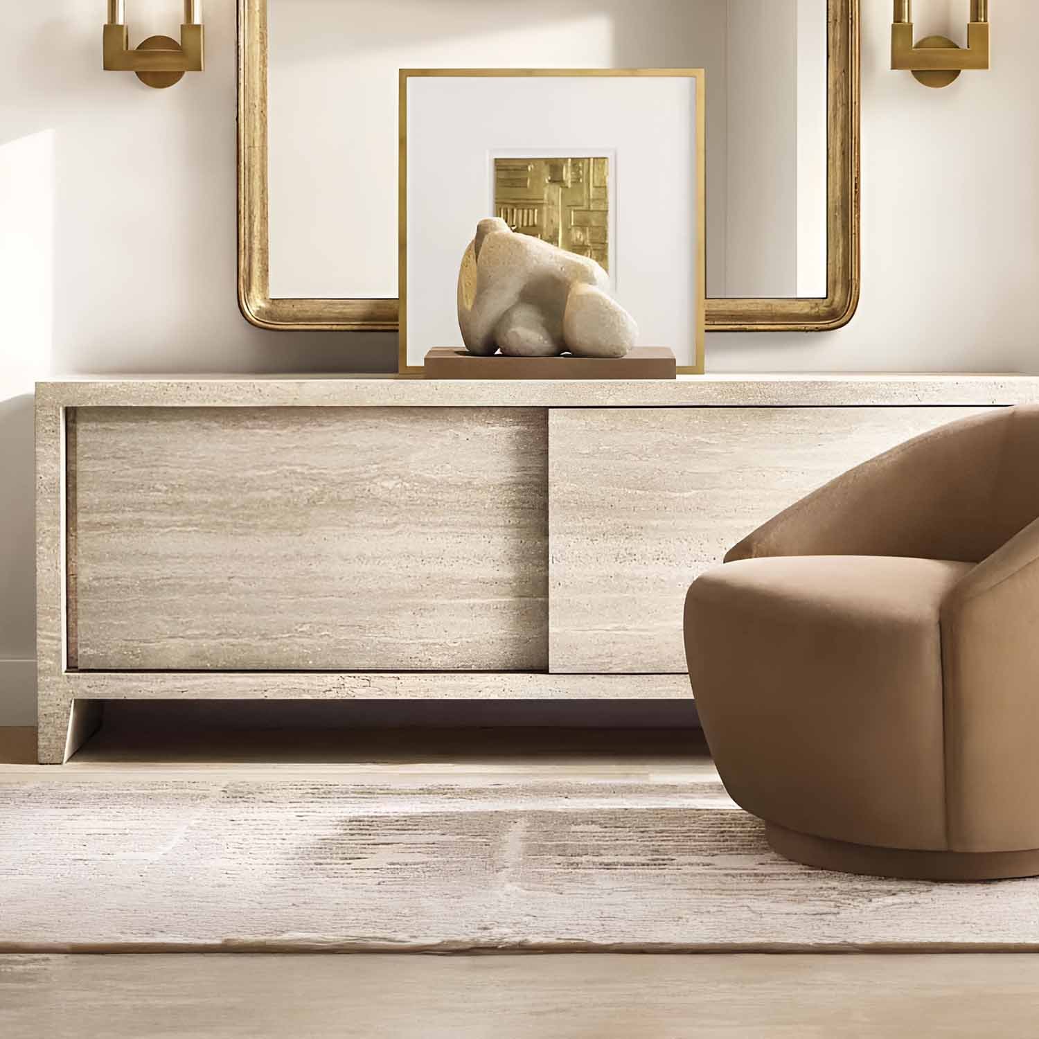 The form of a Beaux Arts candleholder is reinterpreted in solid brass by renowned lighting designer. Defined by clean lines and sharp angles, the fixture’s elegant ribbed-glass hurricanes showcase Edison filament bulbs, shimmering like candles within.