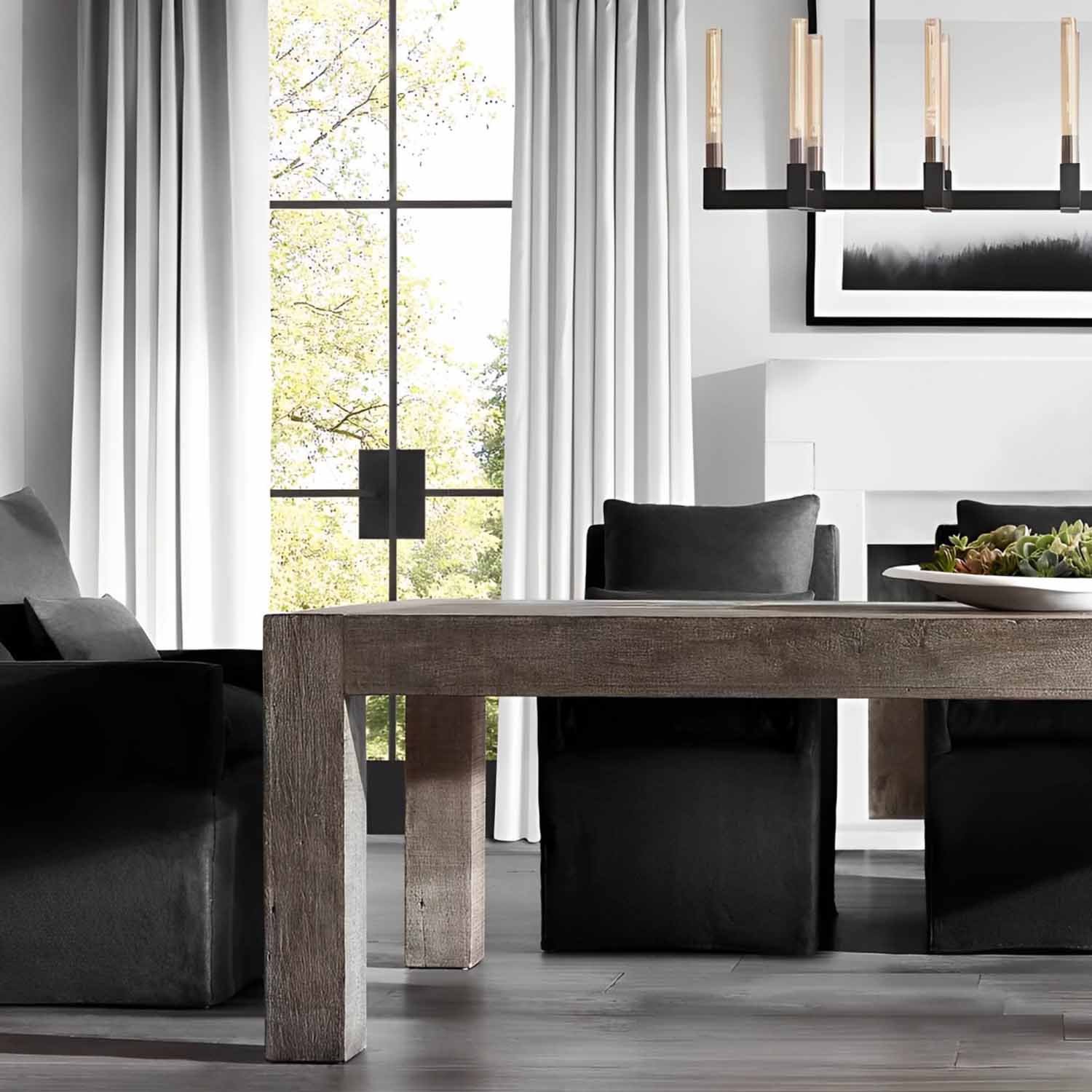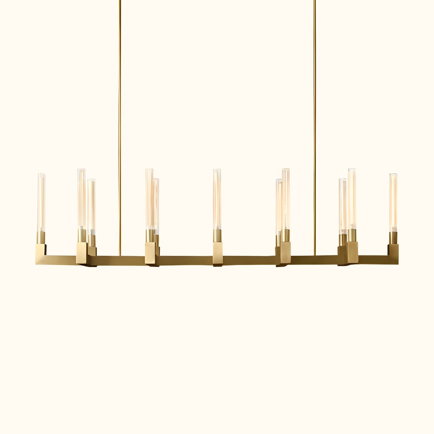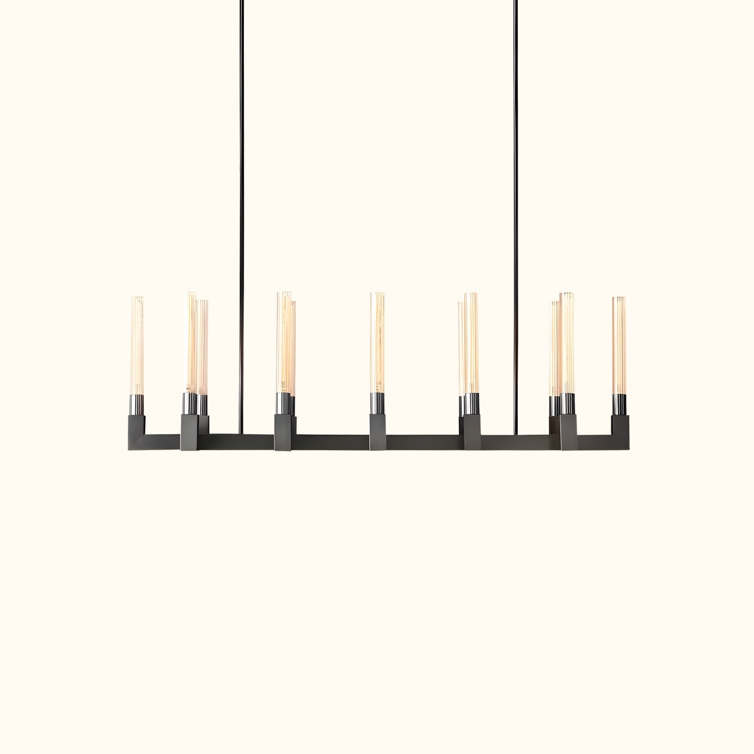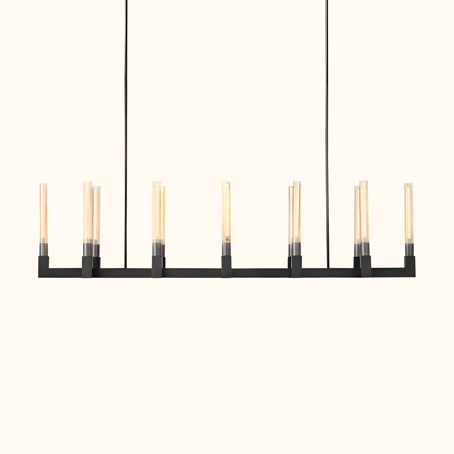 Renowned lighting designer reinterprets the Beaux Arts chandelier in solid brass. Defined by clean lines and sharp angles, the fixture’s elegant ribbed-glass shades showcase Edison filament bulbs, resembling flickering candles within.
