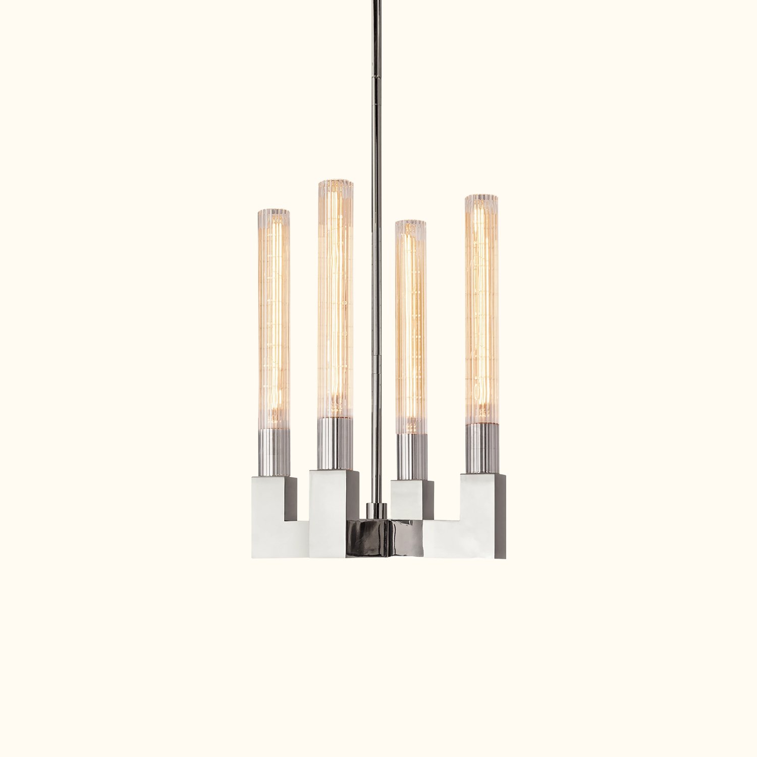 Renowned lighting designer reinterprets the Beaux Arts chandelier in solid brass. The fixture is defined by clean lines and sharp angles, with elegant ribbed-glass shades showcasing Edison filament bulbs that shimmer like candles.
