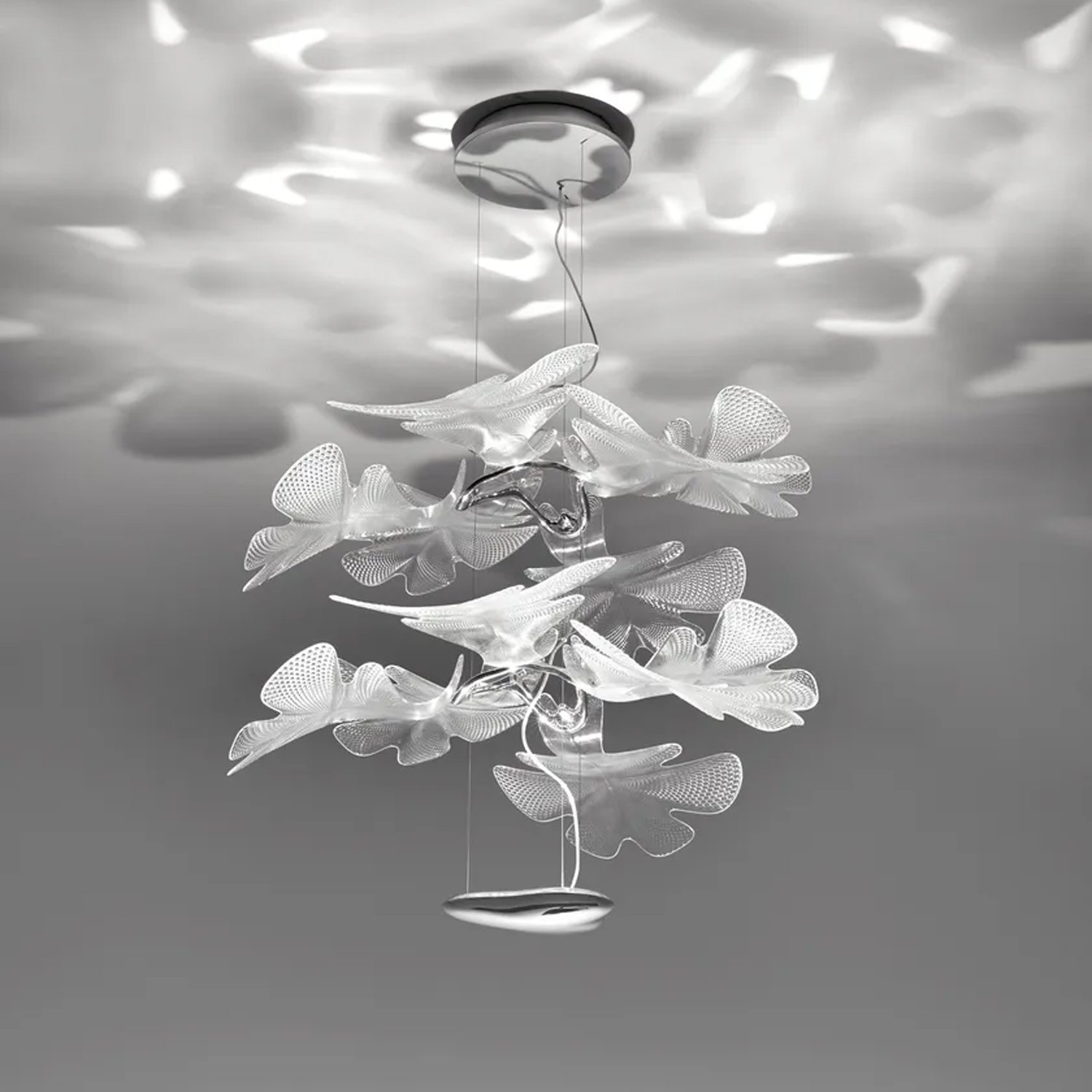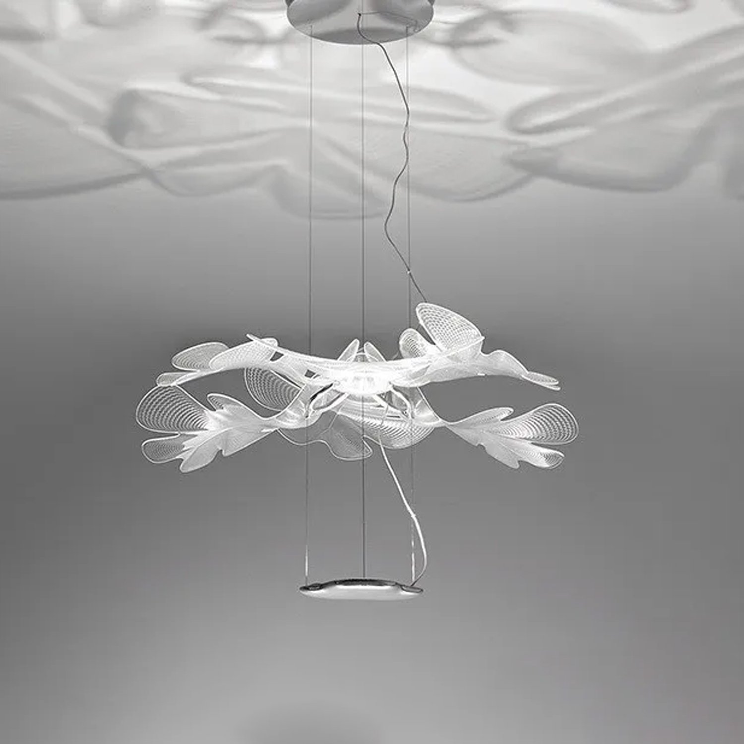 Chlorophilia is a new project that emphasizes the skills in lighting engine design through an iconic approach to organic and fluid forms. This aesthetically pleasing yet lightweight pendant device presents a delicate contrast of tones that interact with the space when turned on, enhancing its completeness. The body contains an LED COB used as a heat sink, along with lightweight plant-like elements made from molded PMMA, which combine soft wave textures with uneven stepped sections that serve as optical lenses. The suspended central body emits indirect light, filtered and refracted by three transparent surfaces, with natural shapes reminiscent of elements found in nature, such as leaves. These three elements are arranged in a sunburst pattern, partially overlapping to increase shadow contrast, creating a scenic effect on the ceiling while complementing ambient lighting. Chlorophilia defines an optical and architectural principle that can be recreated by multiplying its elements to create combinations that develop or expand its width across multiple levels in the space.