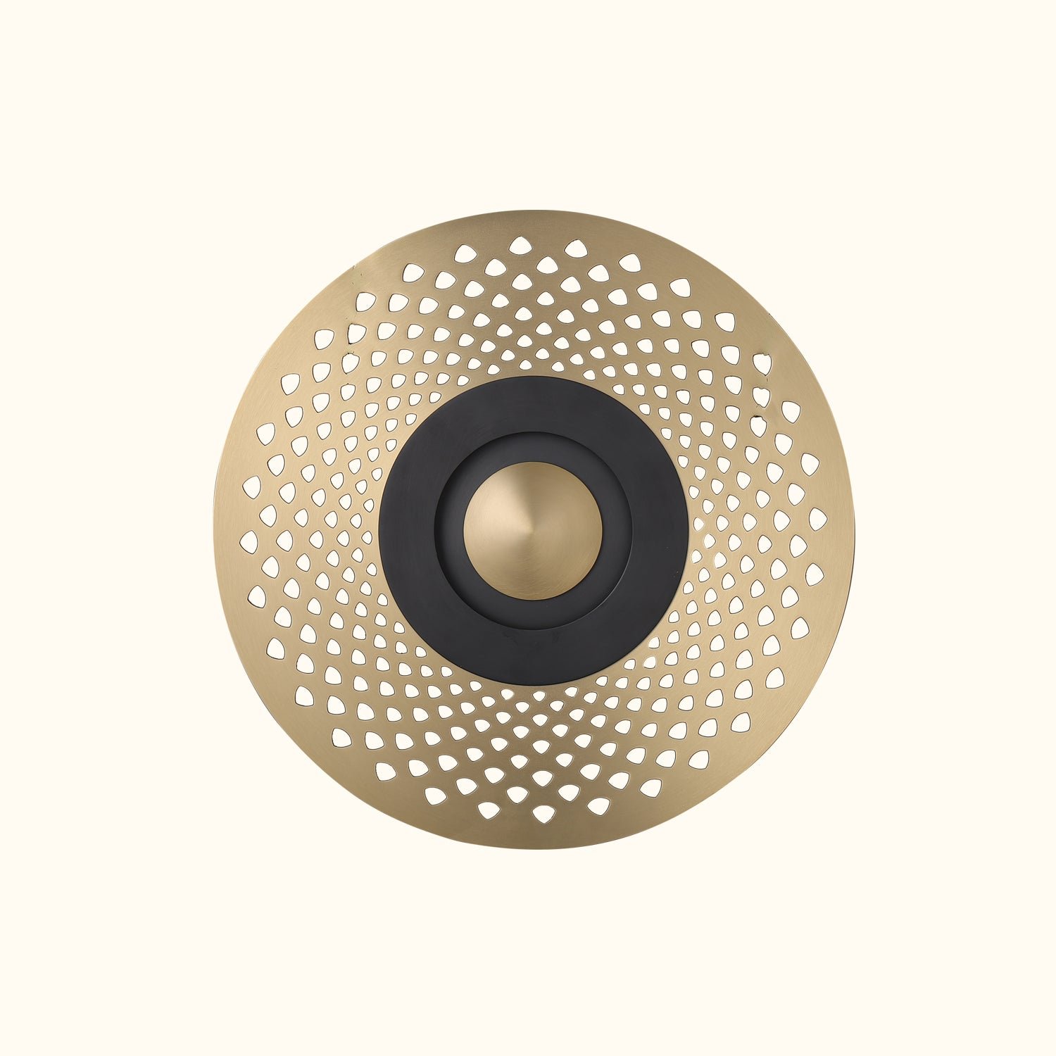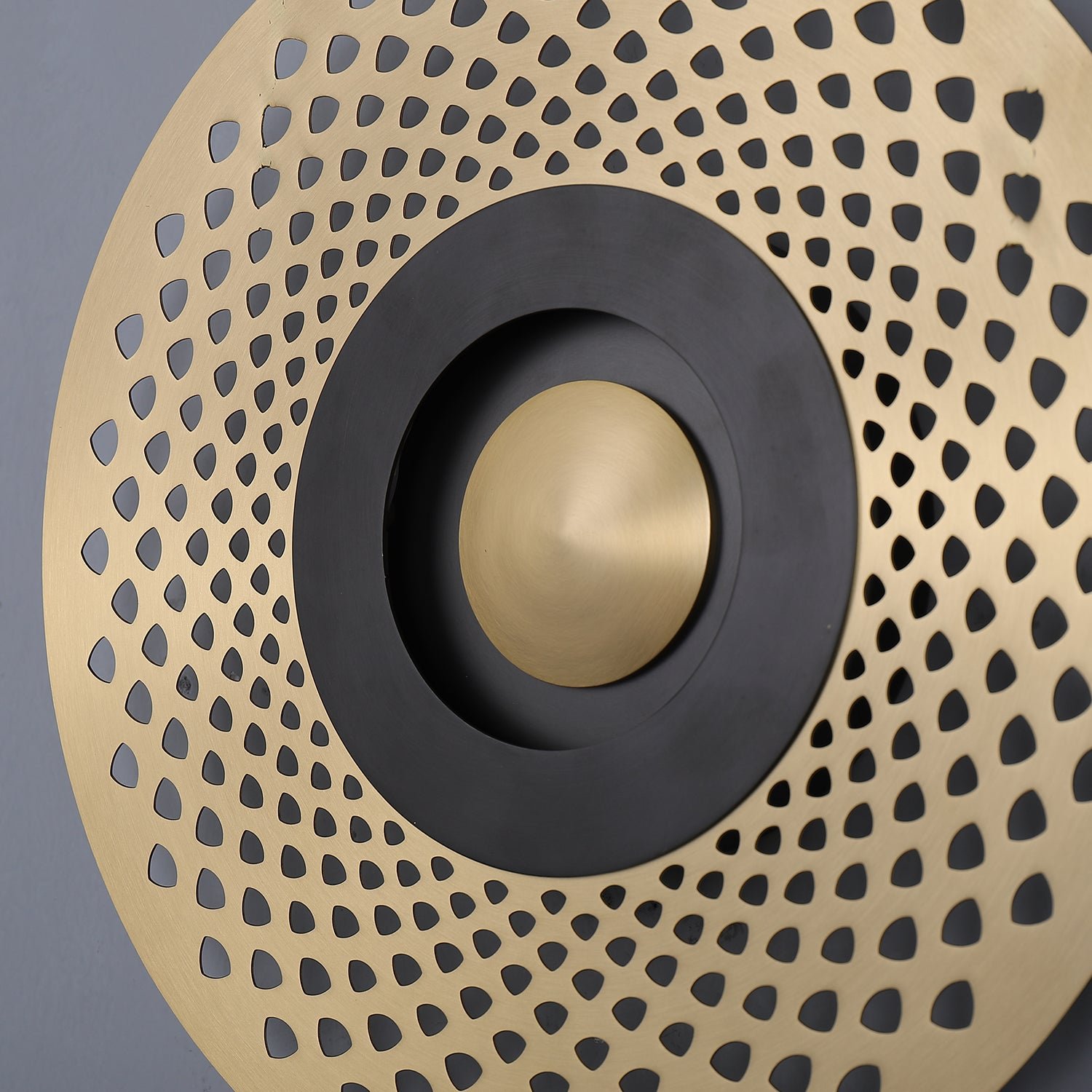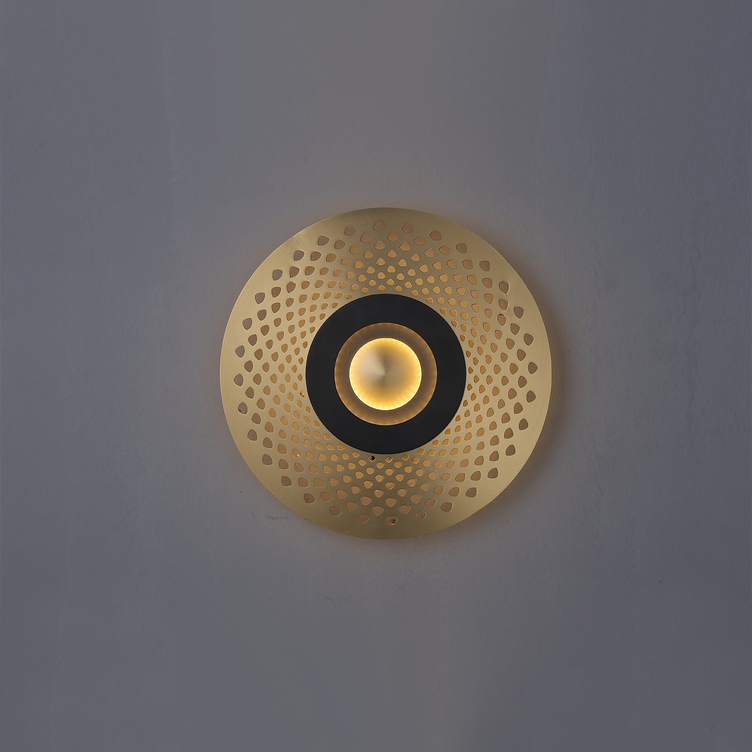 This wall light features an illuminated center and is crafted with either an intricate openwork design or a solid metal piece, giving the collection an Art Deco flair. It can create a range of effects, from semi-darkness to a patterned light source, allowing for versatile arrangements.