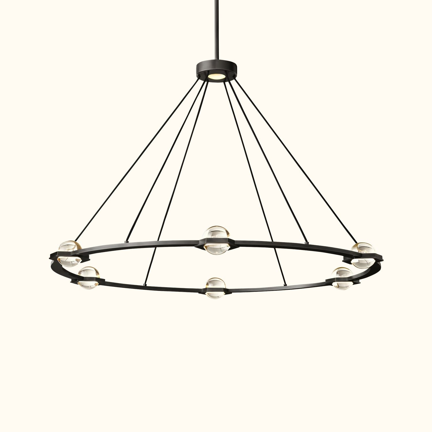 The Éclatant collection is spare and elemental, featuring illuminated crystal orbs suspended within hexagonal fittings, set in a flat metal frame. The design is inspired by 18th-century architectural drawings for a cenotaph—a tribute to physics that has been remarkably reinterpreted in a contemporary form.