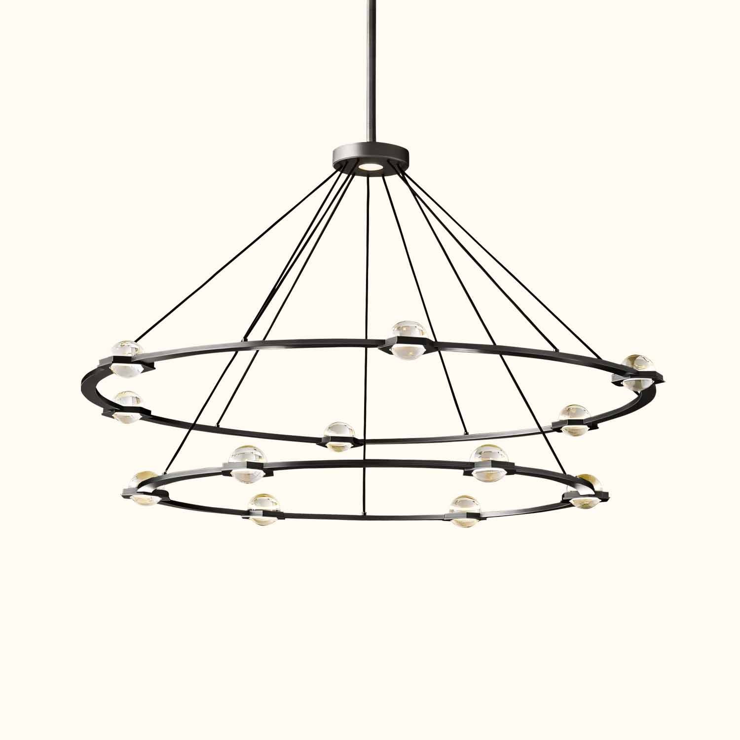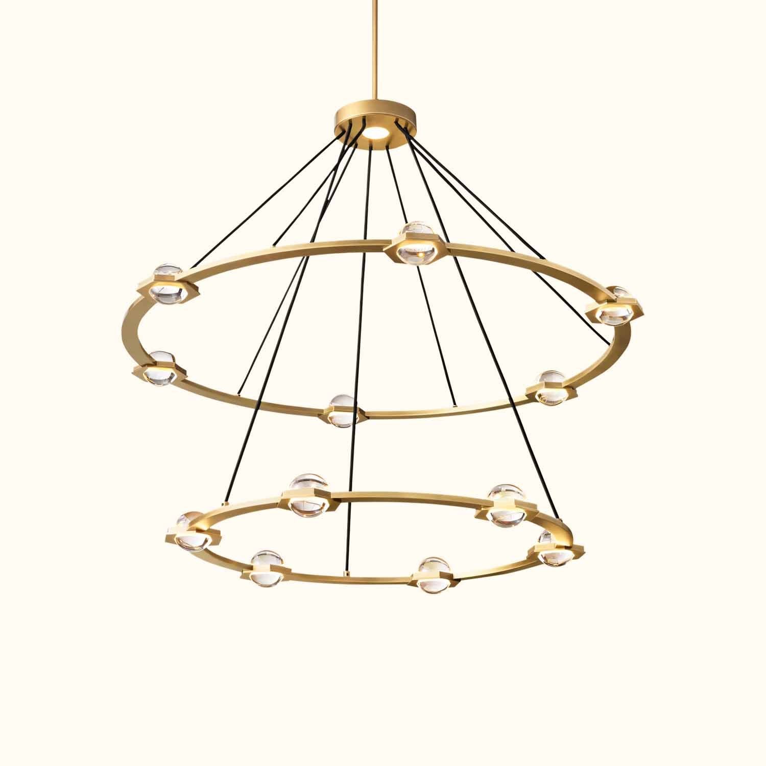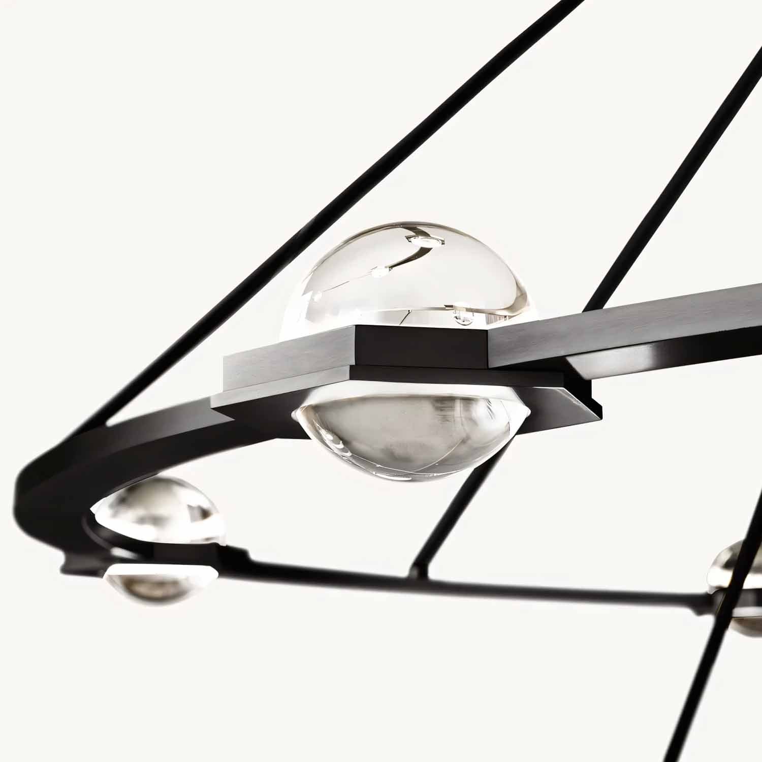 The Éclatant collection is spare and elemental, featuring illuminated crystal orbs suspended within hexagonal fittings, set in a flat metal frame. The design is inspired by 18th-century architectural drawings for a cenotaph—a tribute to physics that has been remarkably reinterpreted in a contemporary form.