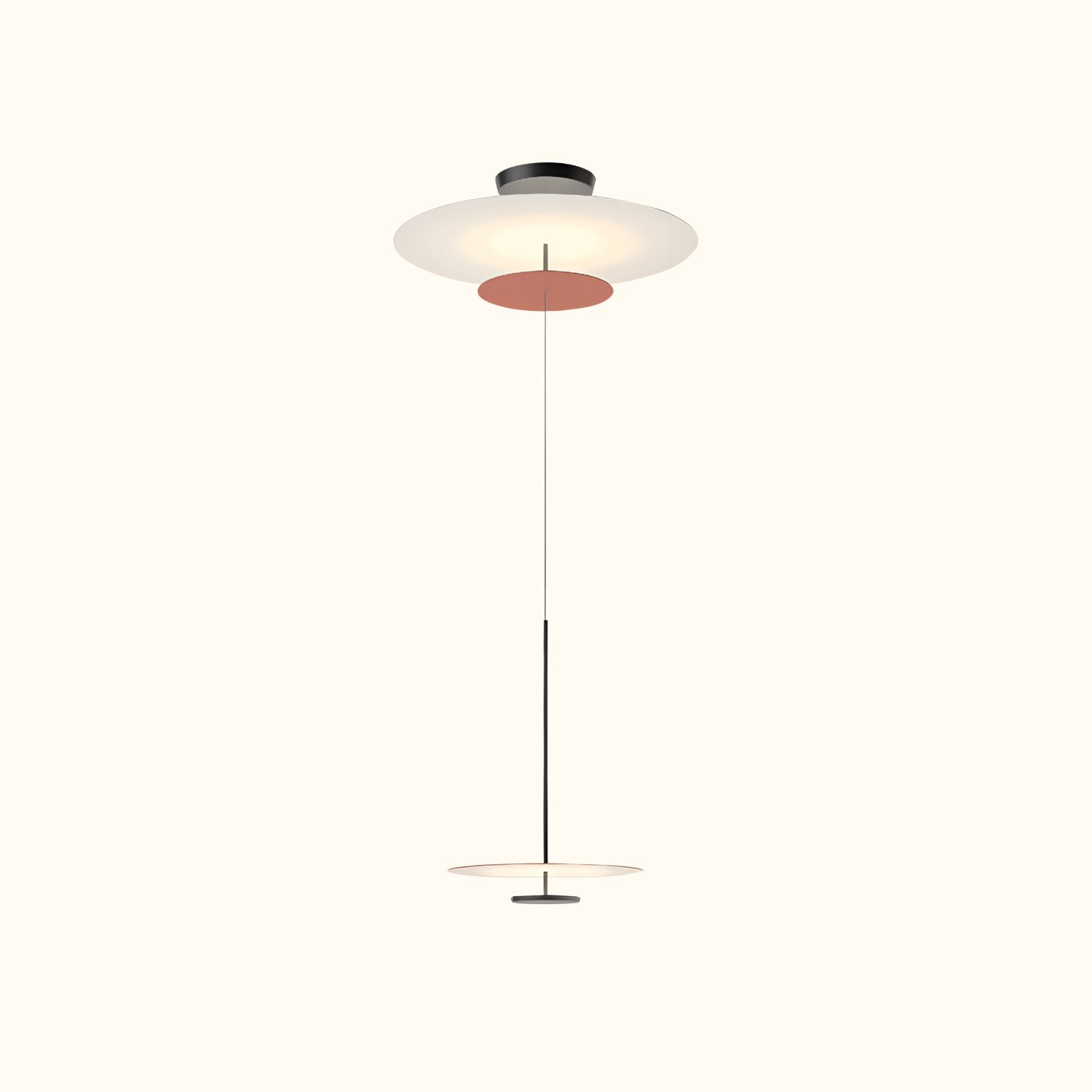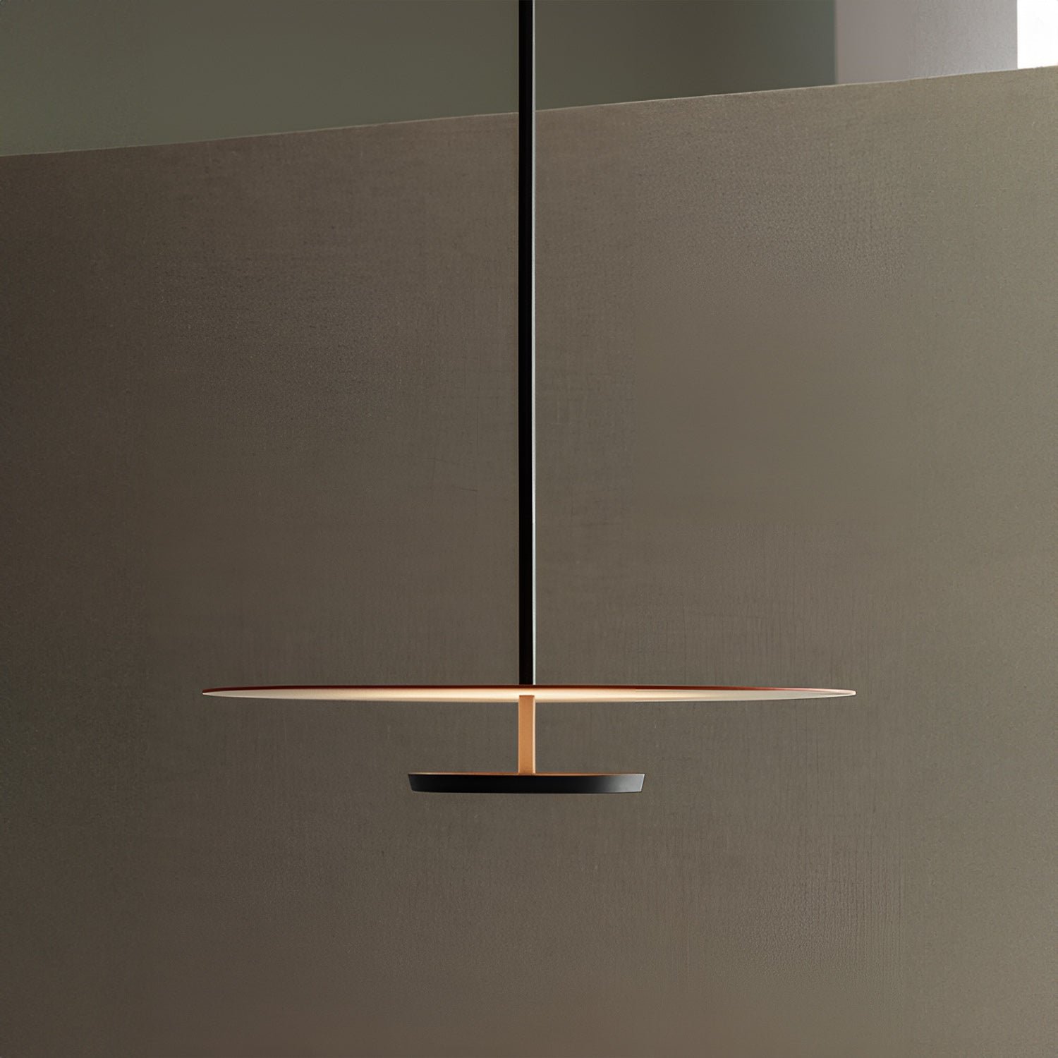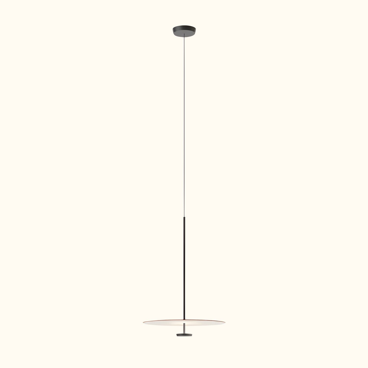 The Flat 5940 lamps are a creation by the designer. These disc-shaped lights descend from the ceiling to form a hanging lamp, where the planes of reflected light blend seamlessly with the architecture. All models in the Flat collection are equipped with LED lighting and are available in a range of neutral color tones.