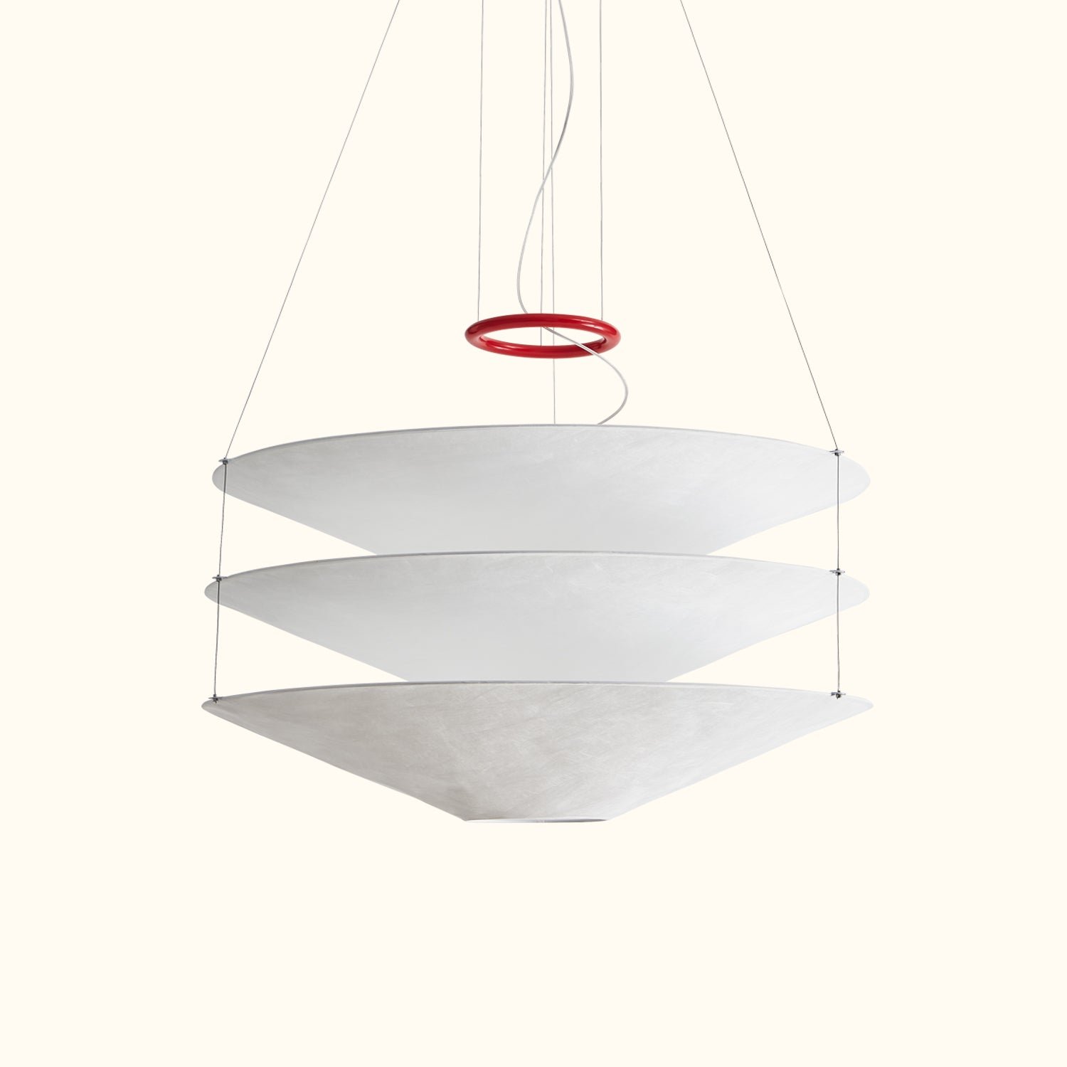 Designed in 1980, this suspension light features Japanese paper shades that create a warm, ambient glow. Three handcrafted shades are delicately suspended by thin metal cables, while a red iron ring serves as both a decorative accent and a counterweight for height adjustment. The shades are intentionally crinkled, allowing the paper to respond to changes in humidity, which can affect their rigidity.