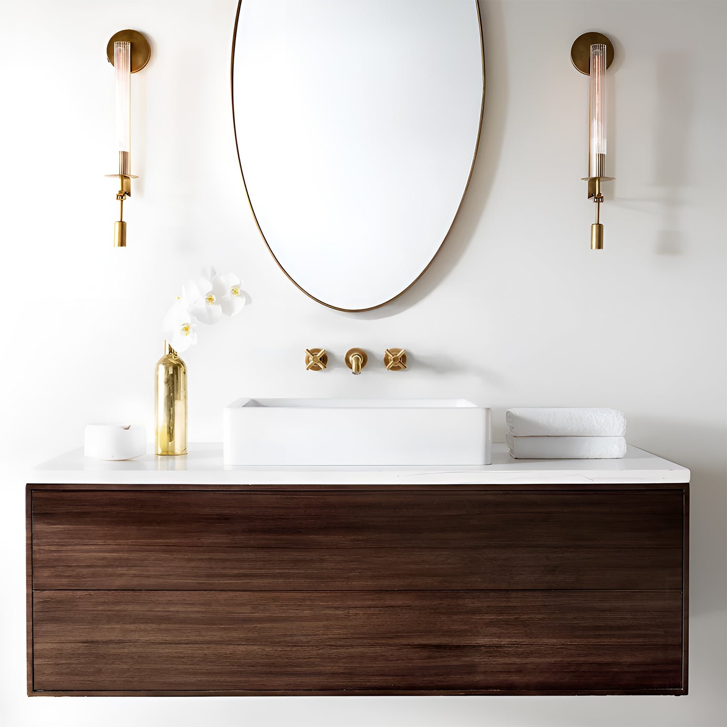 Designed by renowned lighting designer Jonathan Browning, our fixture captures the essence of 1940s French classicism. Made from solid brass, its minimalist architecture showcases Edison bulbs encased in ribbed glass cylinders, creating a shimmering effect reminiscent of candles.