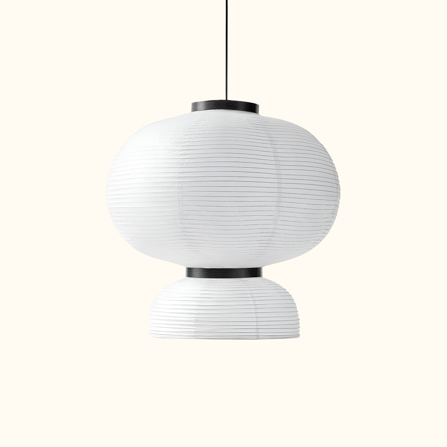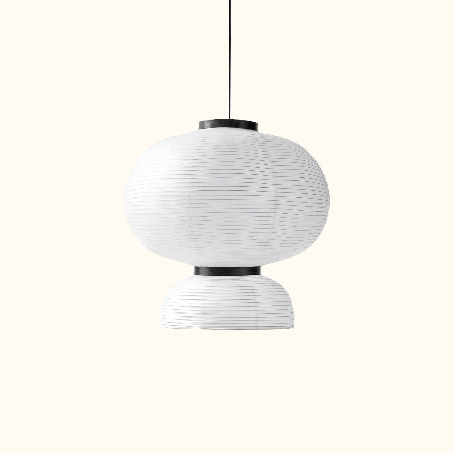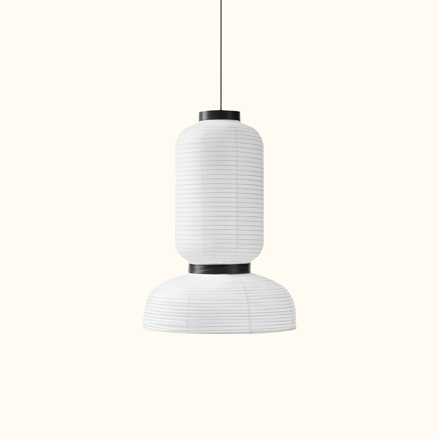 In Jaime Hayon’s designs, Eastern and Western cultures meet in a playful modern expression, where he skillfully reinterprets traditional Asian lanterns. Paper lanterns have a history spanning hundreds of years in Asia, widely present across various social classes, with different colors, shapes, and sizes representing different meanings. Here, Hayon discards cultural forms, presenting a series of entirely white light fixtures. The handcrafted fixtures are made from rice paper, combining various sizes and shapes. This series includes three different versions of lanterns and a table lamp, all adorned with ivory-white rice paper and black-stained oak.