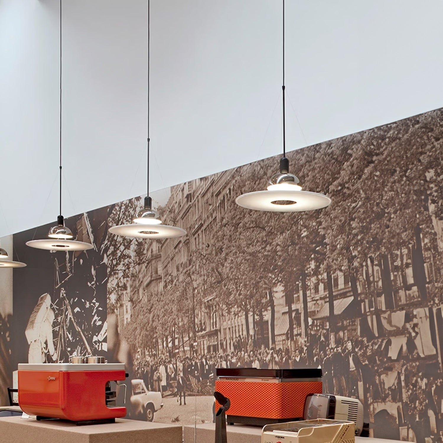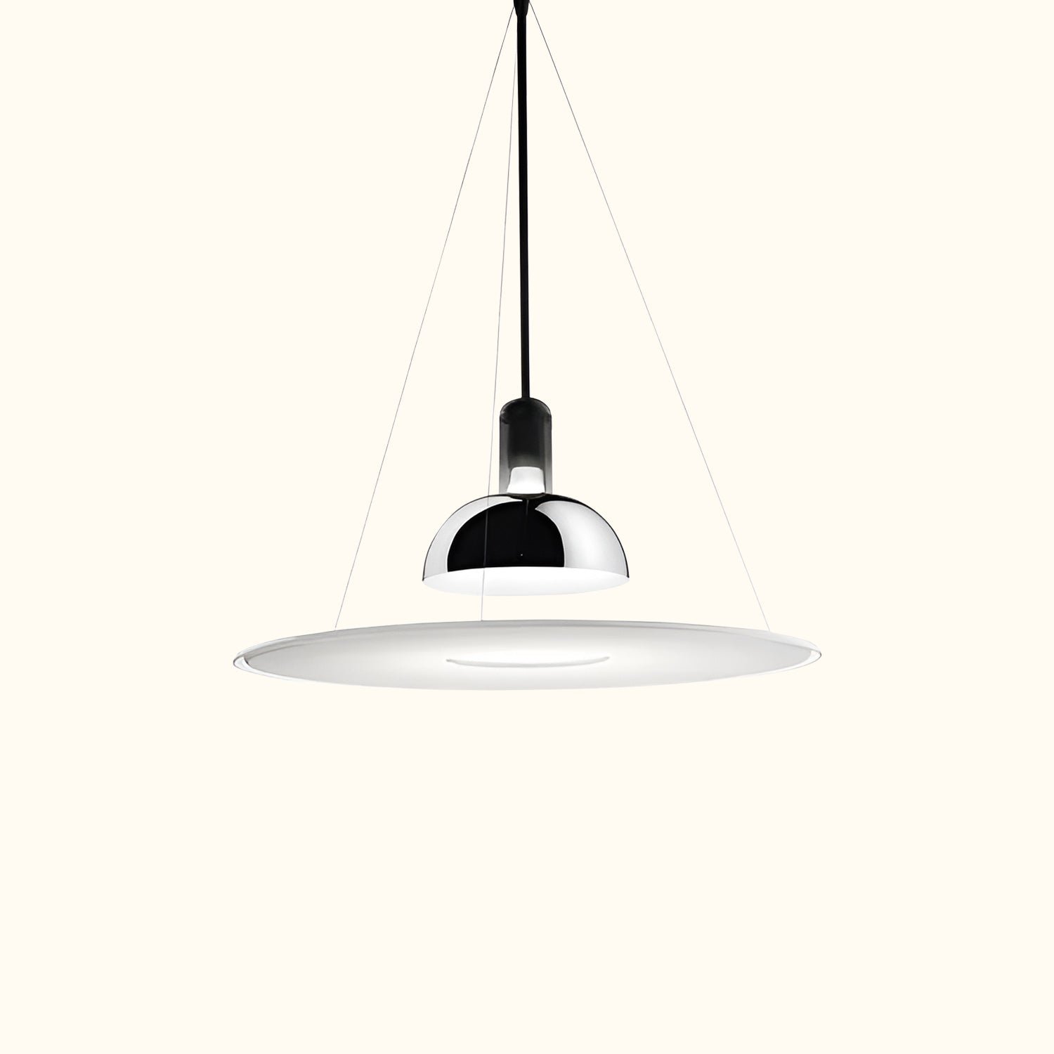 Frisbi is a suspension lamp that provides direct, diffused, and reflected light. The opaline polymethylmethacrylate (PMMA) injection-molded diffuser plate is suspended by three fine steel cables. The stamped sheet metal reflector is polished, nickel-plated, and coated with a protective varnish, with a gloss-white finish on the inside. The ceiling fitting and canopy of the lamp are made of black-painted, injection-molded ABS material.