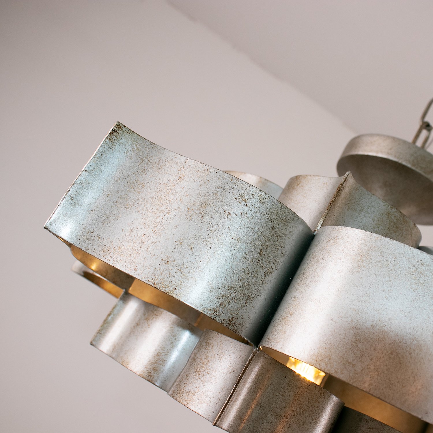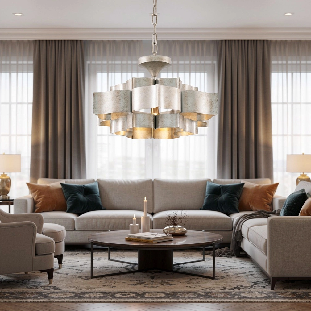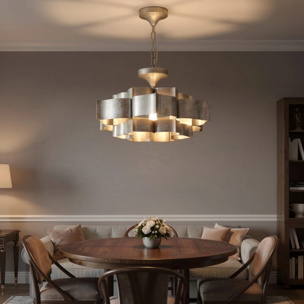 The Grand Lotus large silver chandelier has a solemn appearance and exquisite craftsmanship, featuring an antique silver leaf finish that is both elegant and sophisticated. This silver chandelier is meticulously crafted from wrought iron.