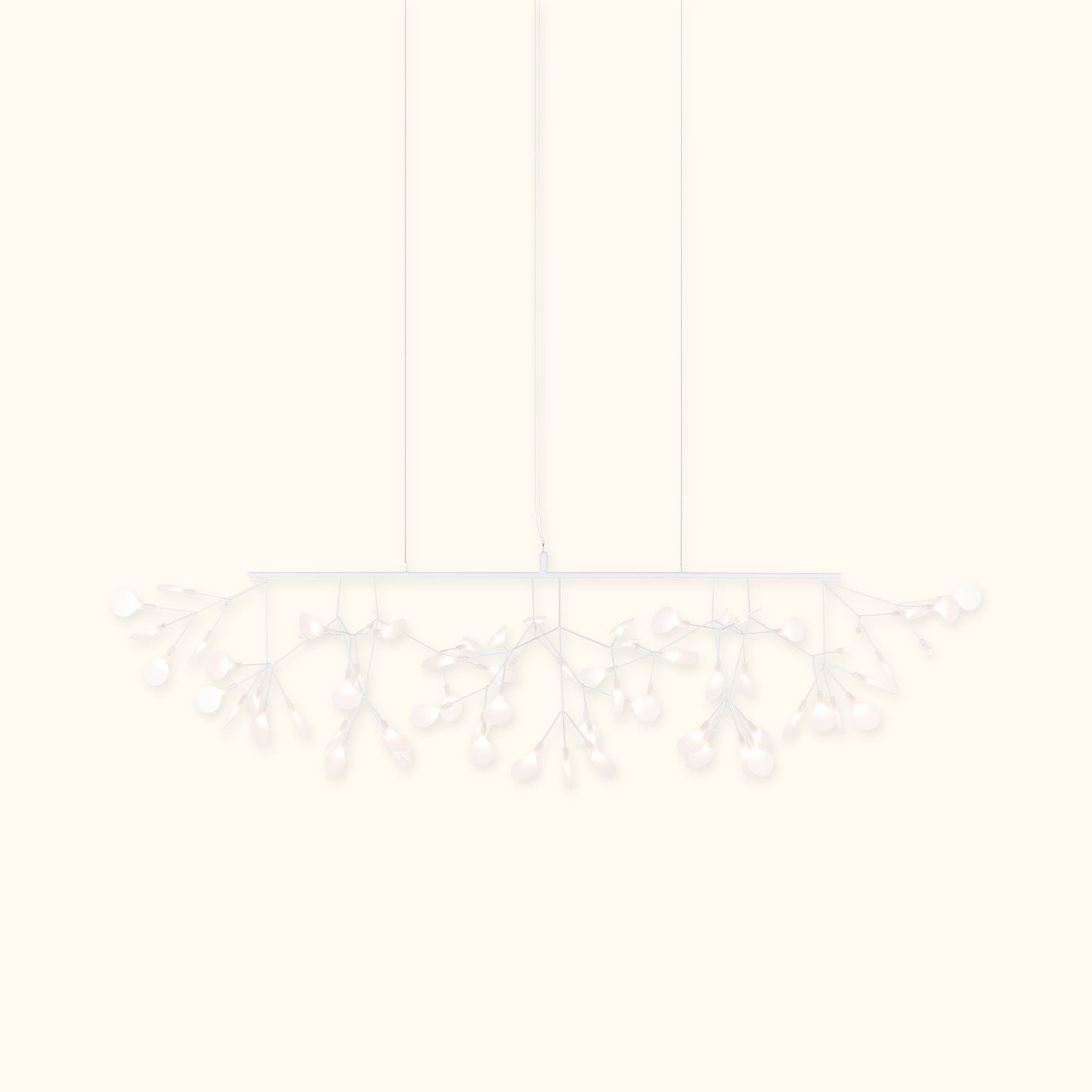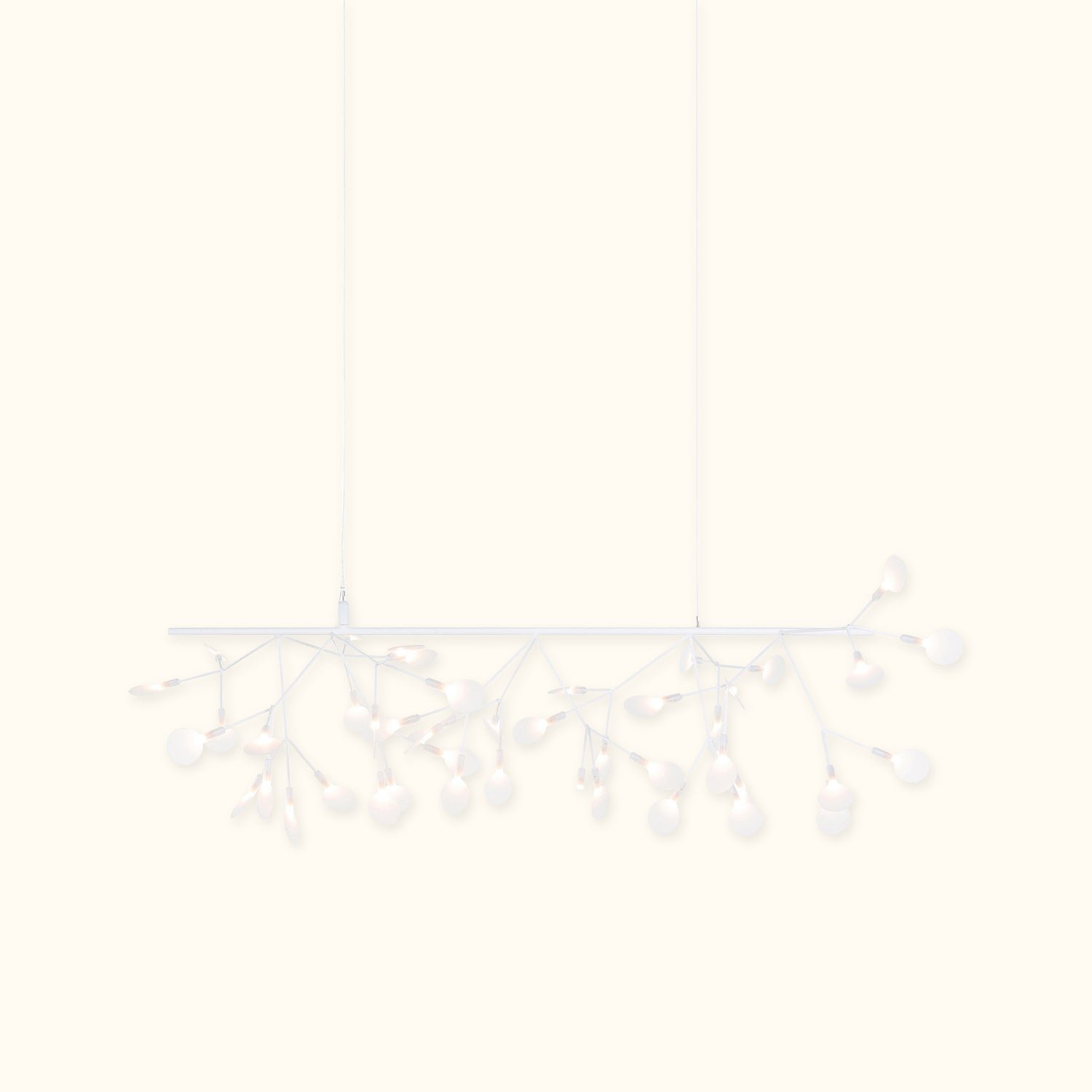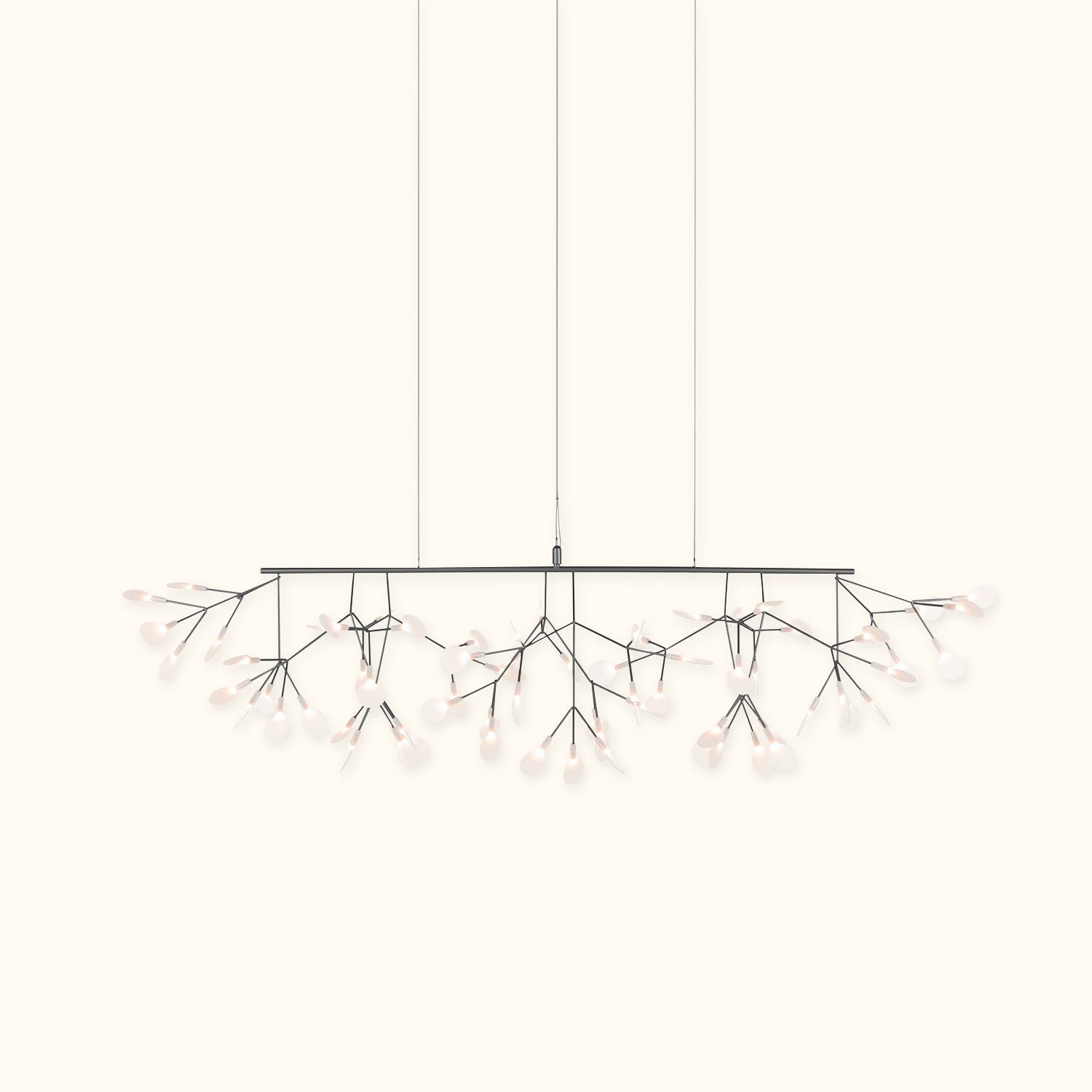 The design of this series combines nature and technology. This lightweight LED light is inspired by the Heracleum plant. The white leaves branch off from a single stem, creating a highly technical natural structure. The branches of this family are always in bloom and almost limitless in their arrangement. They branch off in straight lines, hanging in circular formations, and forming square geometric shapes.