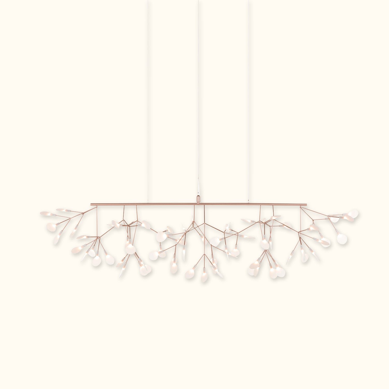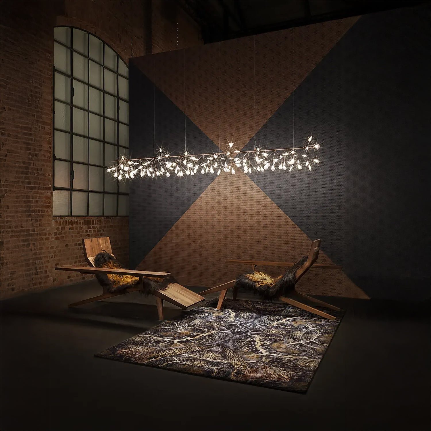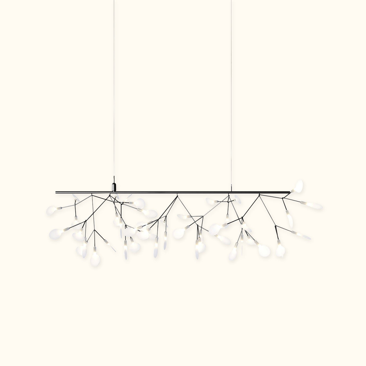 The design of this series combines nature and technology. This lightweight LED light is inspired by the Heracleum plant. The white leaves branch off from a single stem, creating a highly technical natural structure. The branches of this family are always in bloom and almost limitless in their arrangement. They branch off in straight lines, hanging in circular formations, and forming square geometric shapes.