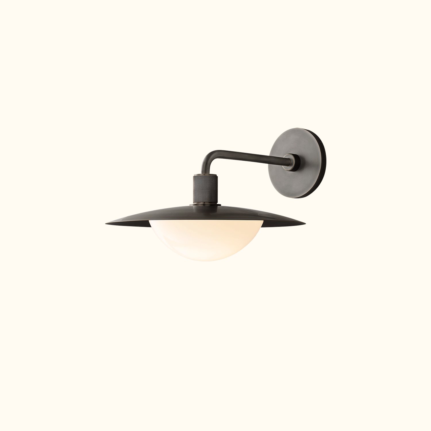 The designer’s interpretation of the traditional barn light celebrates the minimalist aesthetics of medieval design. Smooth lines coexist with luxurious materials, while the solid brass structure and knurled details highlight its industrial roots. In contrast, the milky white glass shade gently diffuses light, emitting a warm glow when illuminated.