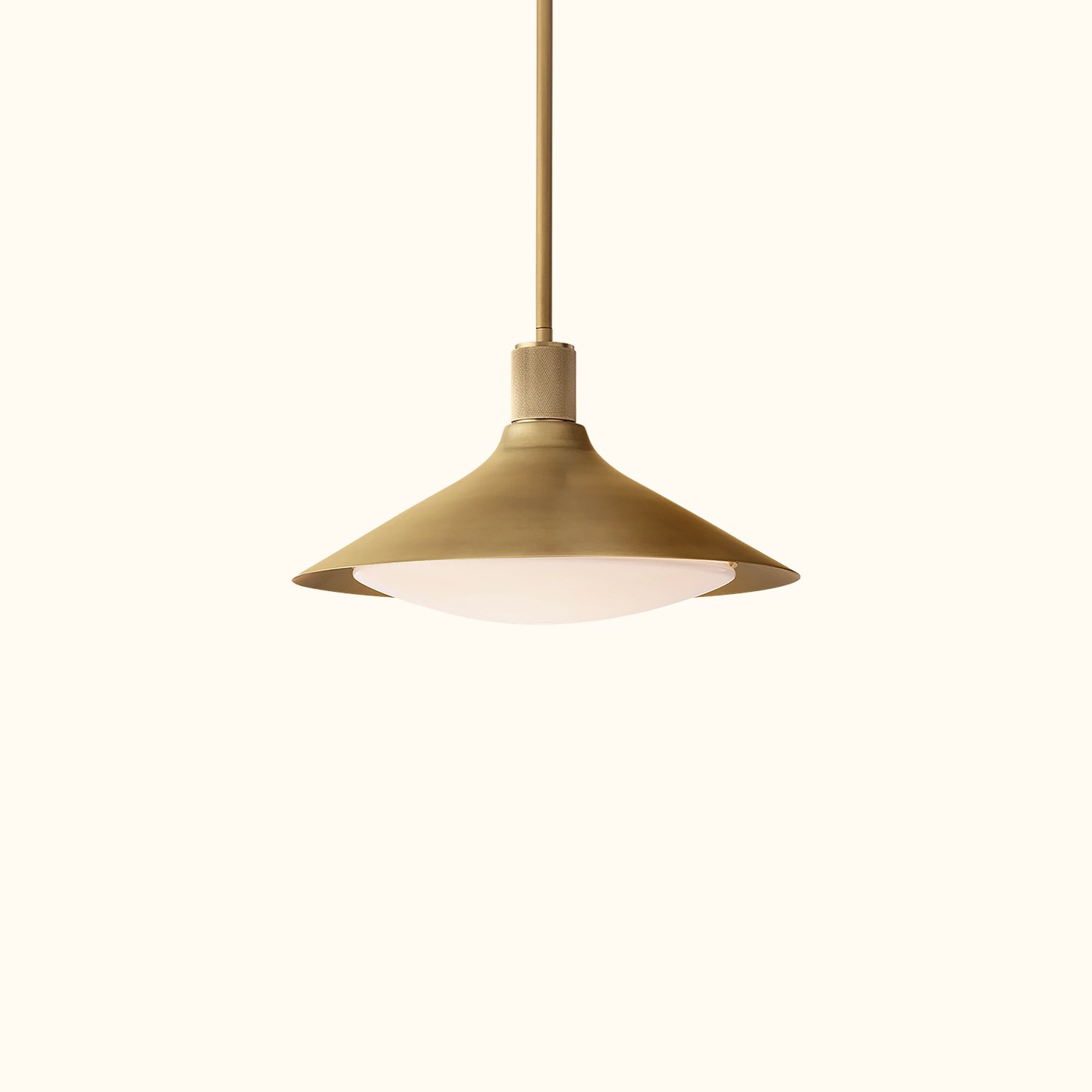 The interpretation of the traditional barn light celebrates the minimalist aesthetics of medieval design. Smooth lines coexist with luxurious materials, while the solid brass structure and knurled details highlight its industrial roots. In contrast, the milky white glass shade gently diffuses light, emitting a warm glow when illuminated.