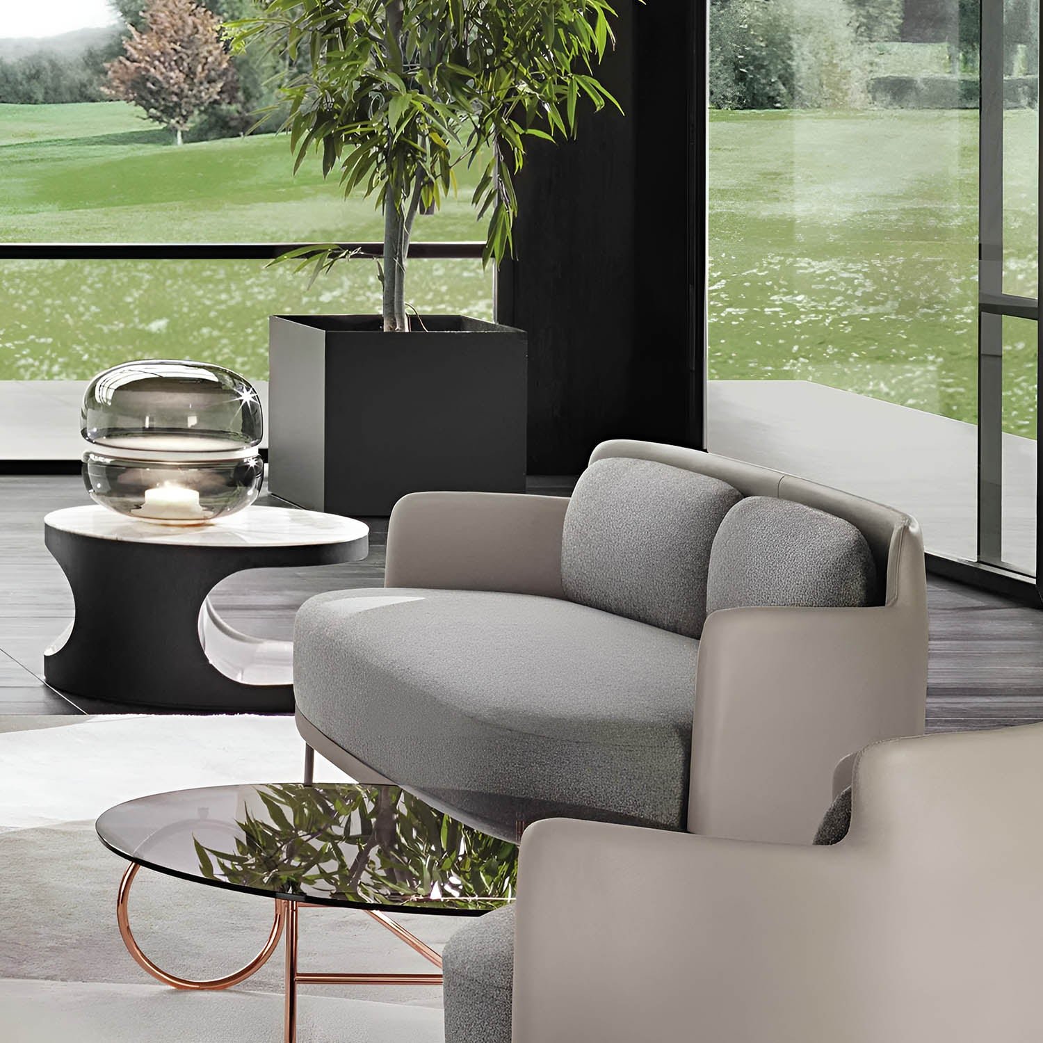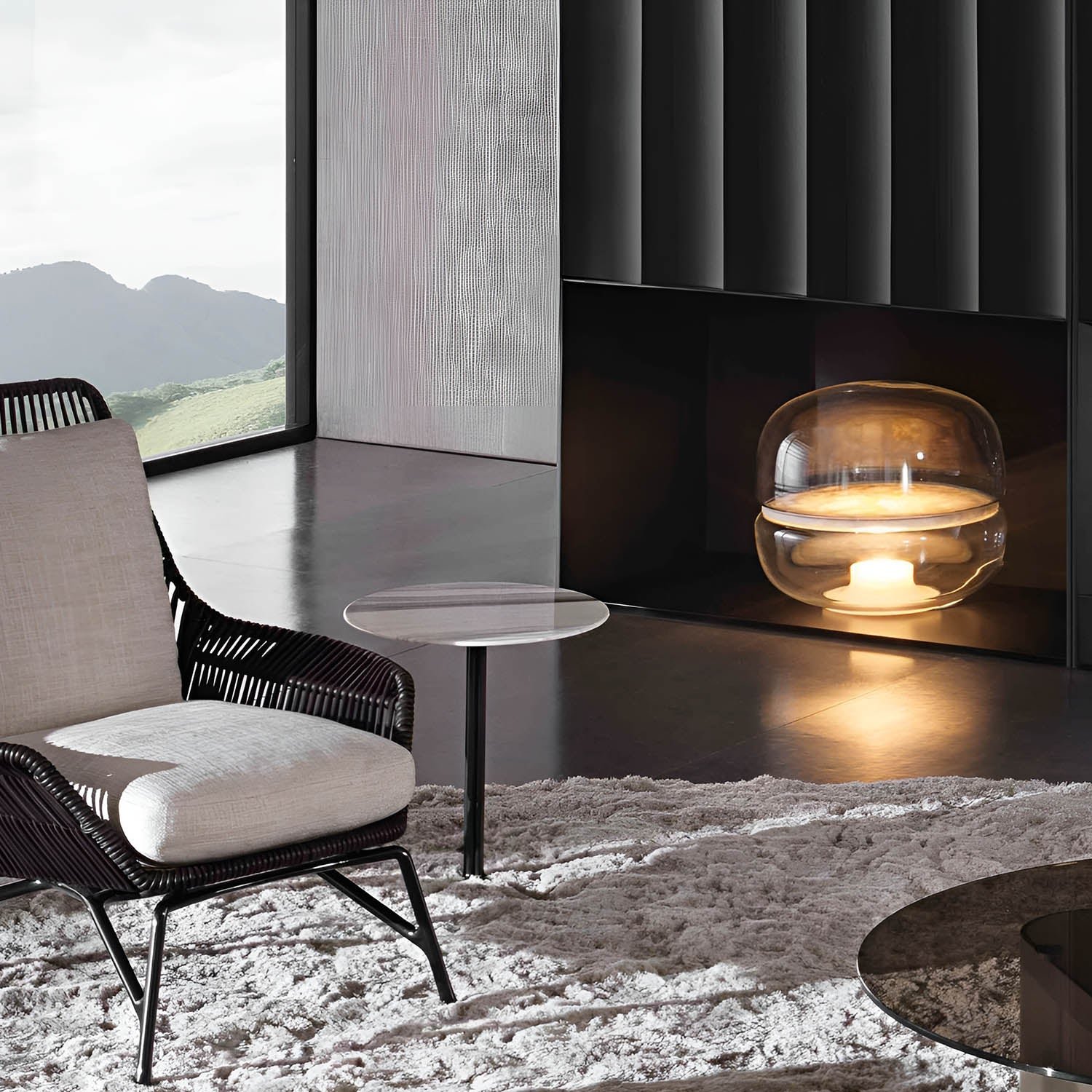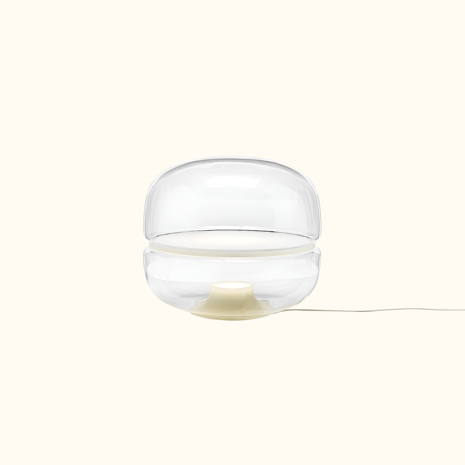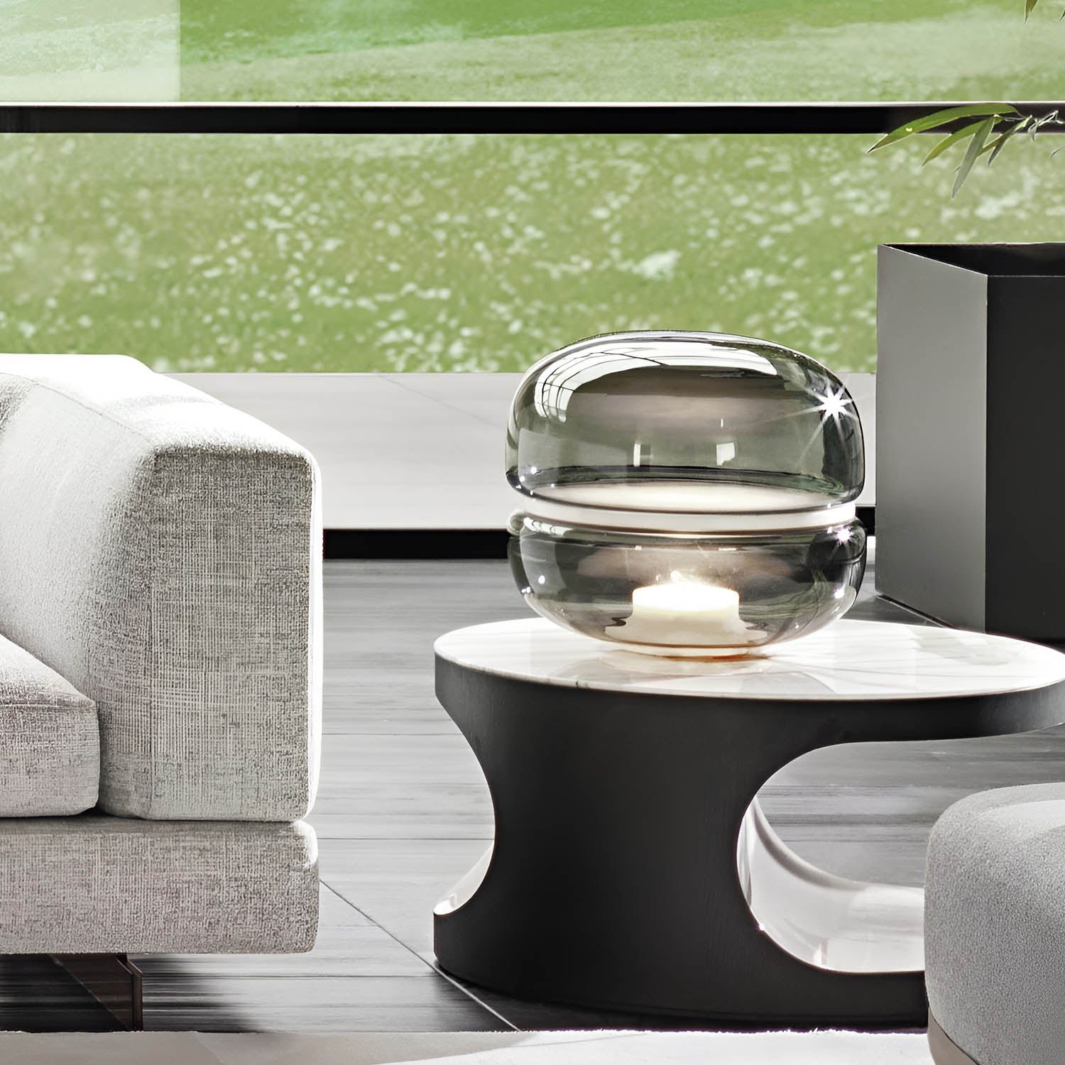 The Macaron table lamp pays homage to the beauty and complex structure of crystalline stone. The stone is enclosed within two symmetrical, hand-blown glass domes, resembling a moonscape floating in its own universe. The light source shines upward from the onyx base, enhancing the intricate chalcedony veins in the central onyx plate and creating a delicate and mesmerizing lighting effect. The design concept is based on the principle of illuminating stone, and the name comes from its resemblance in shape to the famous French meringue confection, the macaron. Natural imperfections in the glass and the diversity of stone structures make each lamp a unique original. The purity of natural materials, combined with the artisans’ exquisite craftsmanship, has resulted in a lamp with extraordinary ambiance. Produced using traditional techniques, Macaron embodies the distinctive and enduring aesthetic of the BROKIS brand. Macaron comes in three sizes—the largest of which also serves as an attractive floor lamp—and offers several glass color options with either white or honey onyx. Additionally, the collection includes an alternate version featuring a central plate made of BROKISGLASS combined with a wooden base.