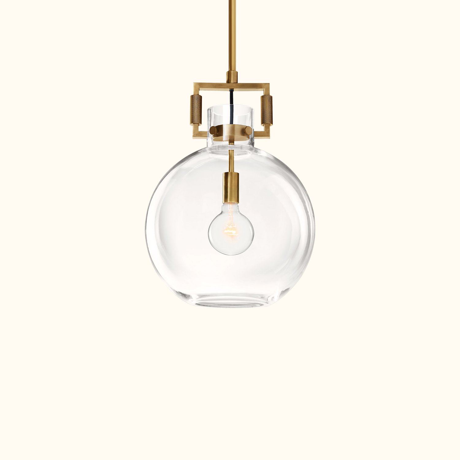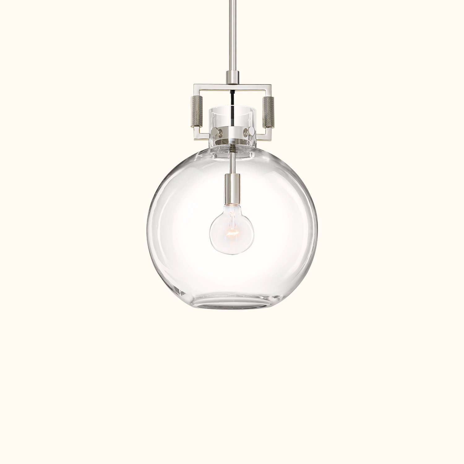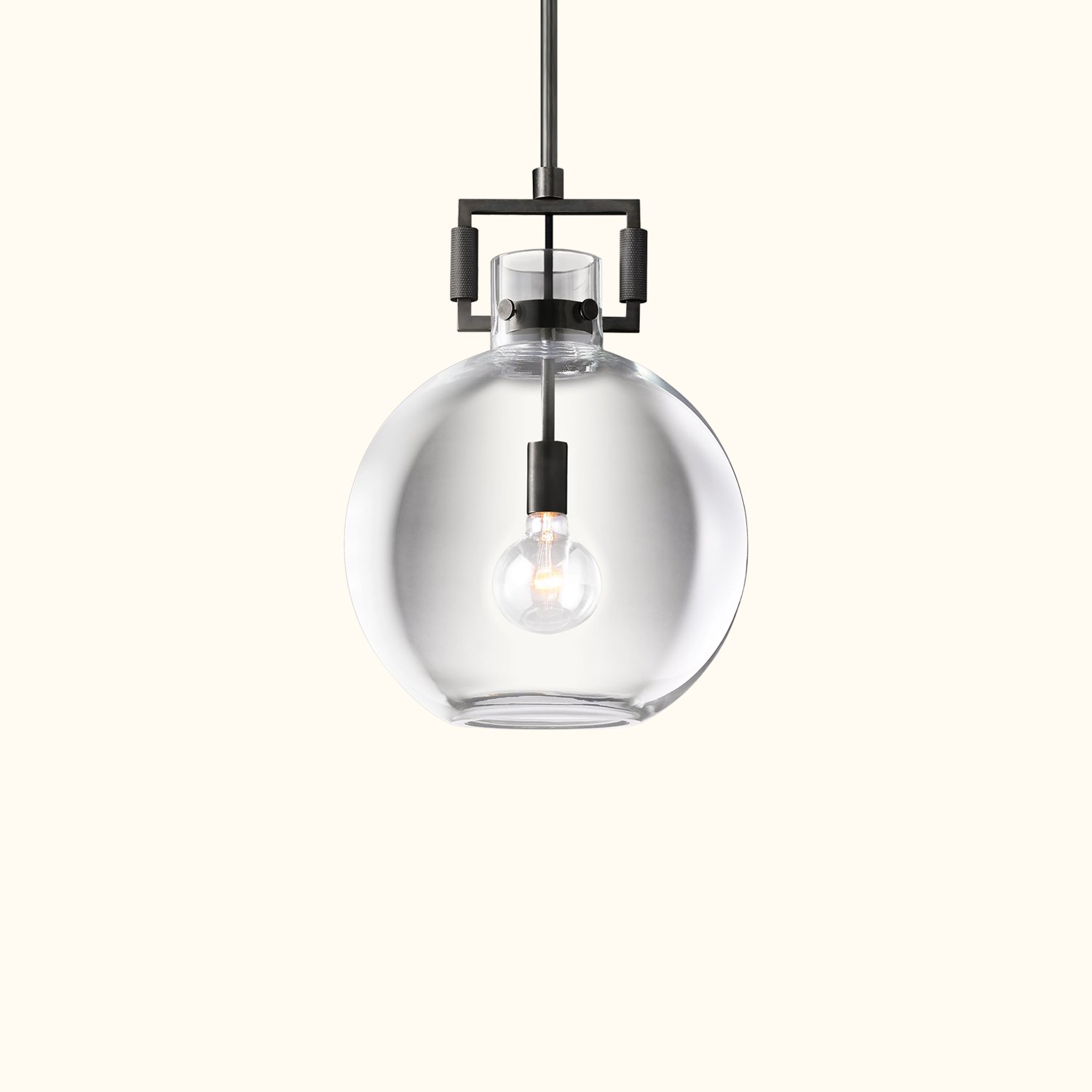 Our machinist chandelier is an exploration of positive and negative space, density and openness, strength and fragility — a study of balance and duality. The geometric frame, crafted from solid metal, showcases an industrial aesthetic. In striking contrast, the surrounding transparent glass almost disappears, echoing the form of the shade. Within the shade, an ultra-thin Edison bulb radiates a brilliant glow.