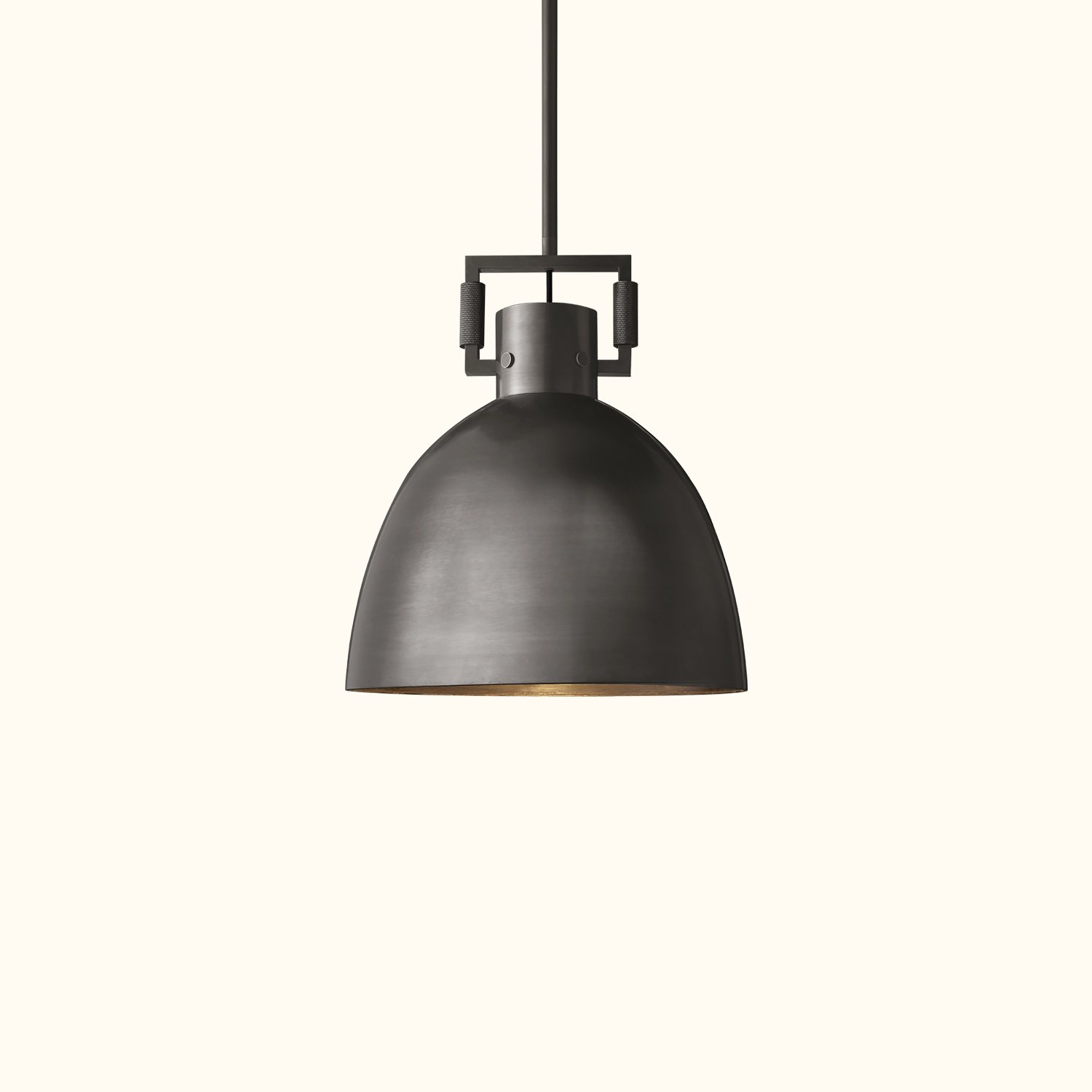 Our machinist chandelier is inspired by the functional lighting fixtures used in mid-20th century workshops and factories, enhancing practicality. The classic dome-shaped shade blends traditional and modern elements, secured by a sleek geometric metal frame. Its craftsmanship is highlighted by clean angles, diamond knurling, and exposed bolts.