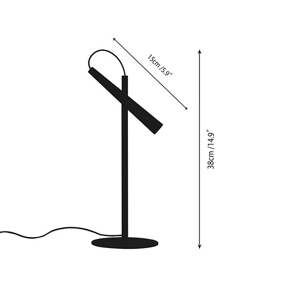A table lamp with direct lighting. The diffuser is made of batch-dyed ABS, featuring integrated LED, an epoxy powder-coated steel base, and a rotating rod. The “super magnet” is spherical and is formed by combining “rare earth” with thermoplastic elastomer, serving as a joint that allows you to guide the torch and slide it vertically along the rod. The black cable is equipped with an ON/OFF switch and extends visibly along the inside of the rod. It comes with personalized packaging.