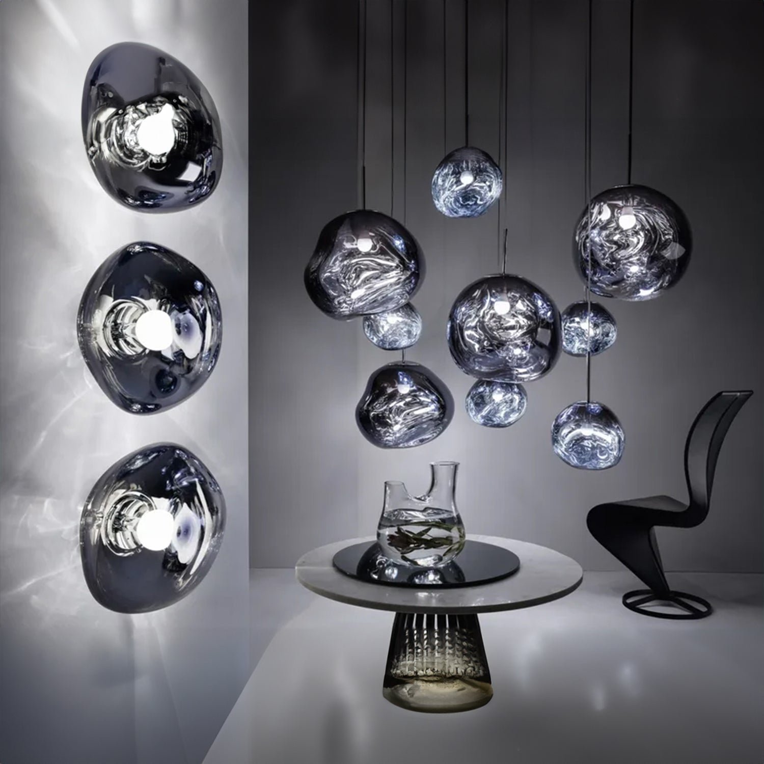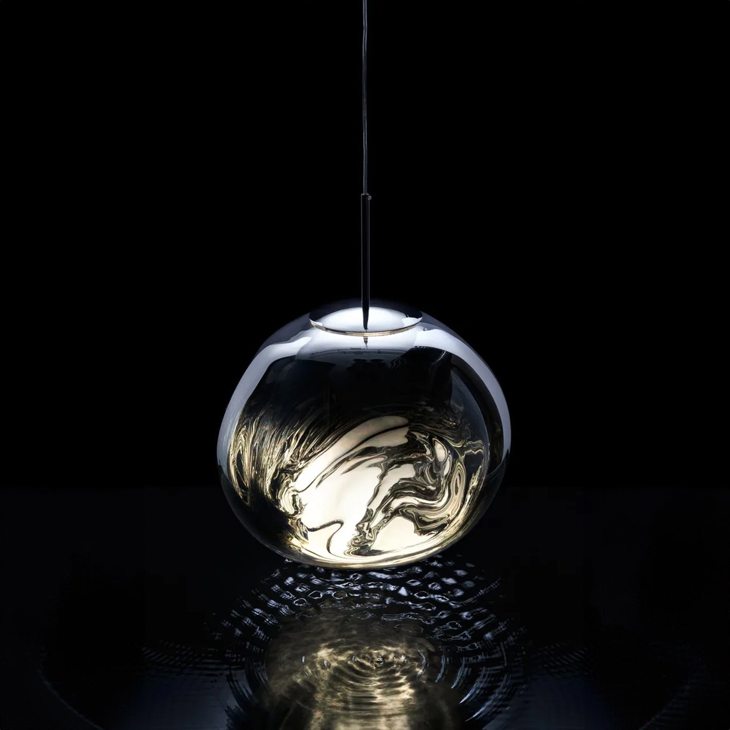 The Melt Mini is a refined pendant light with a sleek smoked finish and a matching ceiling rose. It features a built-in LED module that creates a distinctive molten glass effect when lit, and a mirrored reflection when turned off. Manufactured in China, this lighting fixture utilizes advanced craftsmanship to perfectly capture the molten sphere design.