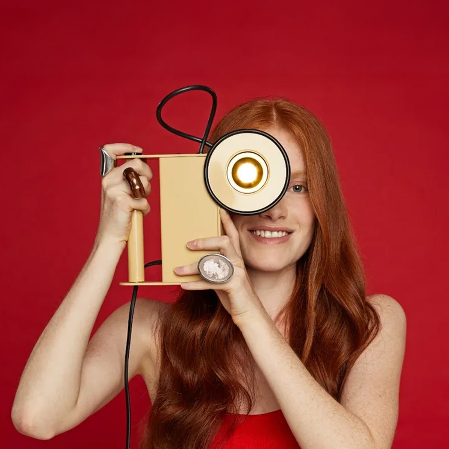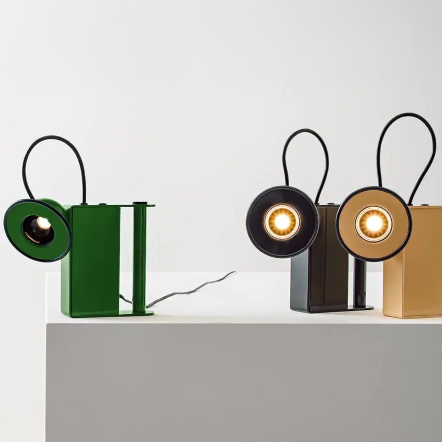 This is a table lamp with a metal body finished in bright white, black, coffee, green, or red. It features a metal directional head with a magnetic coupler and a dimmable topLED light source.