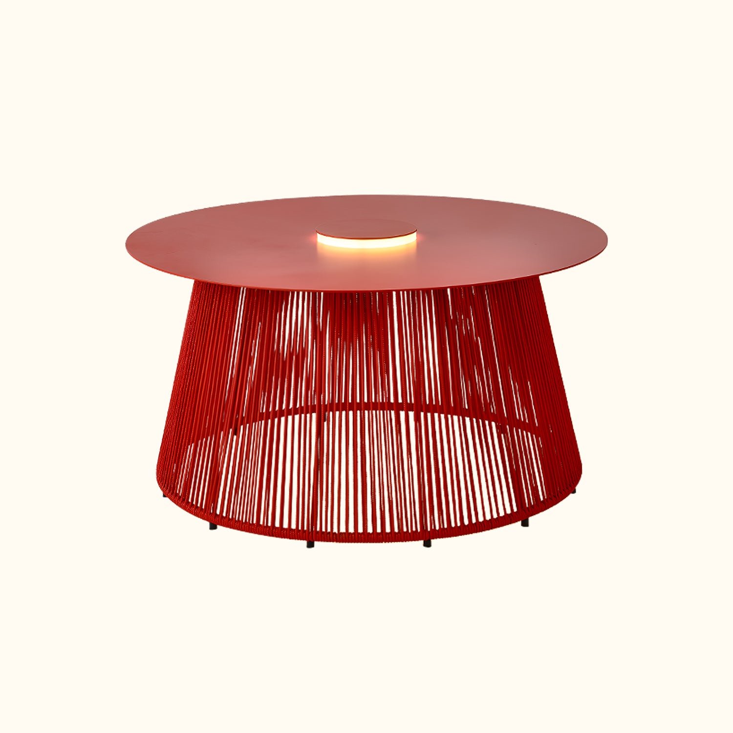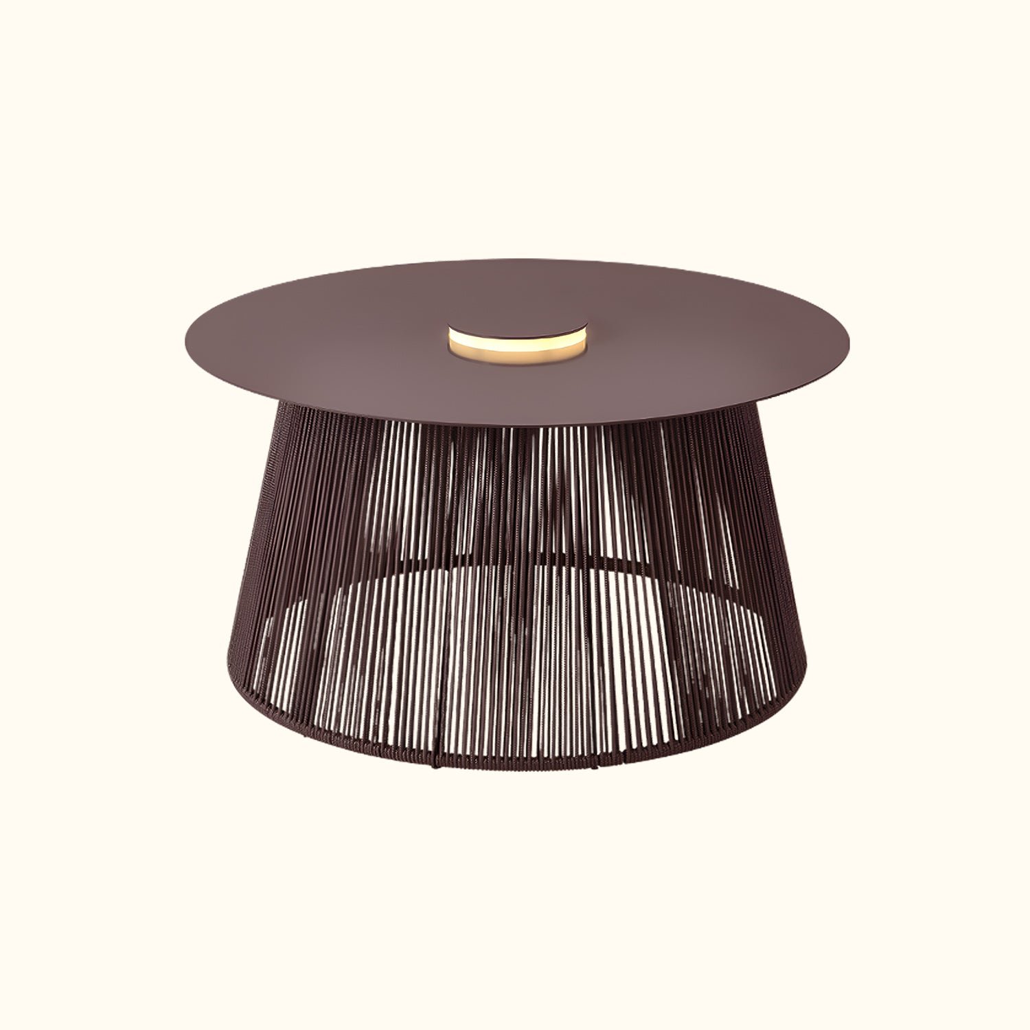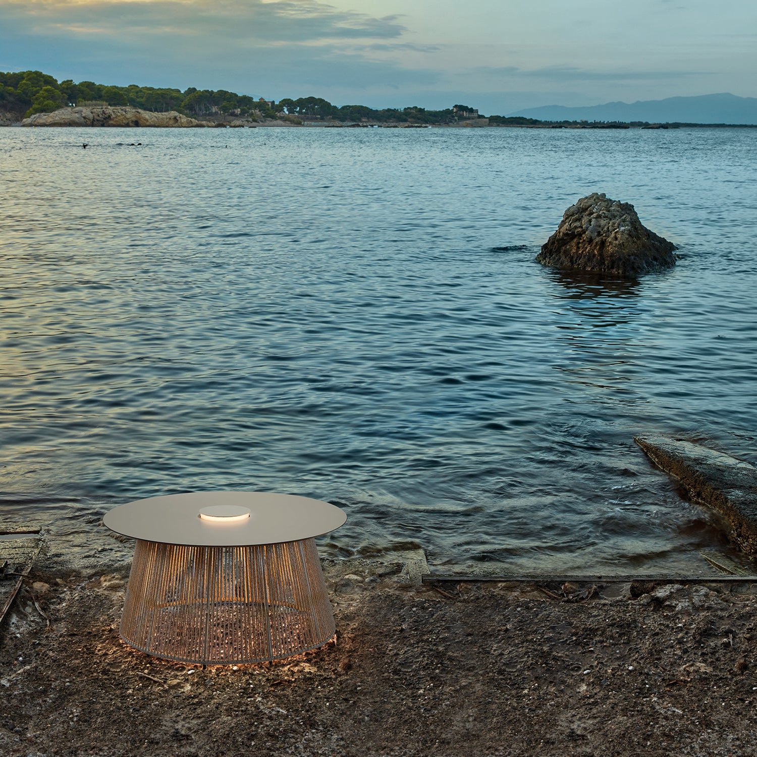 A circular surface appears to float above an illuminated base, seamlessly integrating light without taking up usable space, and casting a soft glow around it. This battery-powered lamp emits light both upwards and downwards. The upper light subtly emerges, casting a gentle glow over the tabletop to reveal objects in the dark. The light source is encased within the metal structure, indirectly illuminating the hand-woven screen made from nautical cord or synthetic rattan.